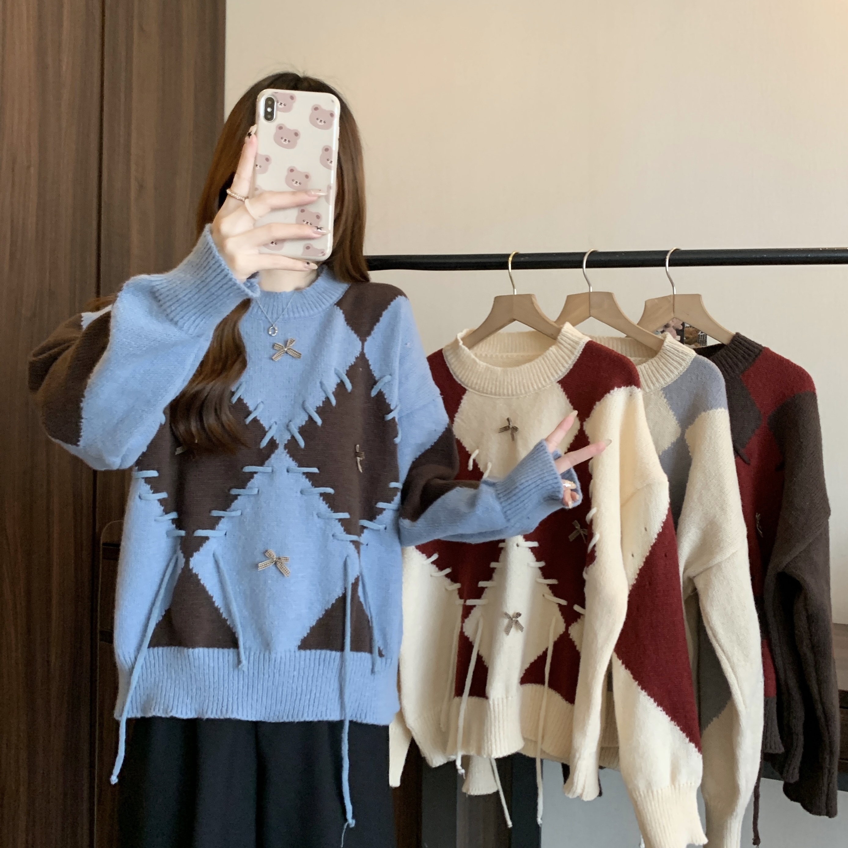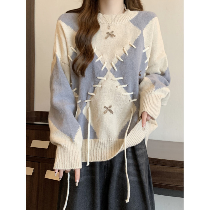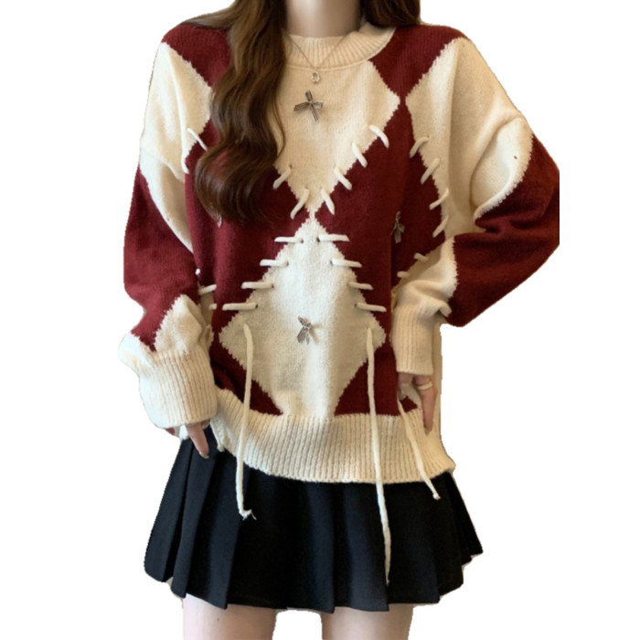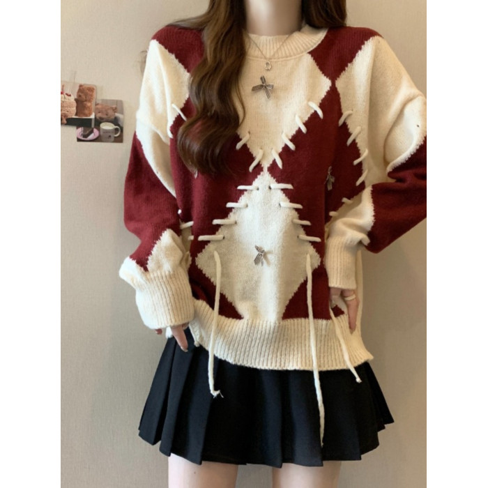 學院風復古紅色菱格毛衣女秋季新款大碼胖mm寬松顯瘦美拉德針織衫