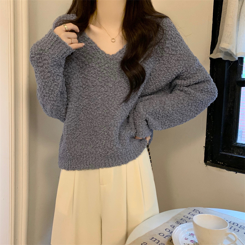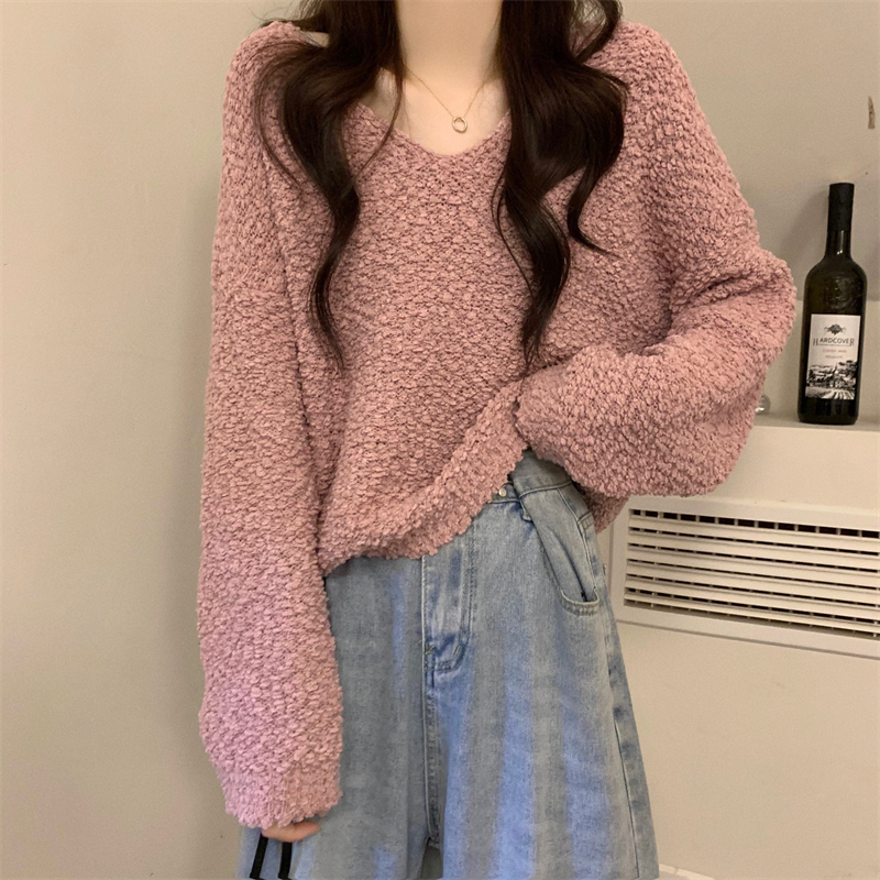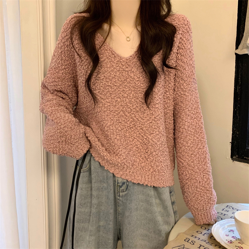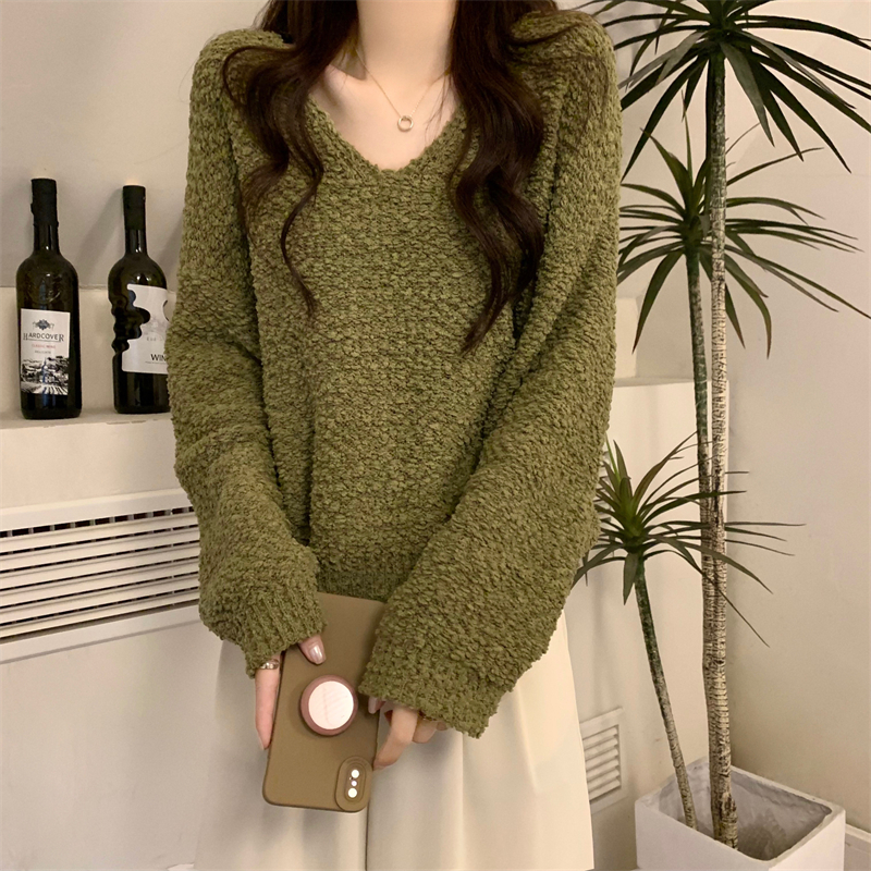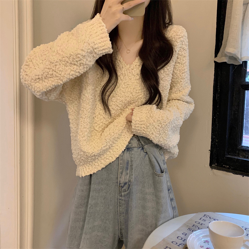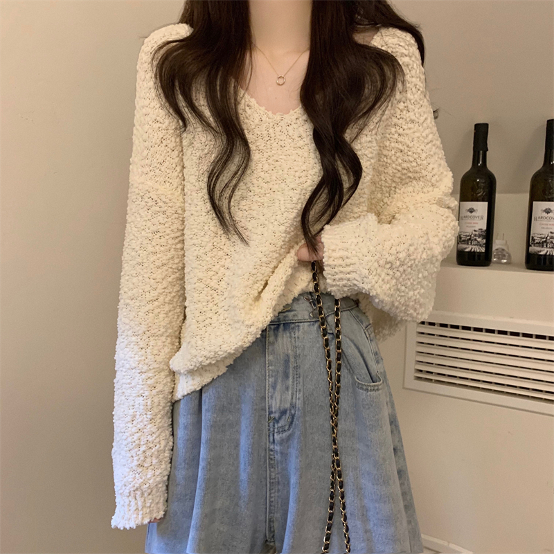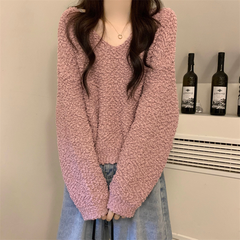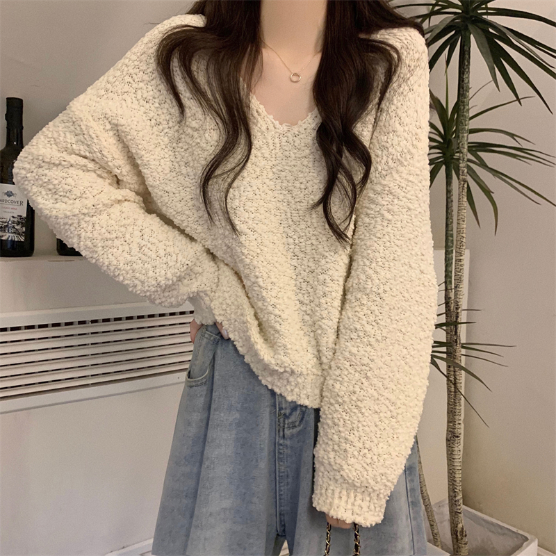 慵懶風V領針織毛衣女裝早秋外穿寬松顯瘦套頭百搭長袖上衣小個子