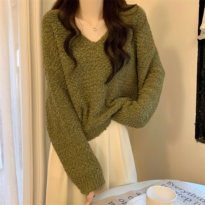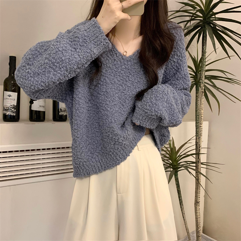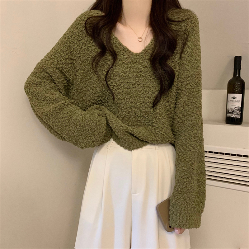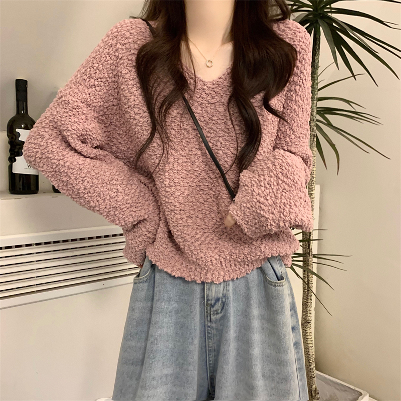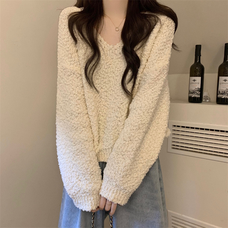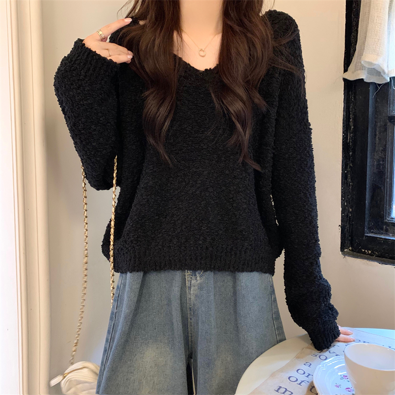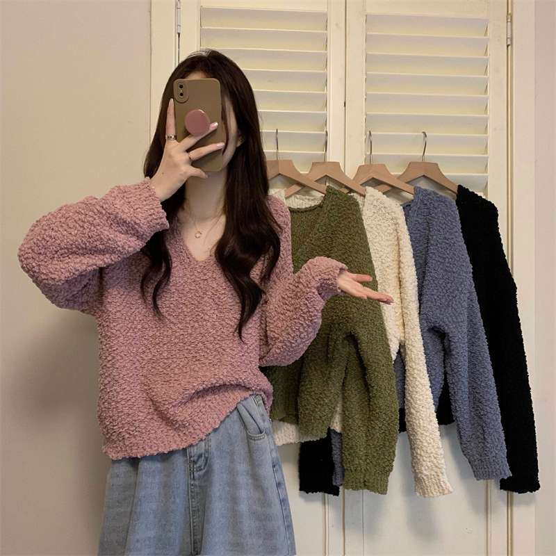 慵懶風V領針織毛衣女裝早秋外穿寬松顯瘦套頭百搭長袖上衣小個子