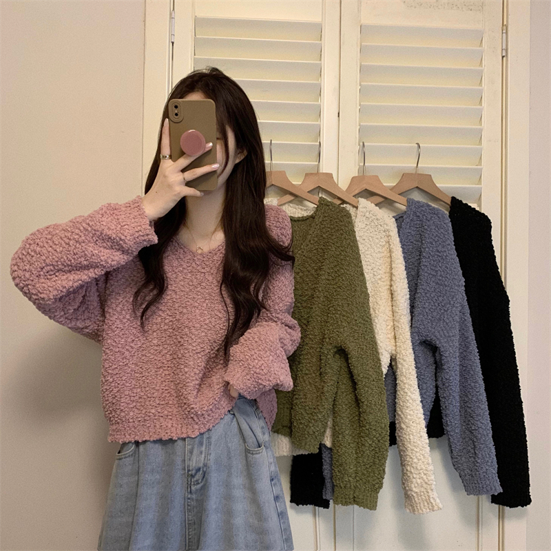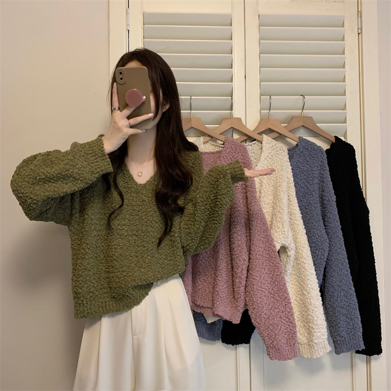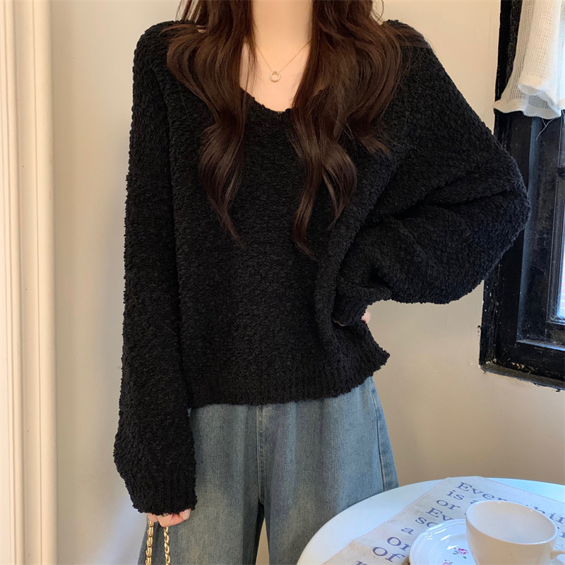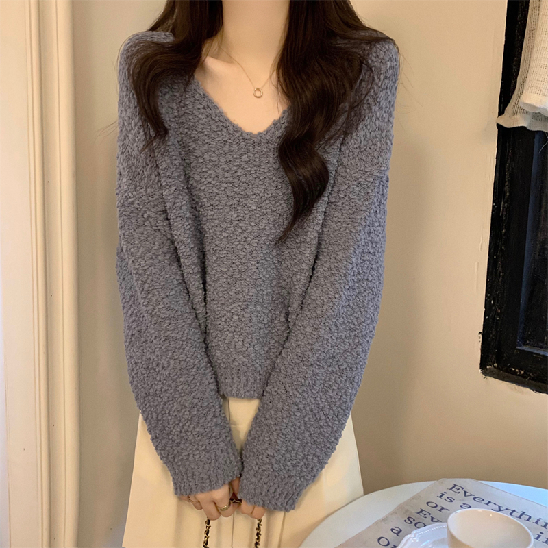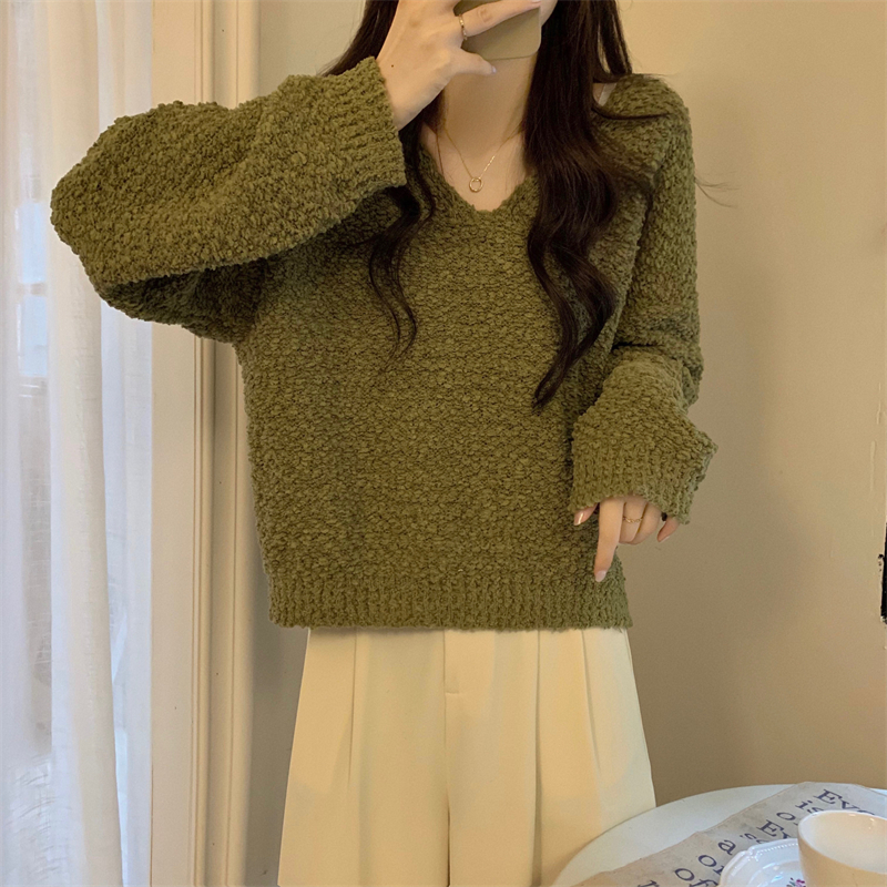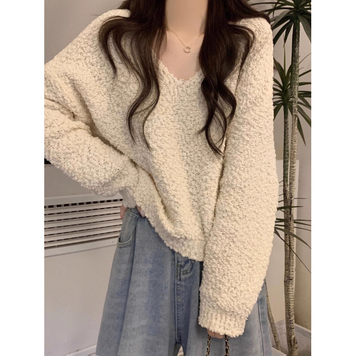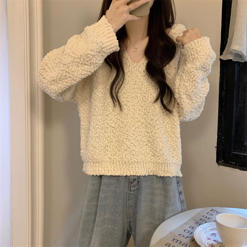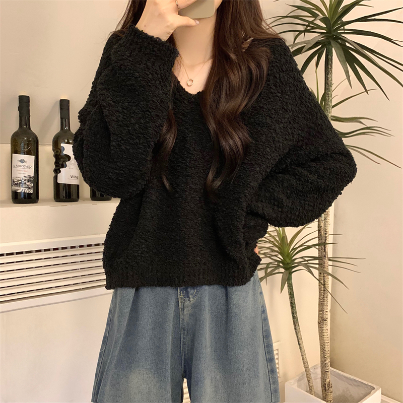 慵懶風V領針織毛衣女裝早秋外穿寬松顯瘦套頭百搭長袖上衣小個子