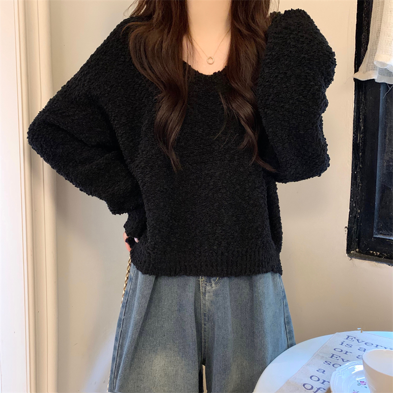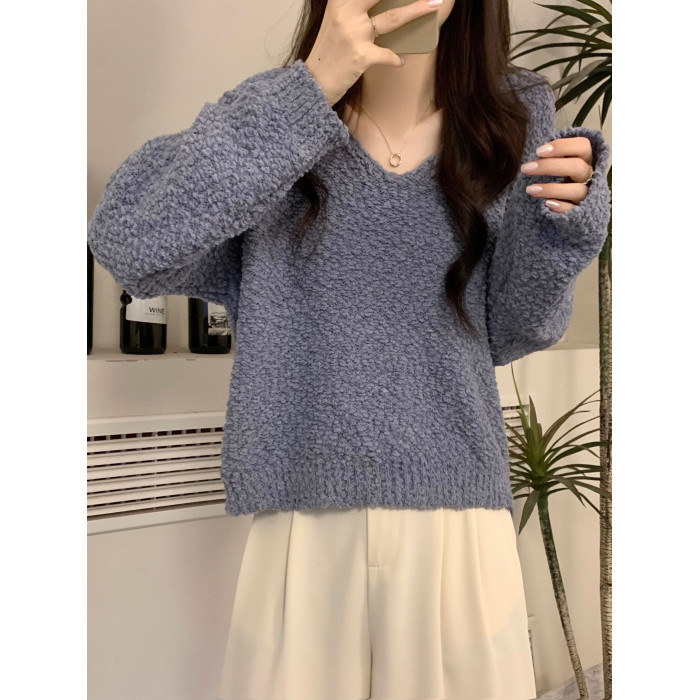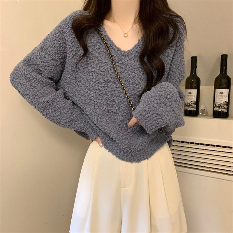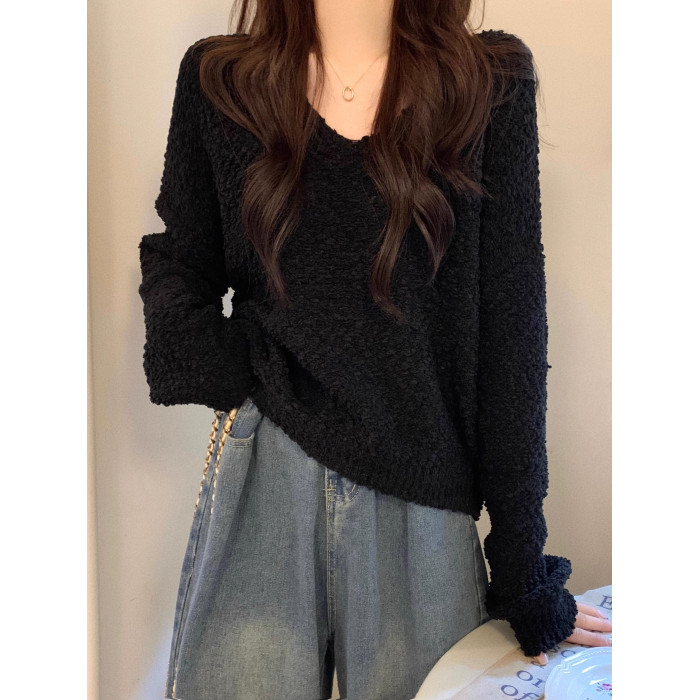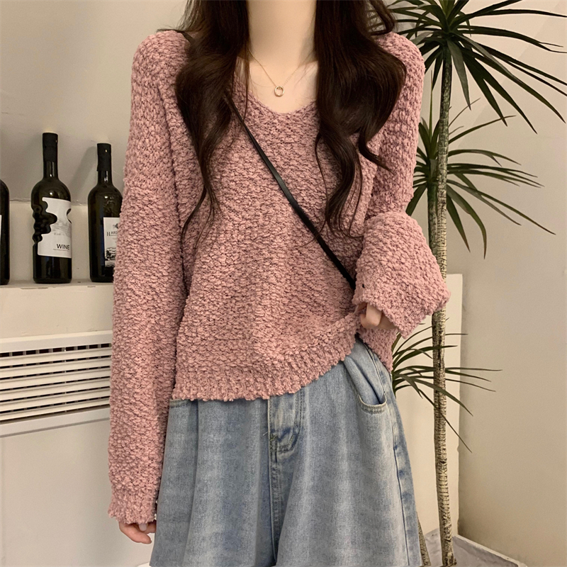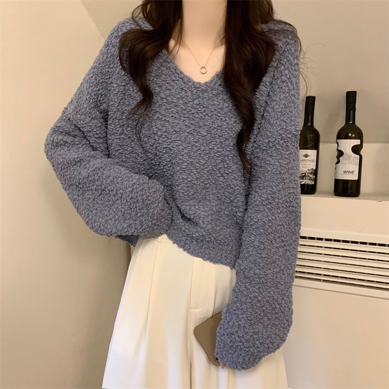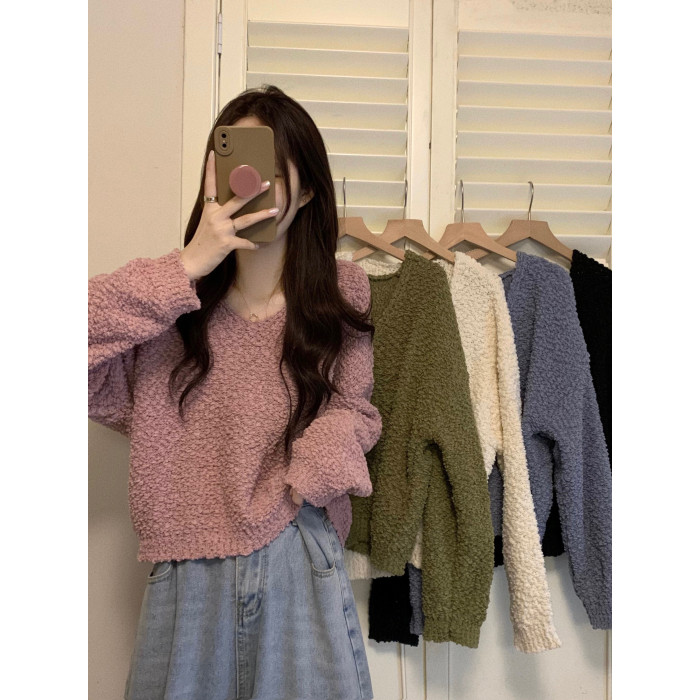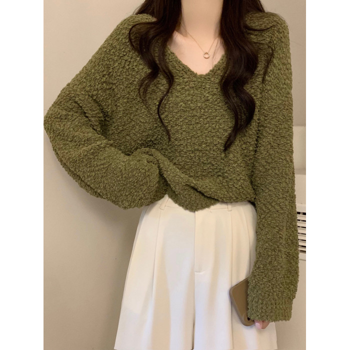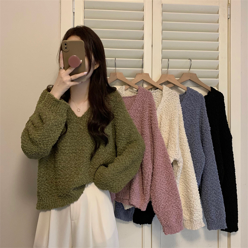 慵懶風V領針織毛衣女裝早秋外穿寬松顯瘦套頭百搭長袖上衣小個子