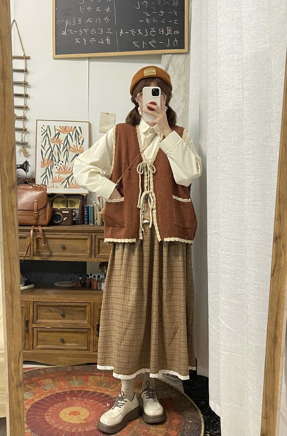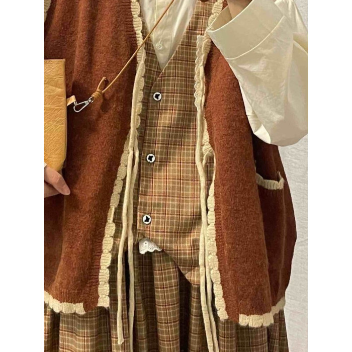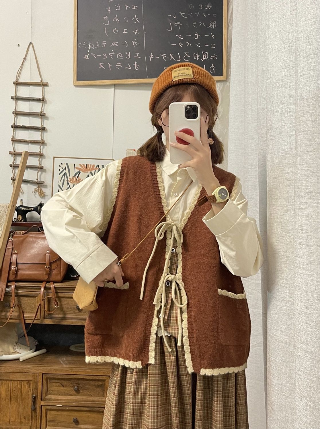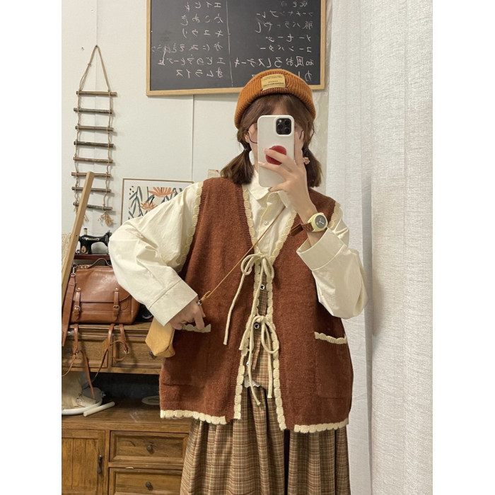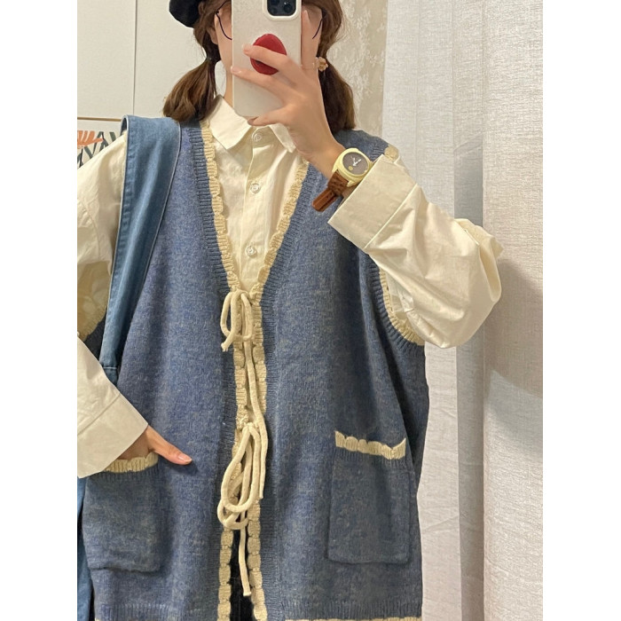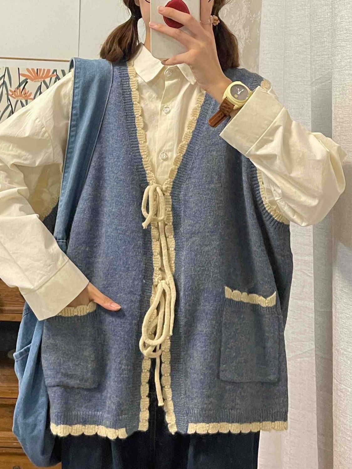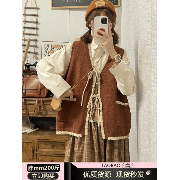胖MM200斤特大碼套裝日系小衆綁帶馬甲小個子針織毛衣背心兩件套