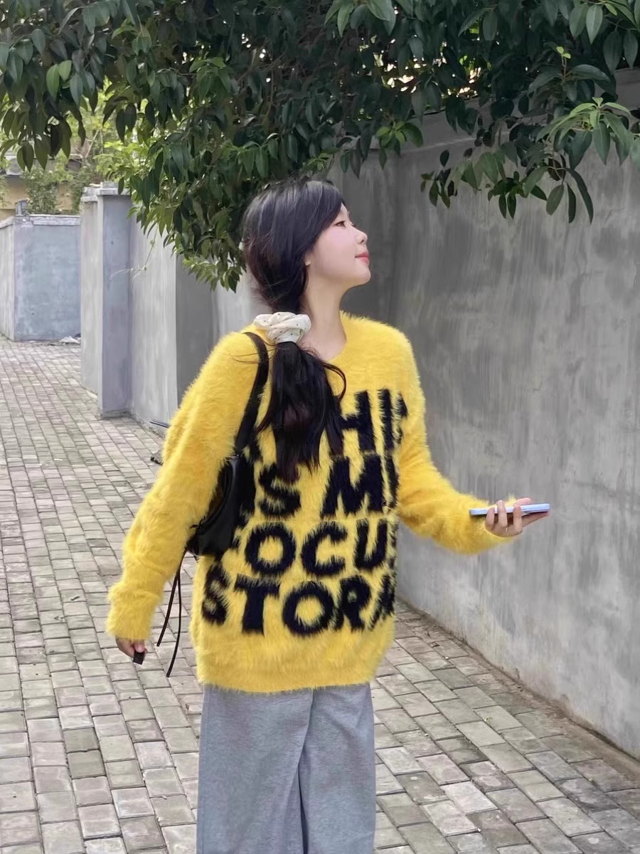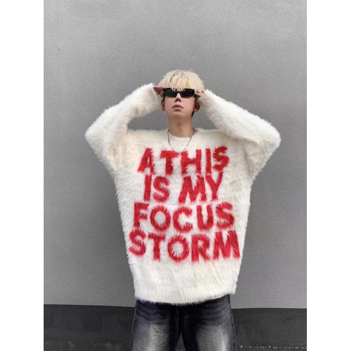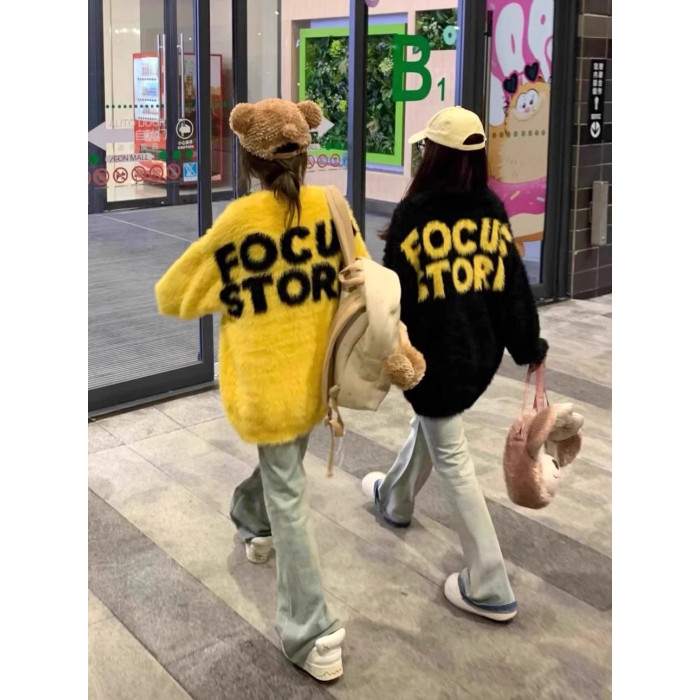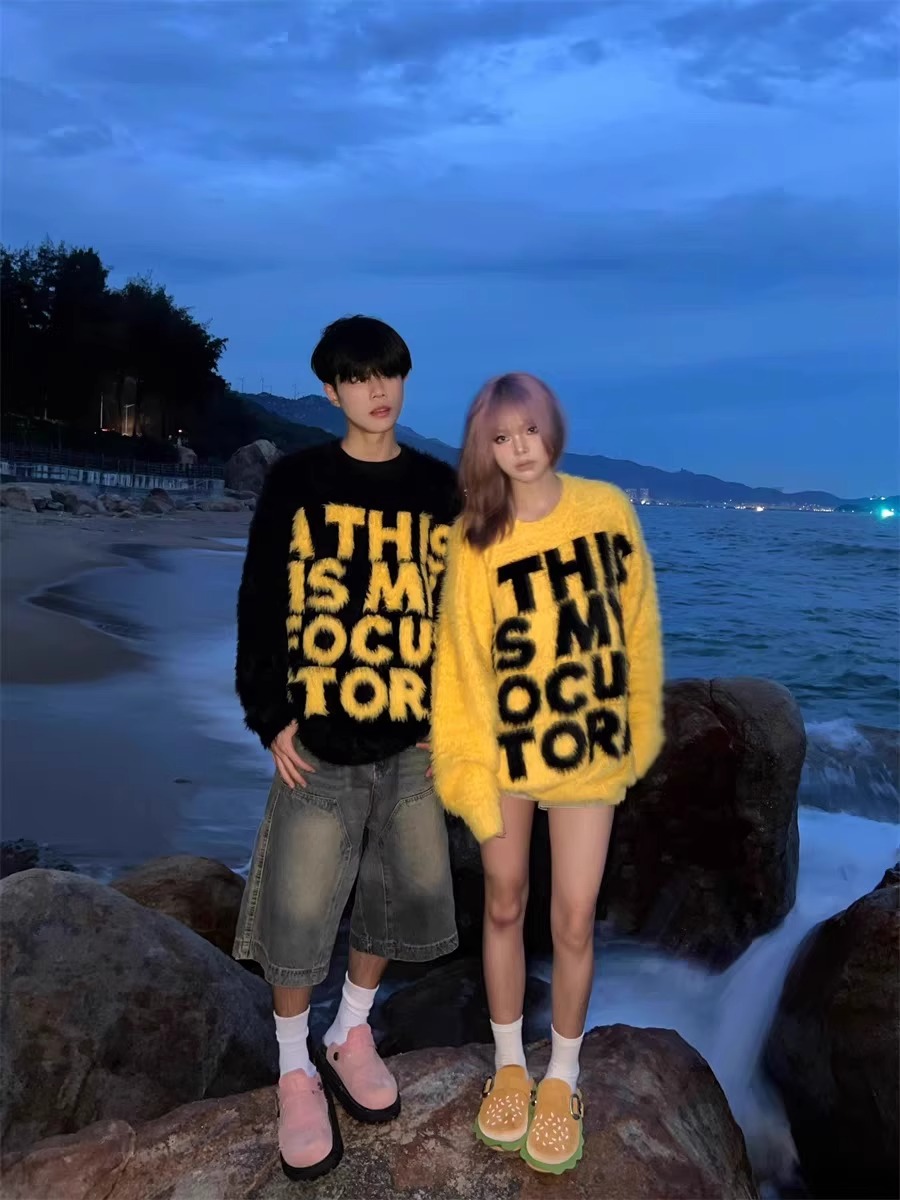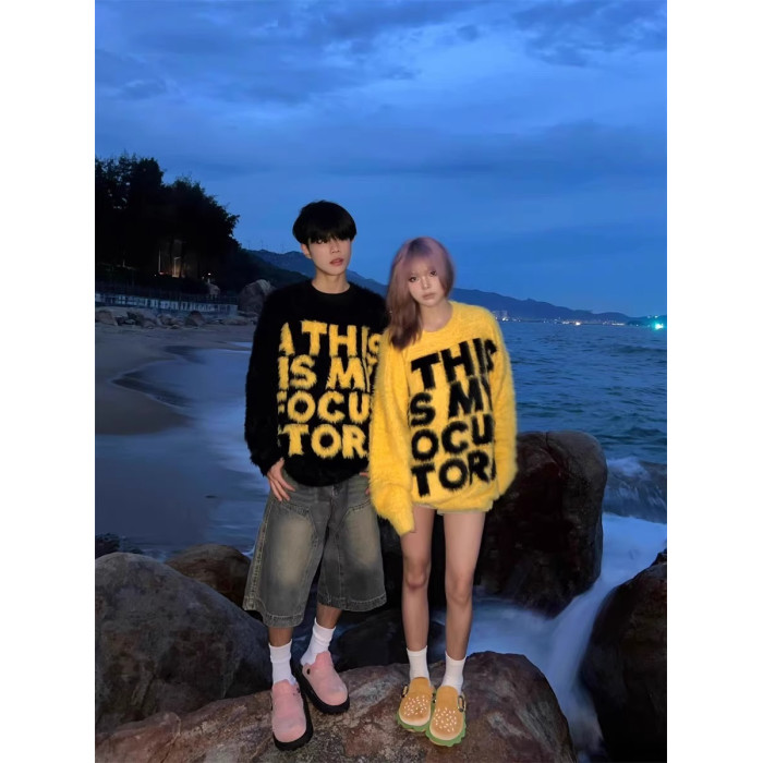 美式高街圓領字母提花針織衫外套男女秋冬水貂絨百搭寬松情侶毛衣