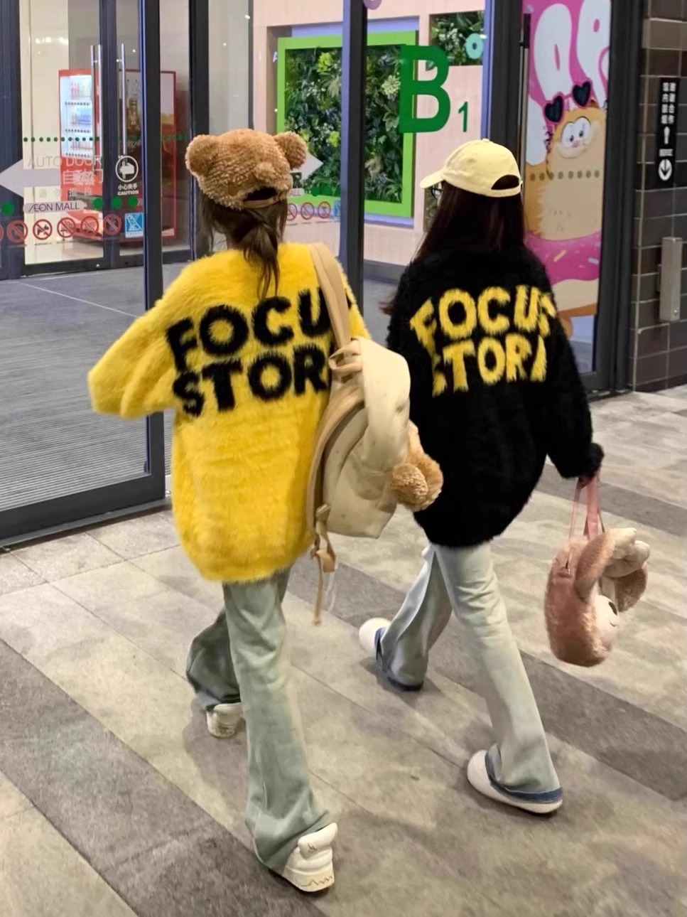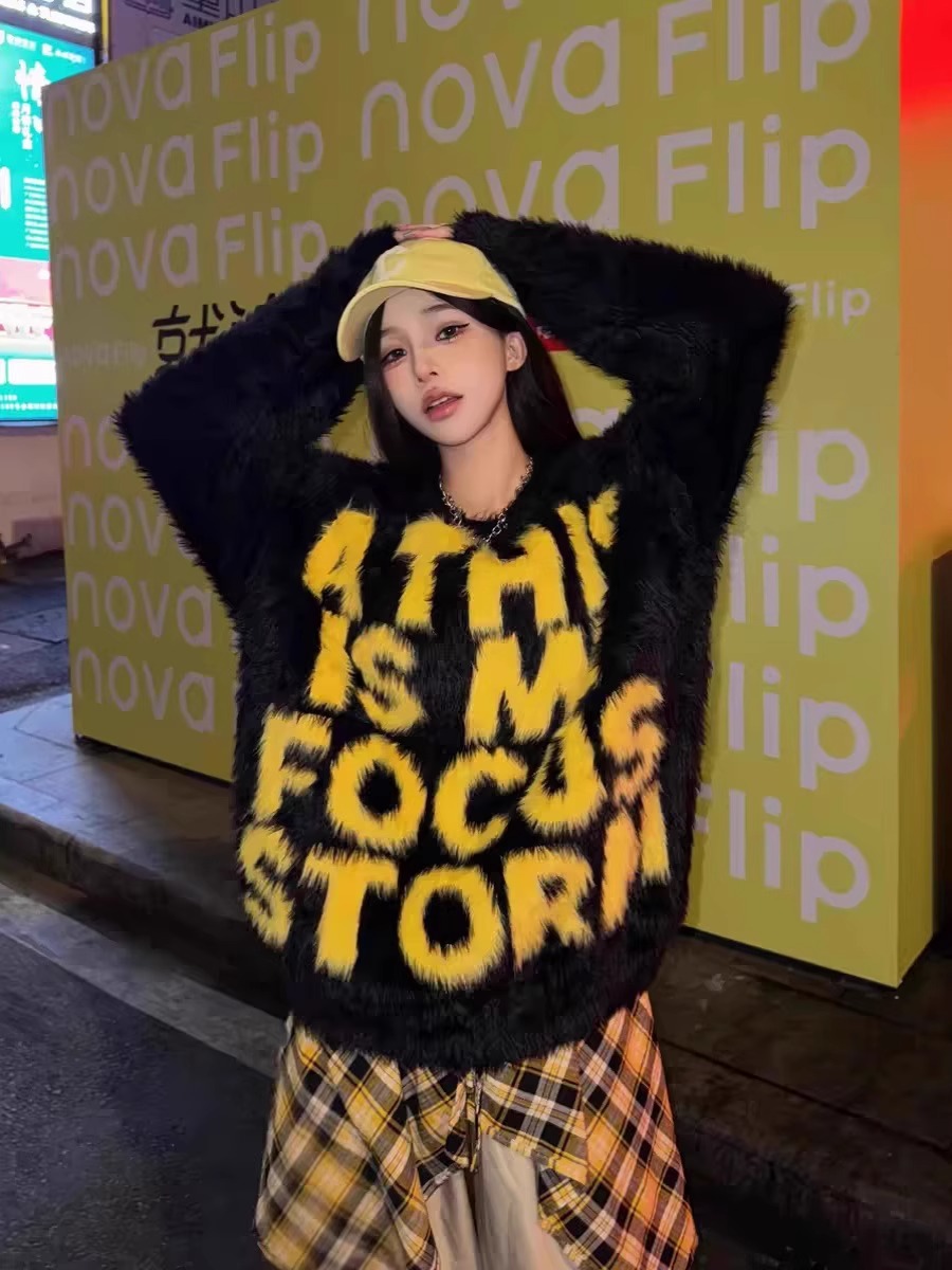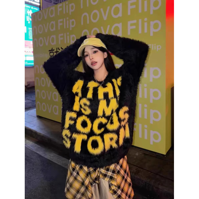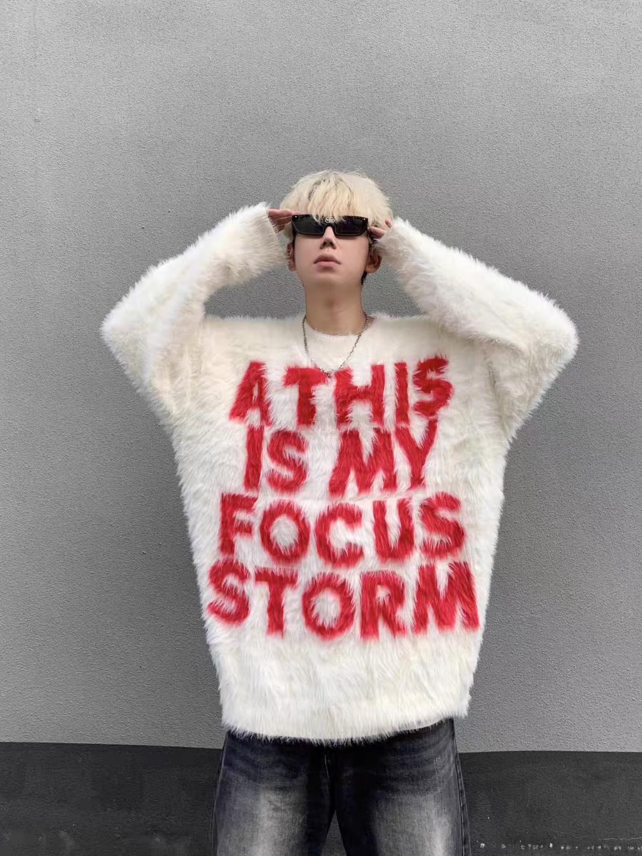 美式高街圓領字母提花針織衫外套男女秋冬水貂絨百搭寬松情侶毛衣
