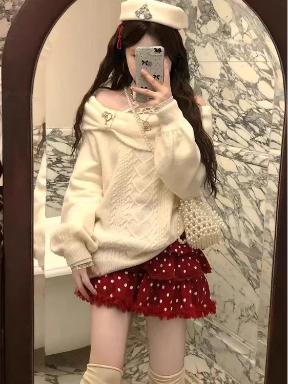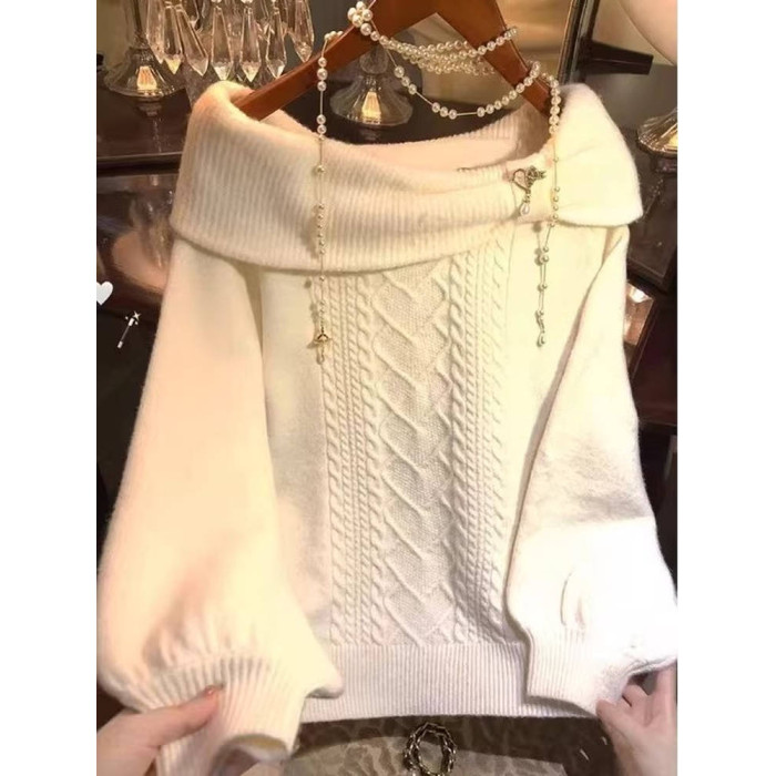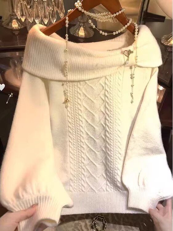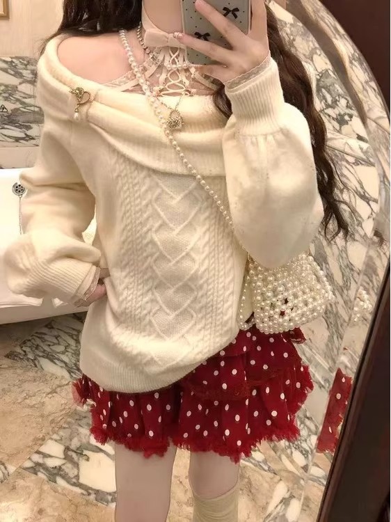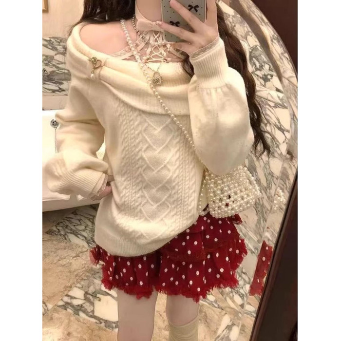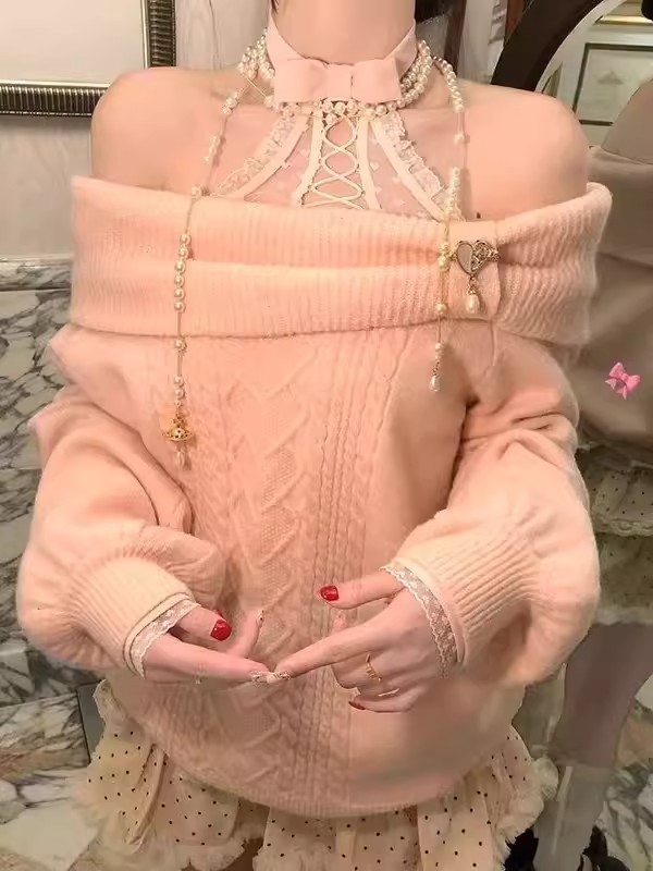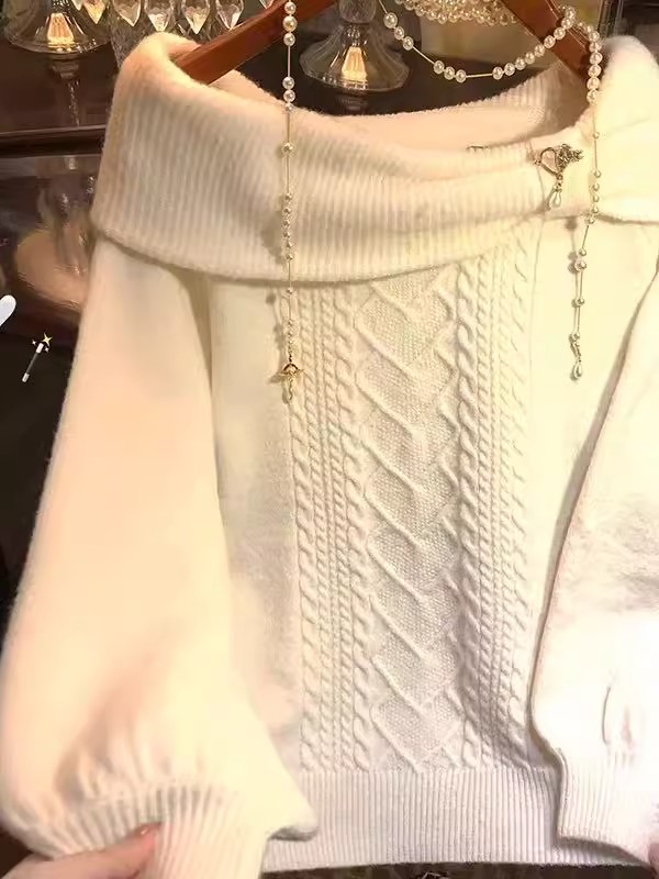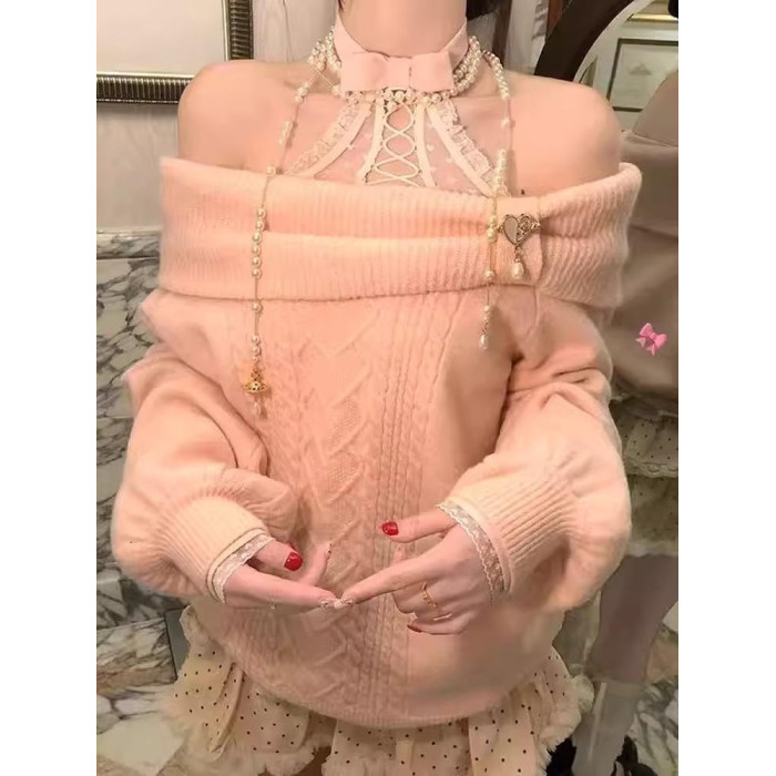 日系軟糯一字肩蝴蝶結毛衣女秋冬季小個子溫柔風單穿露肩針織上衣