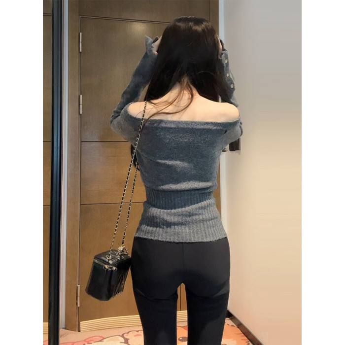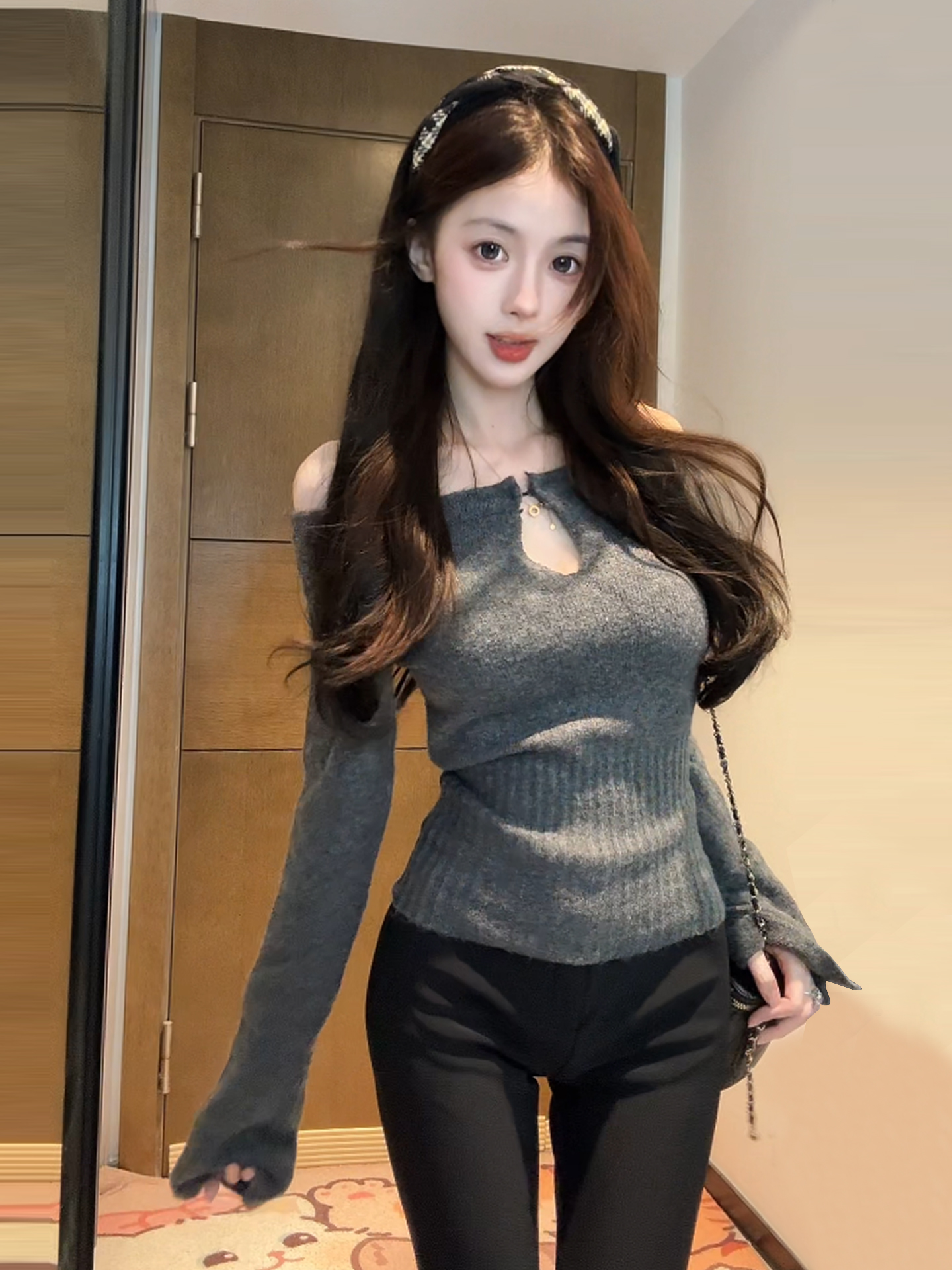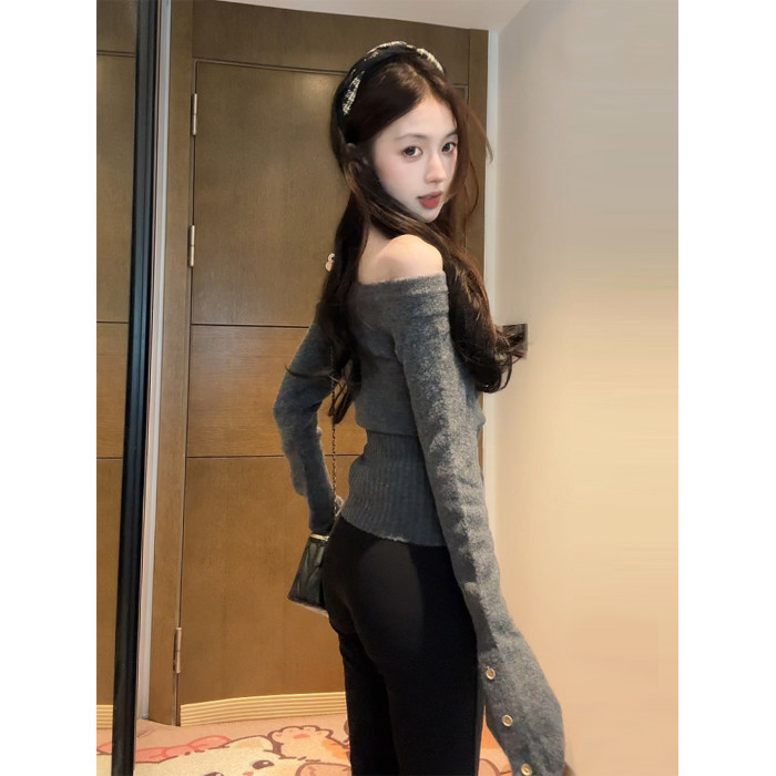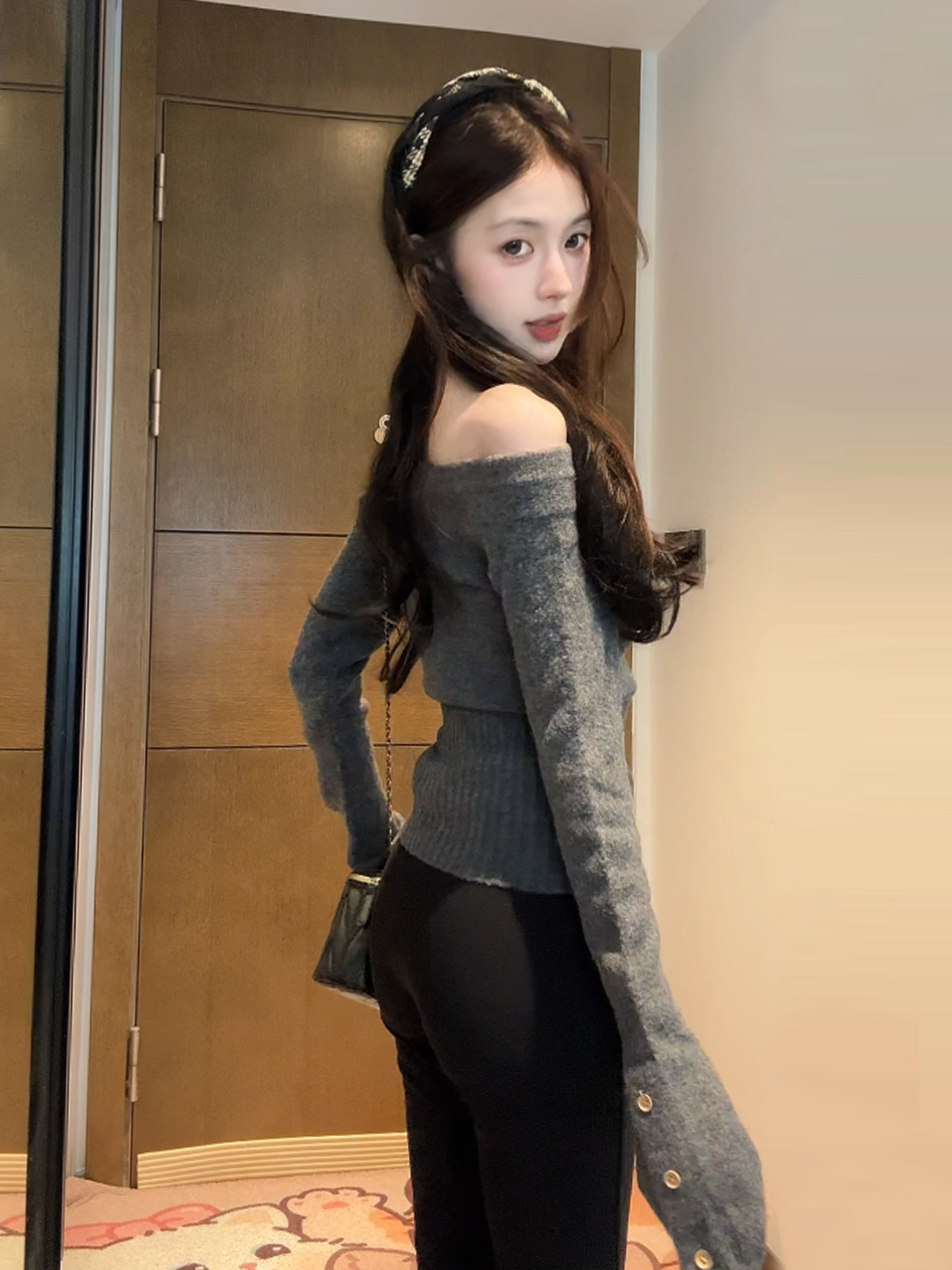 【XIAOBAWANG】灰色一字肩針織毛衣女秋冬小個子絕美氣質小衆上衣