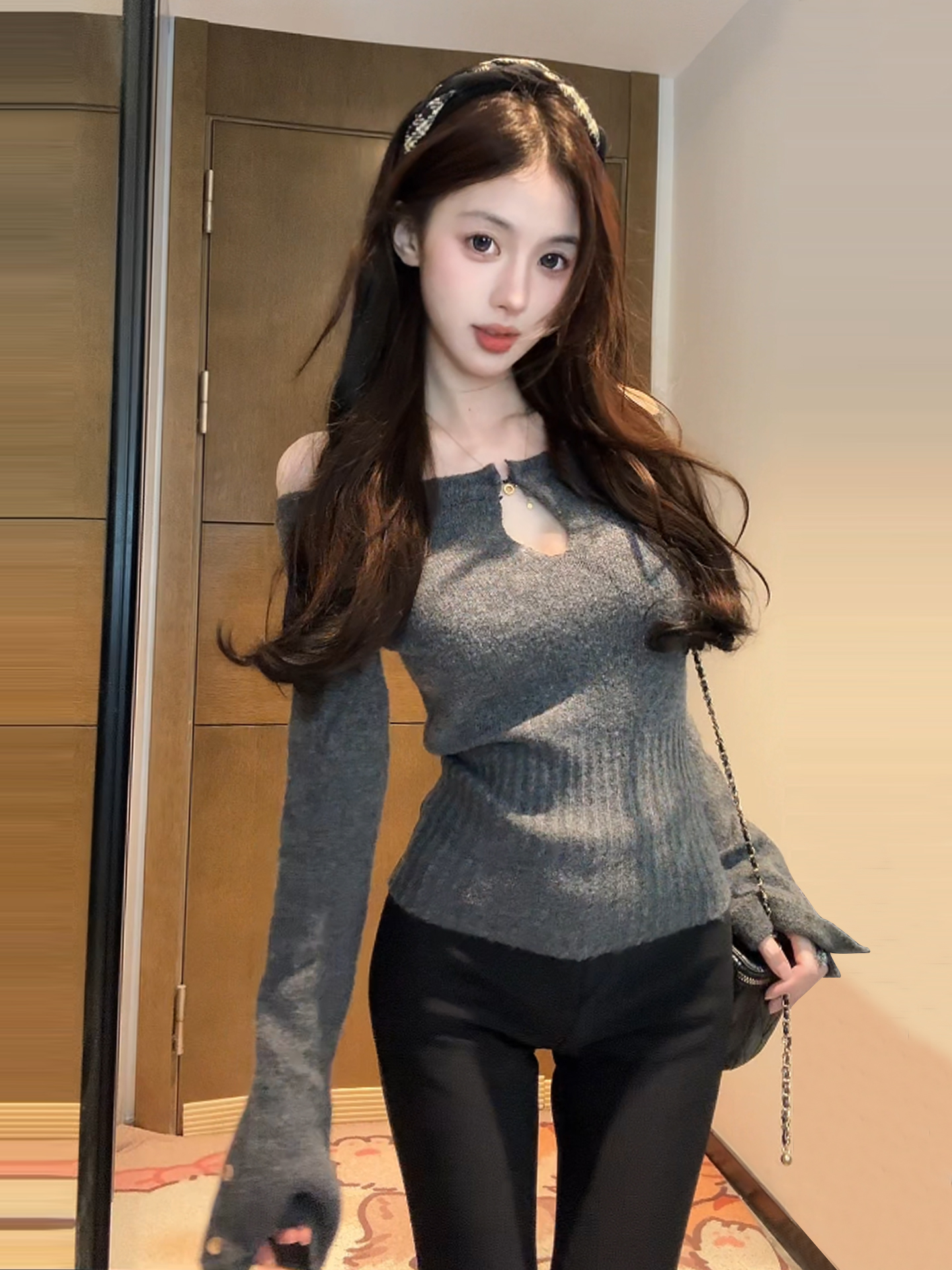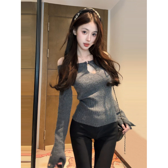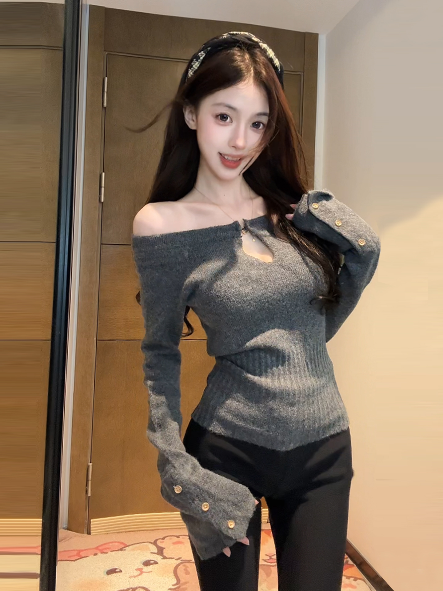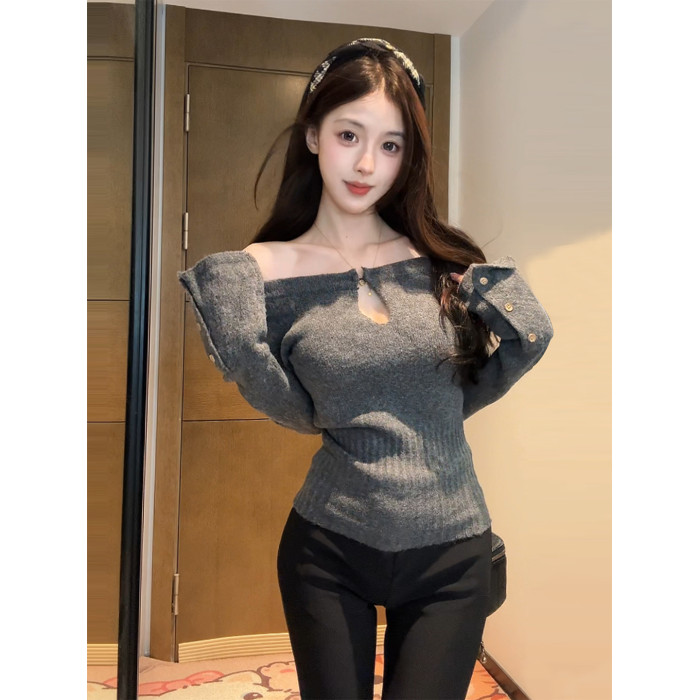 【XIAOBAWANG】灰色一字肩針織毛衣女秋冬小個子絕美氣質小衆上衣