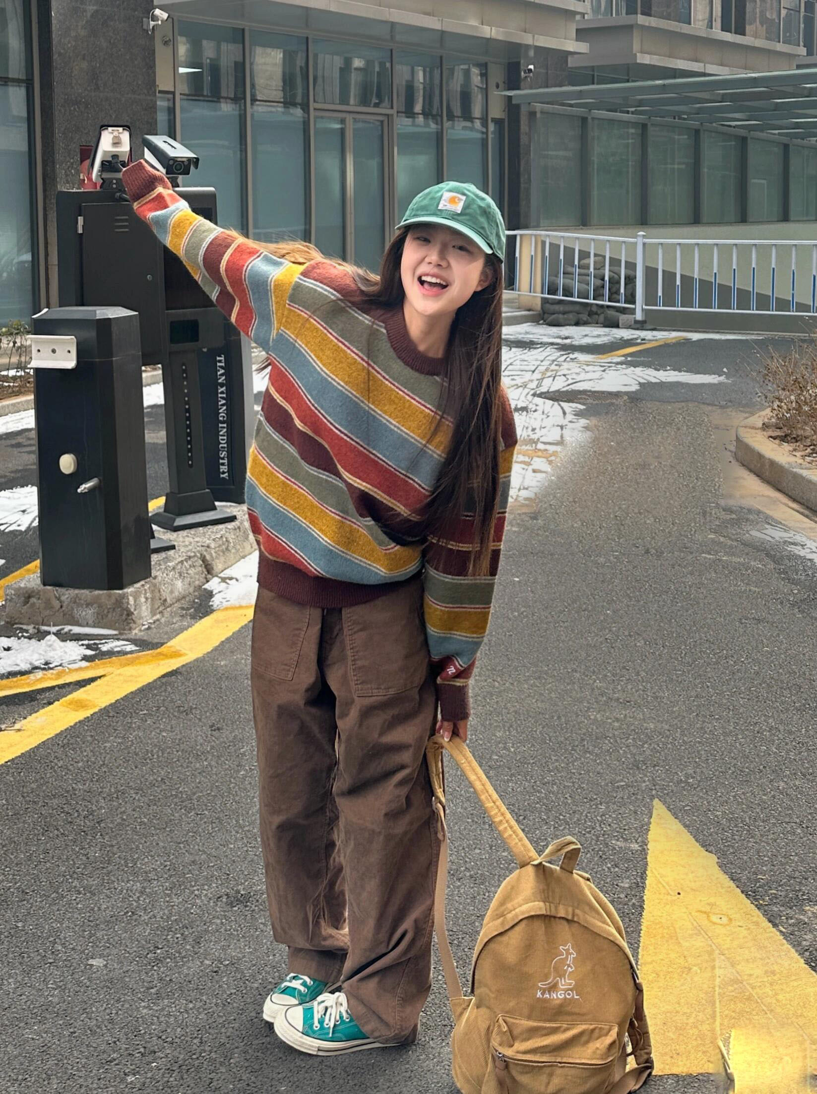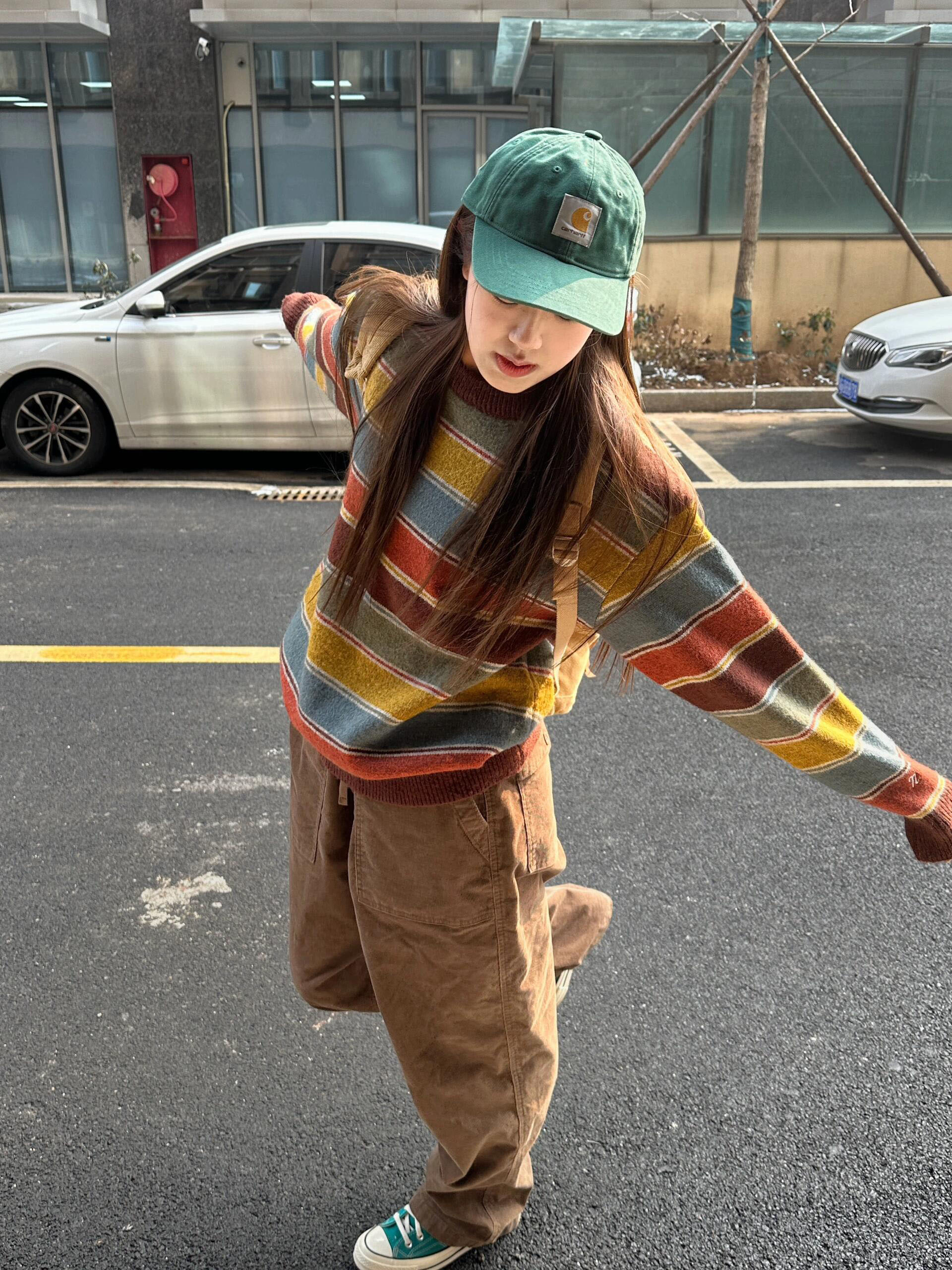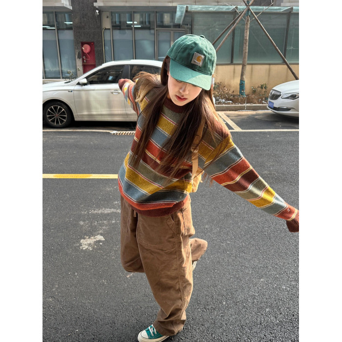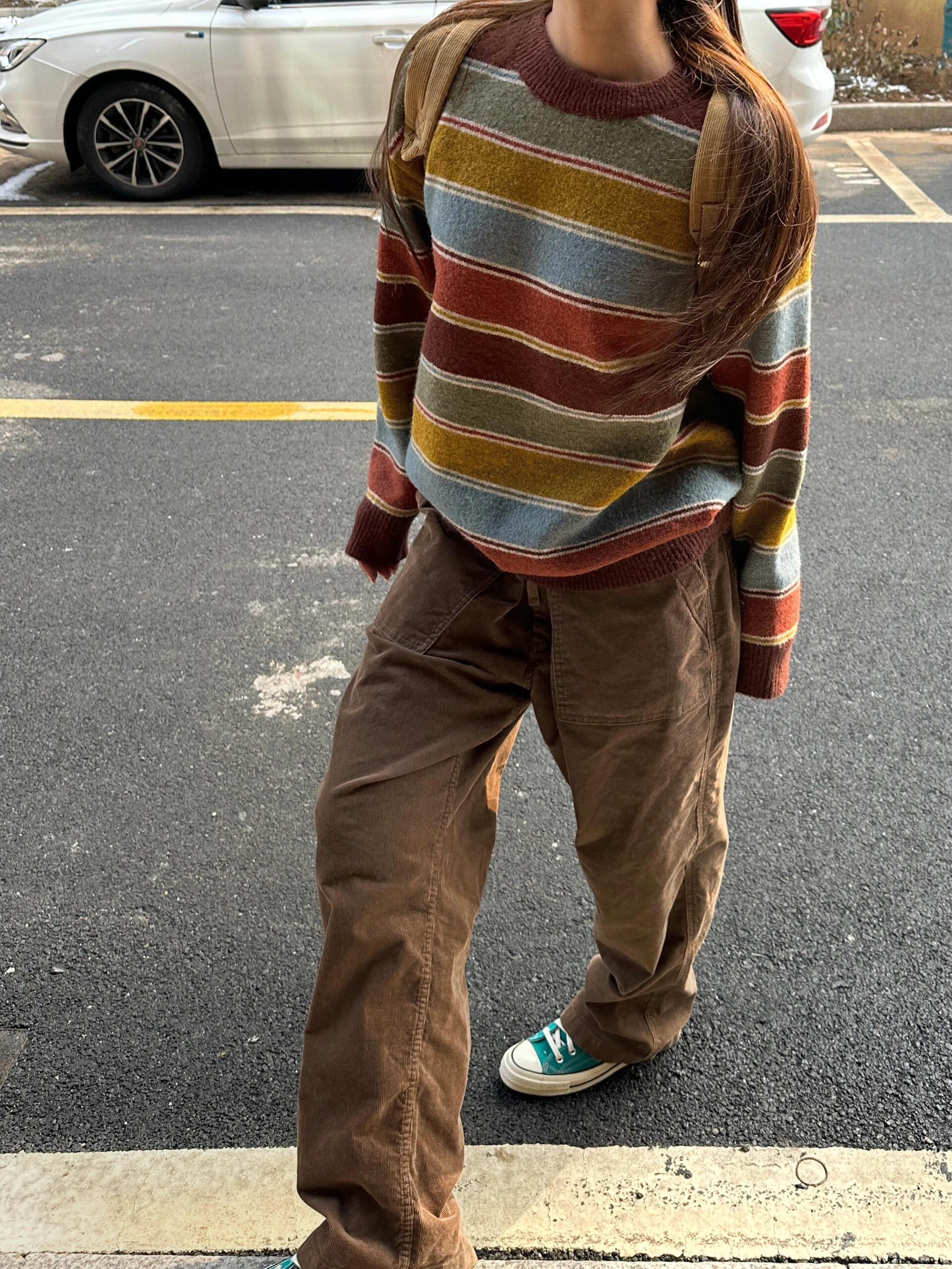 慵懶復古彩條紋毛衣女圓領秋冬長袖百搭鹽系針織套頭軟糯加厚上衣