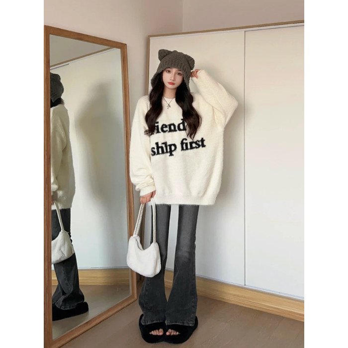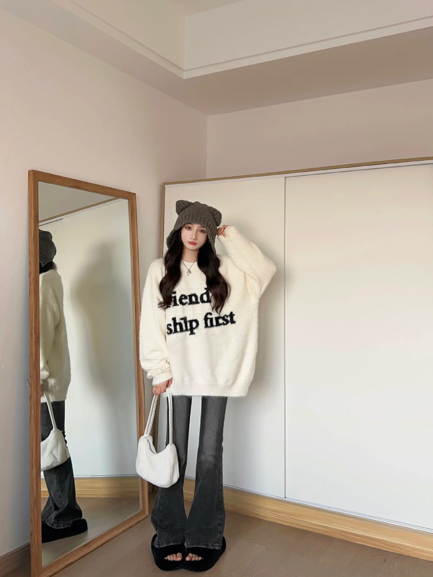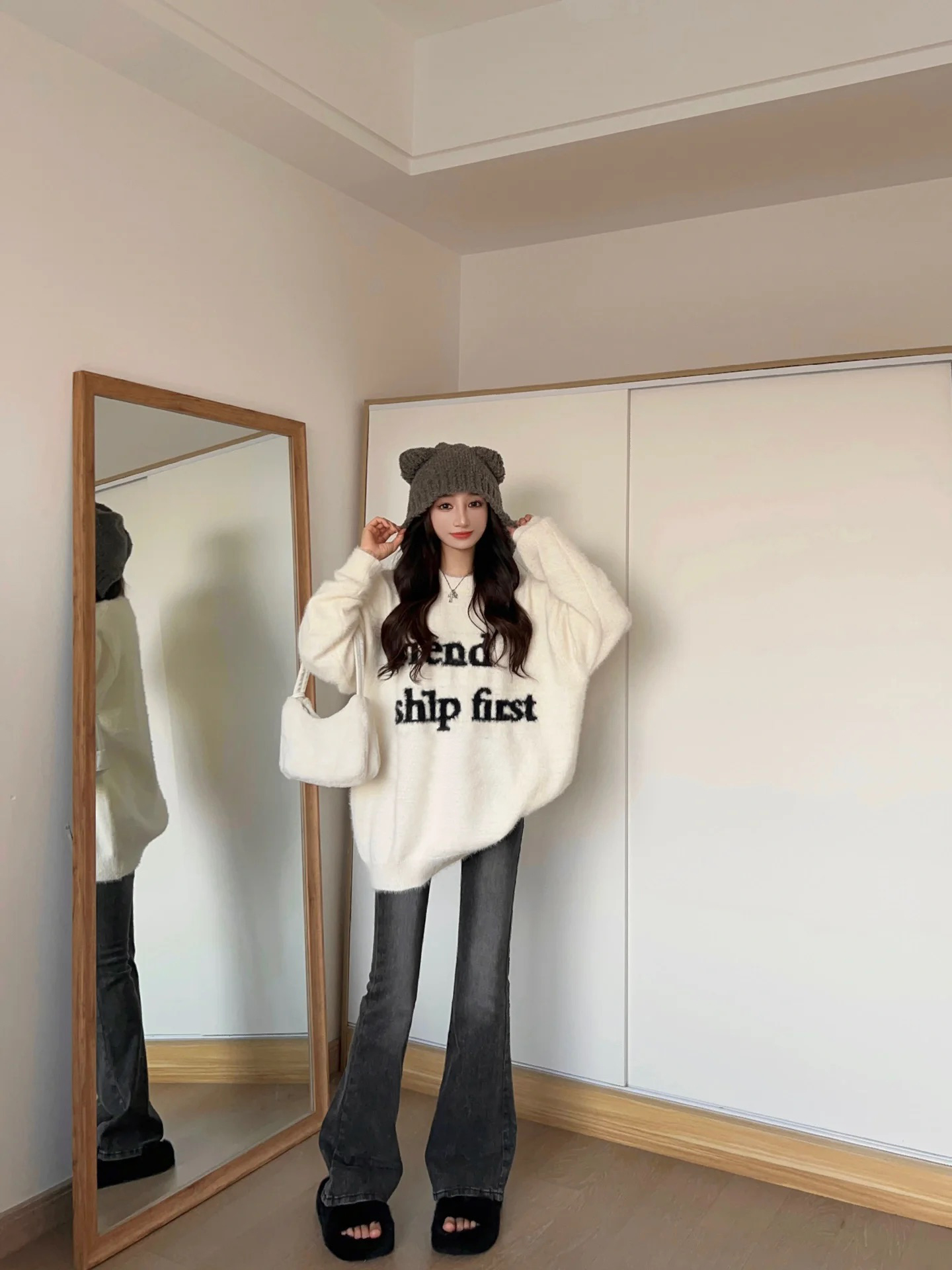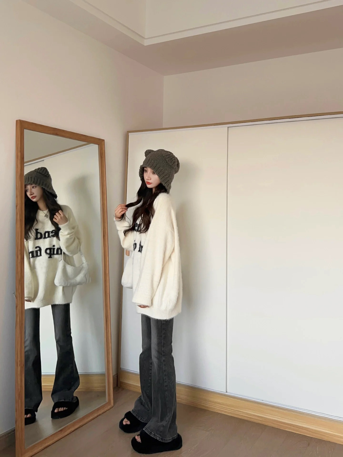 寬松慵懶風長袖針織2025秋冬季新款韓版休閒白色水貂絨軟糯毛衣女