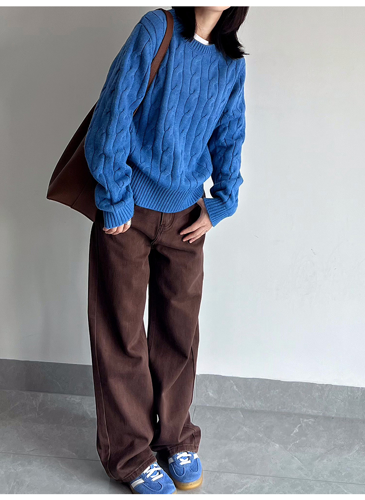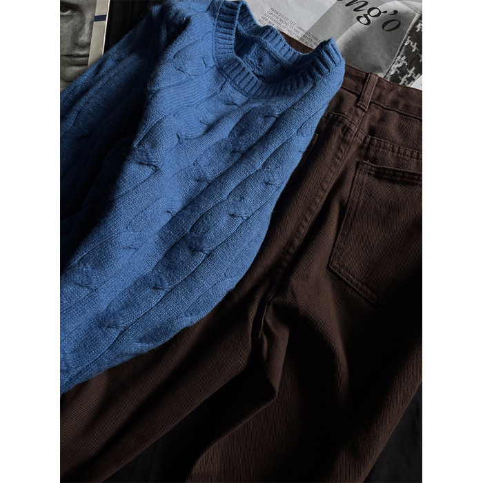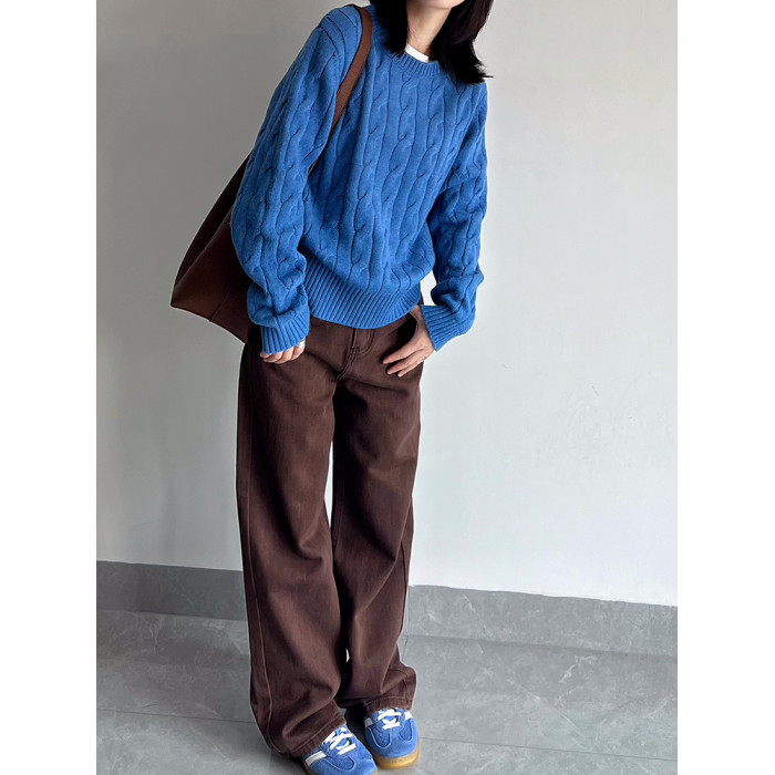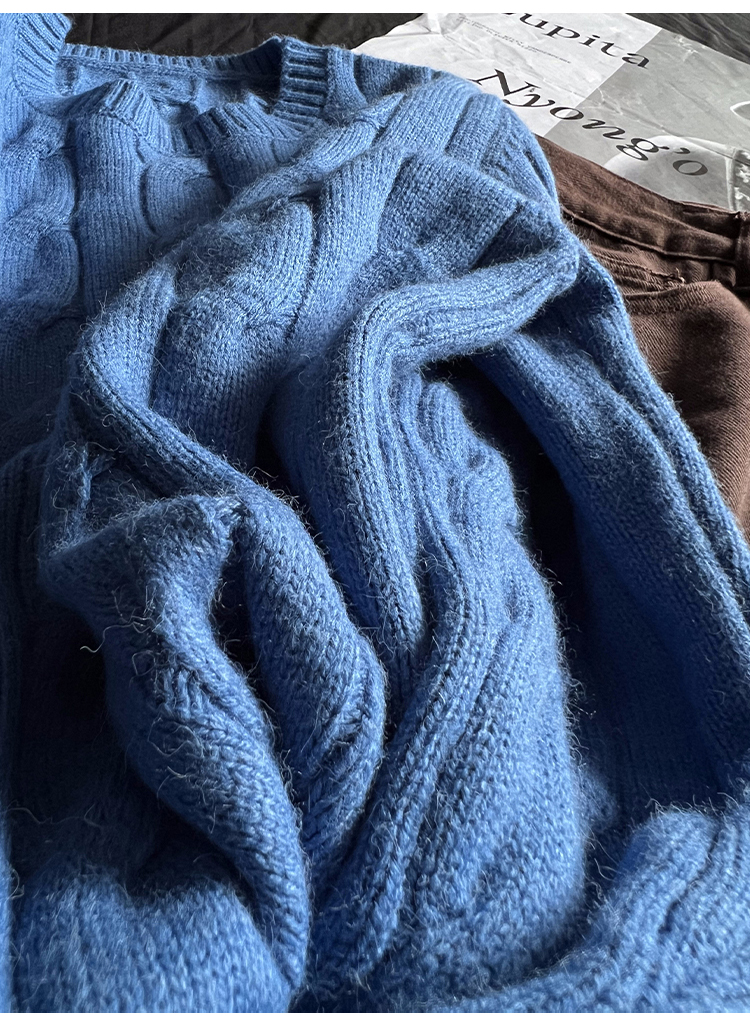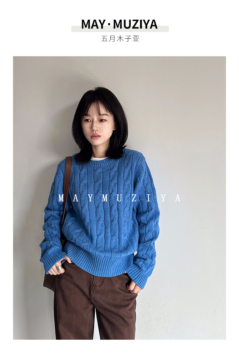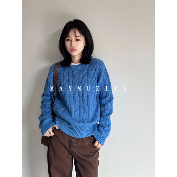 MAY MUZIYA克萊因藍針織衫女2025秋冬百搭寬松圓領套頭麻花毛衣