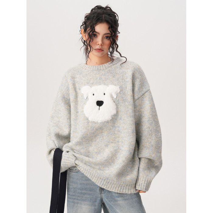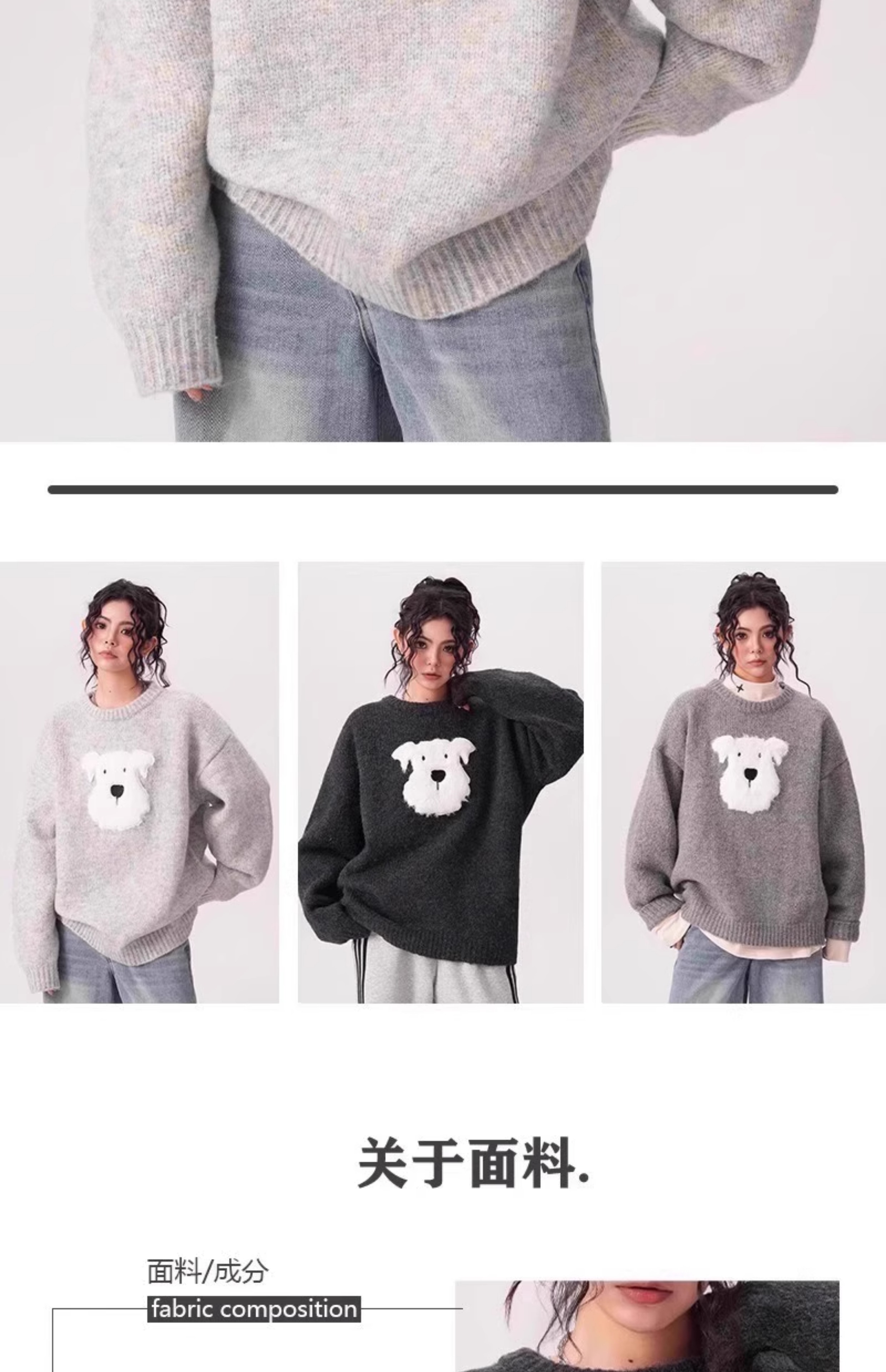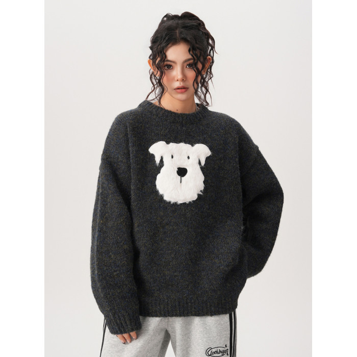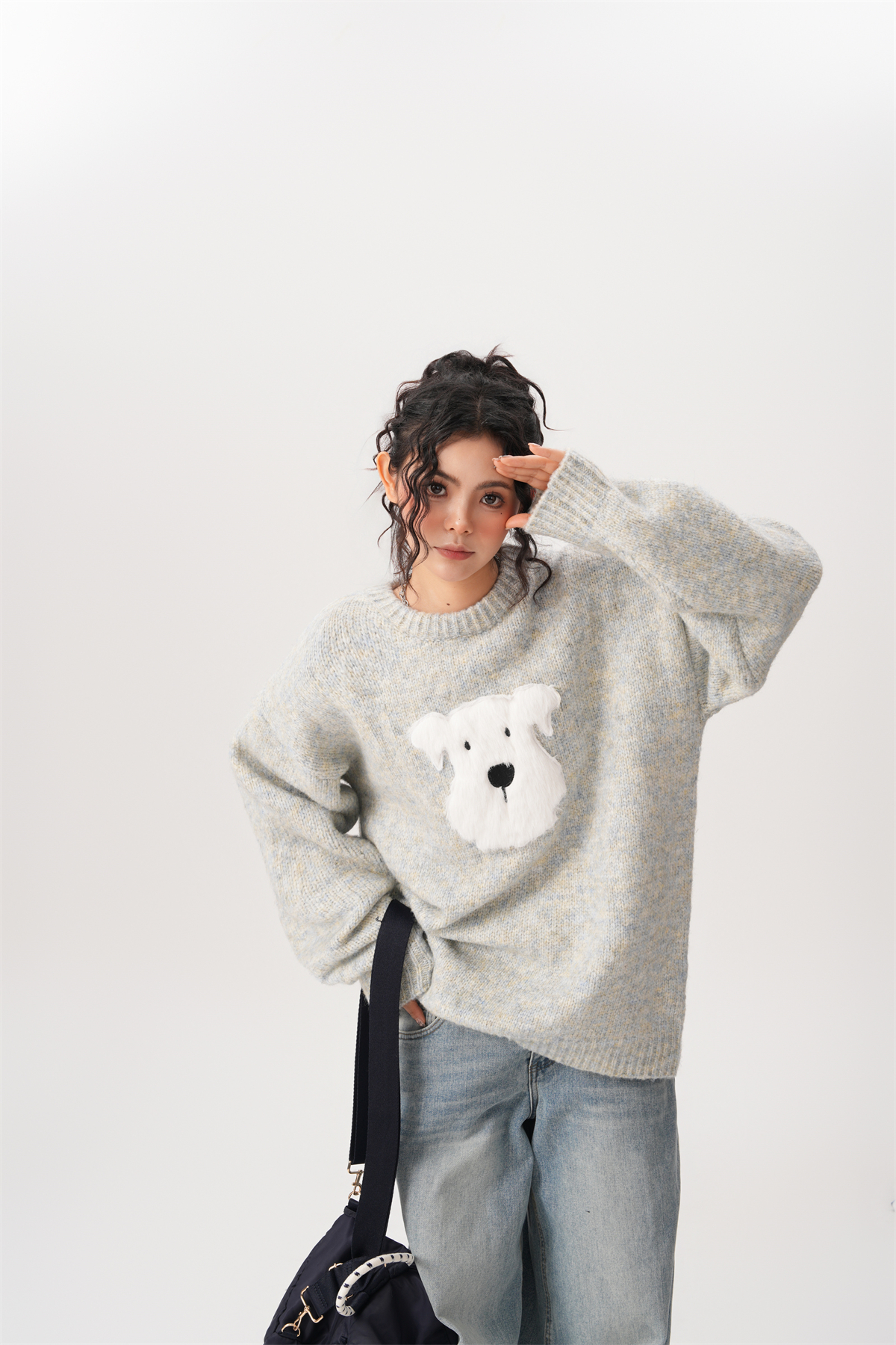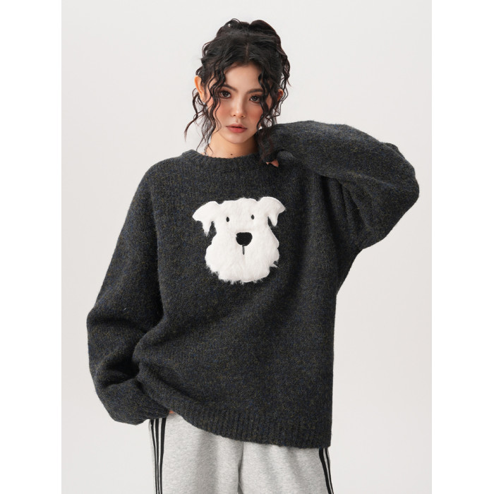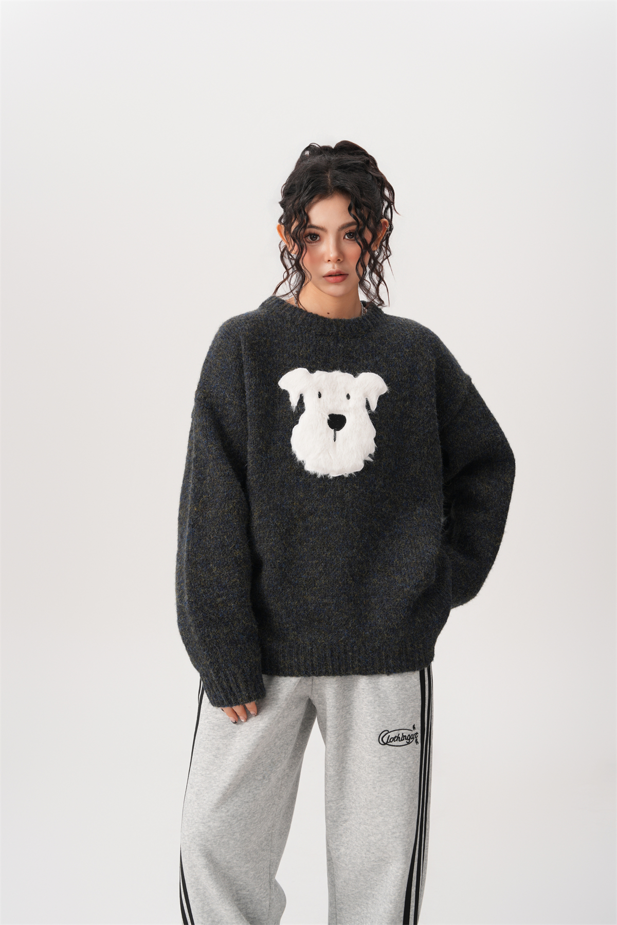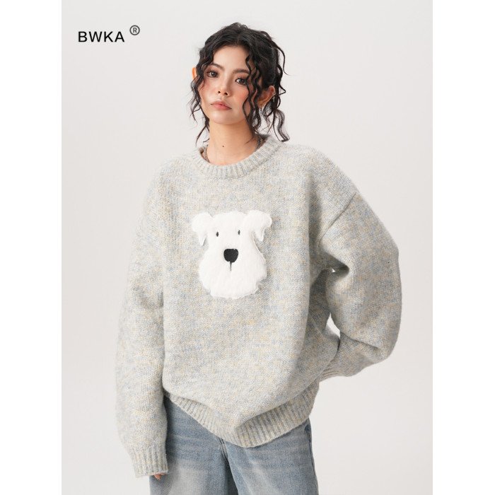 BWKA韓系毛絨小狗提花毛衣女男秋冬重磅寬松加厚慵懶風軟糯針織衫