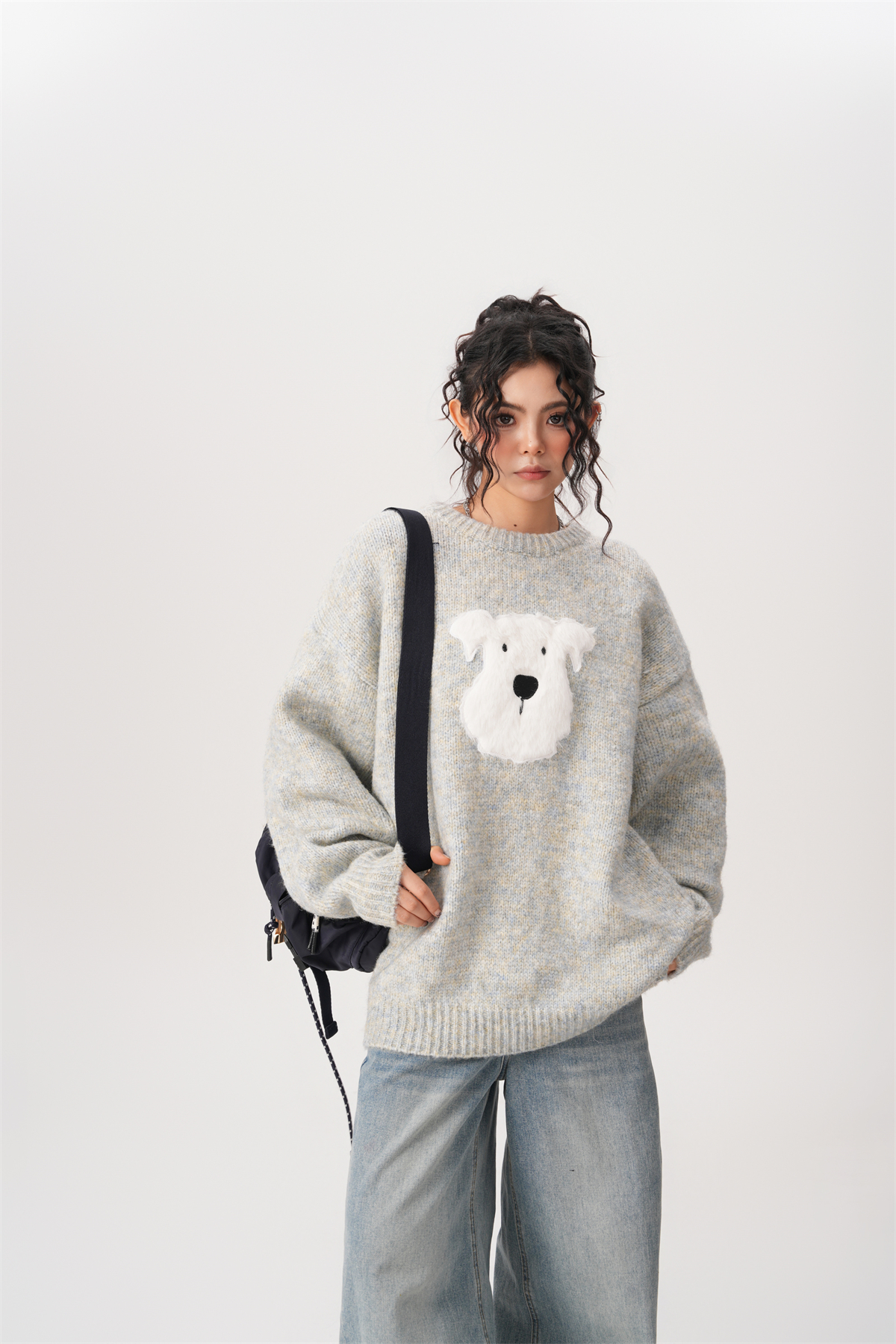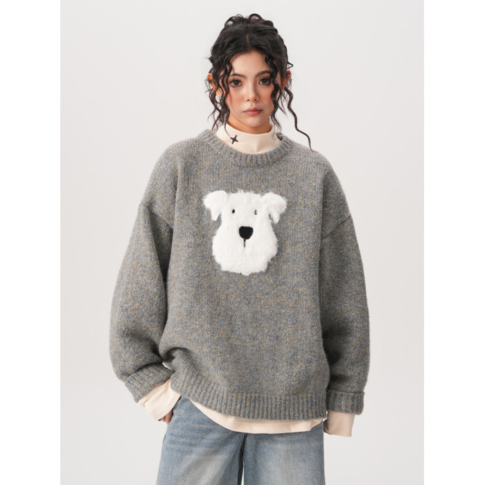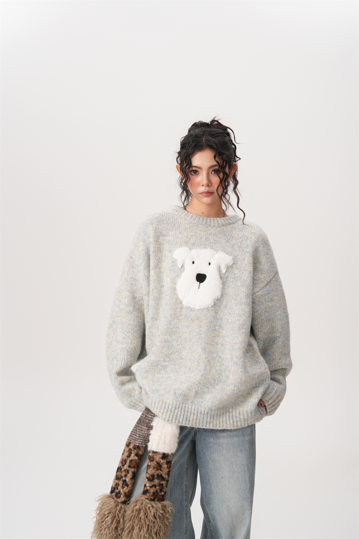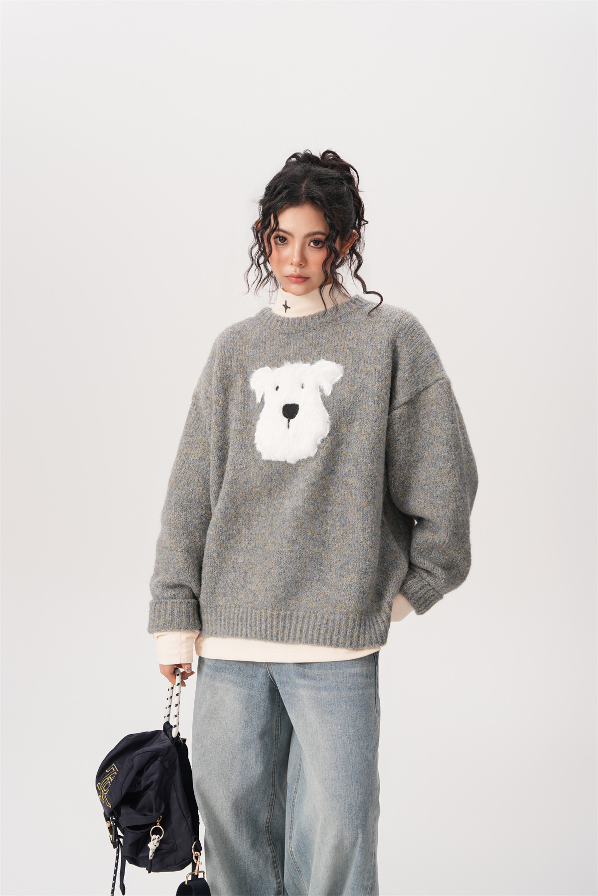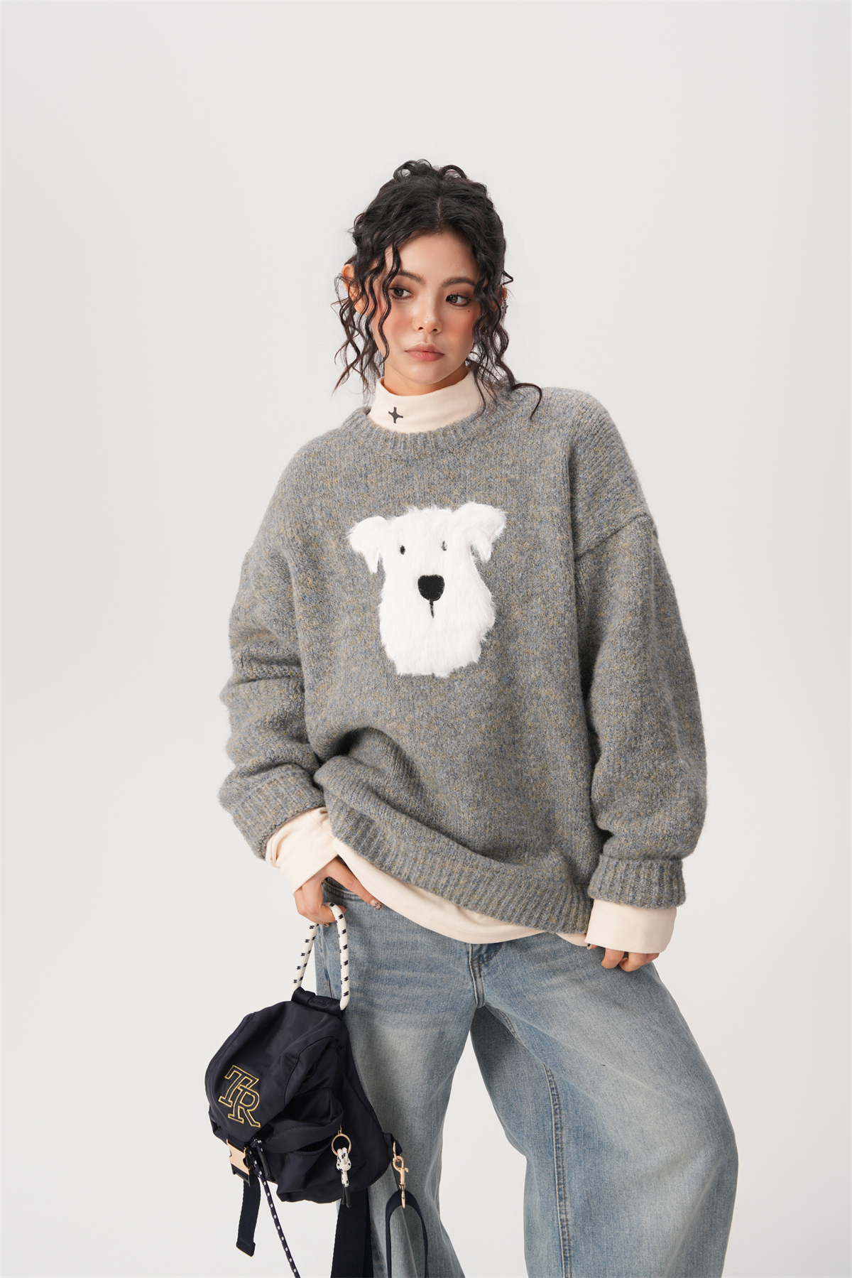 BWKA韓系毛絨小狗提花毛衣女男秋冬重磅寬松加厚慵懶風軟糯針織衫