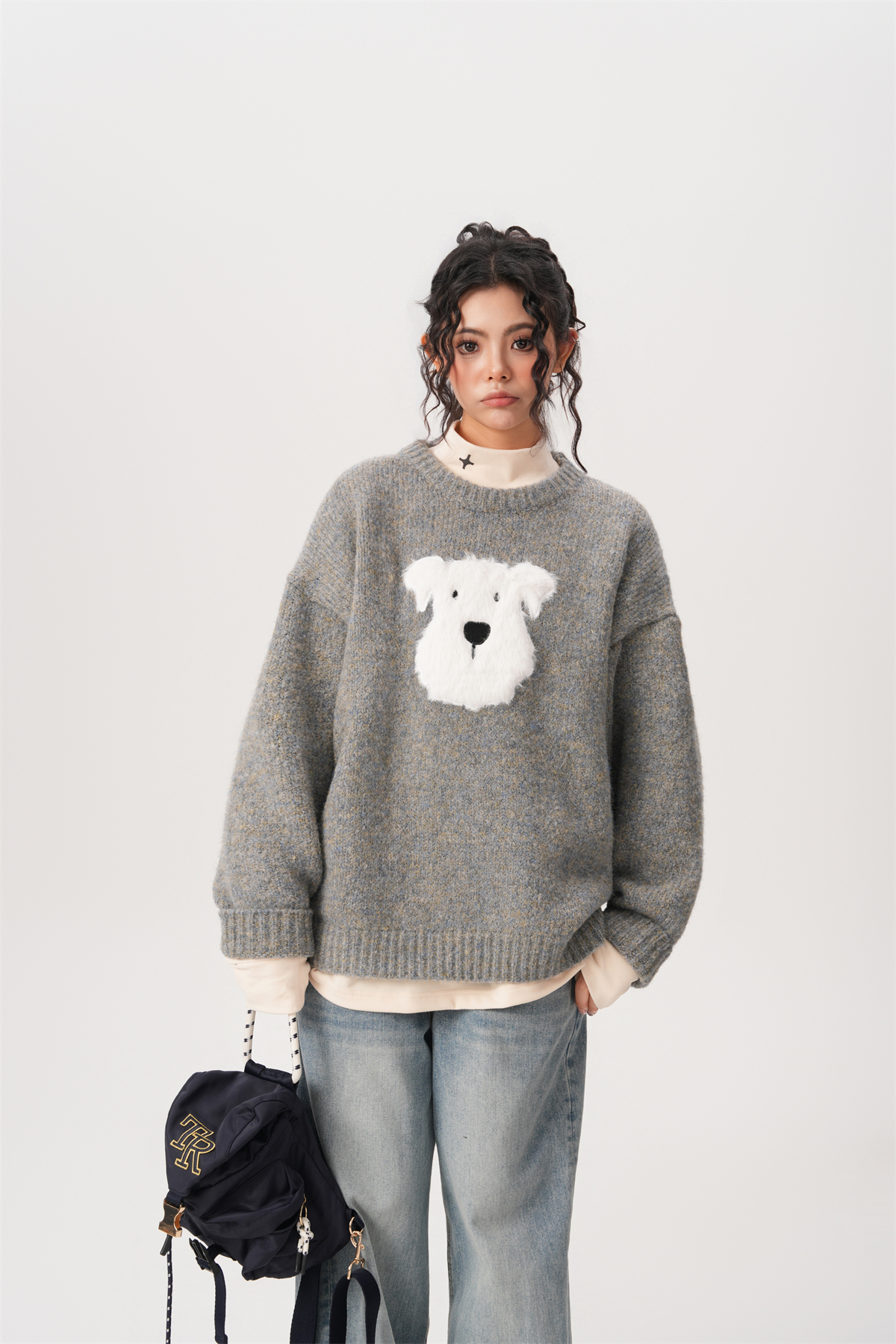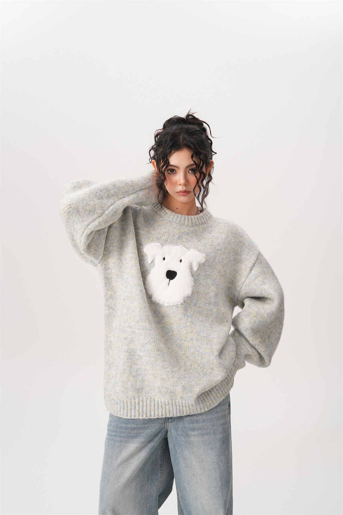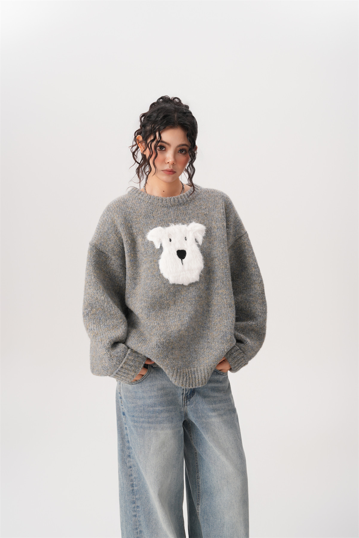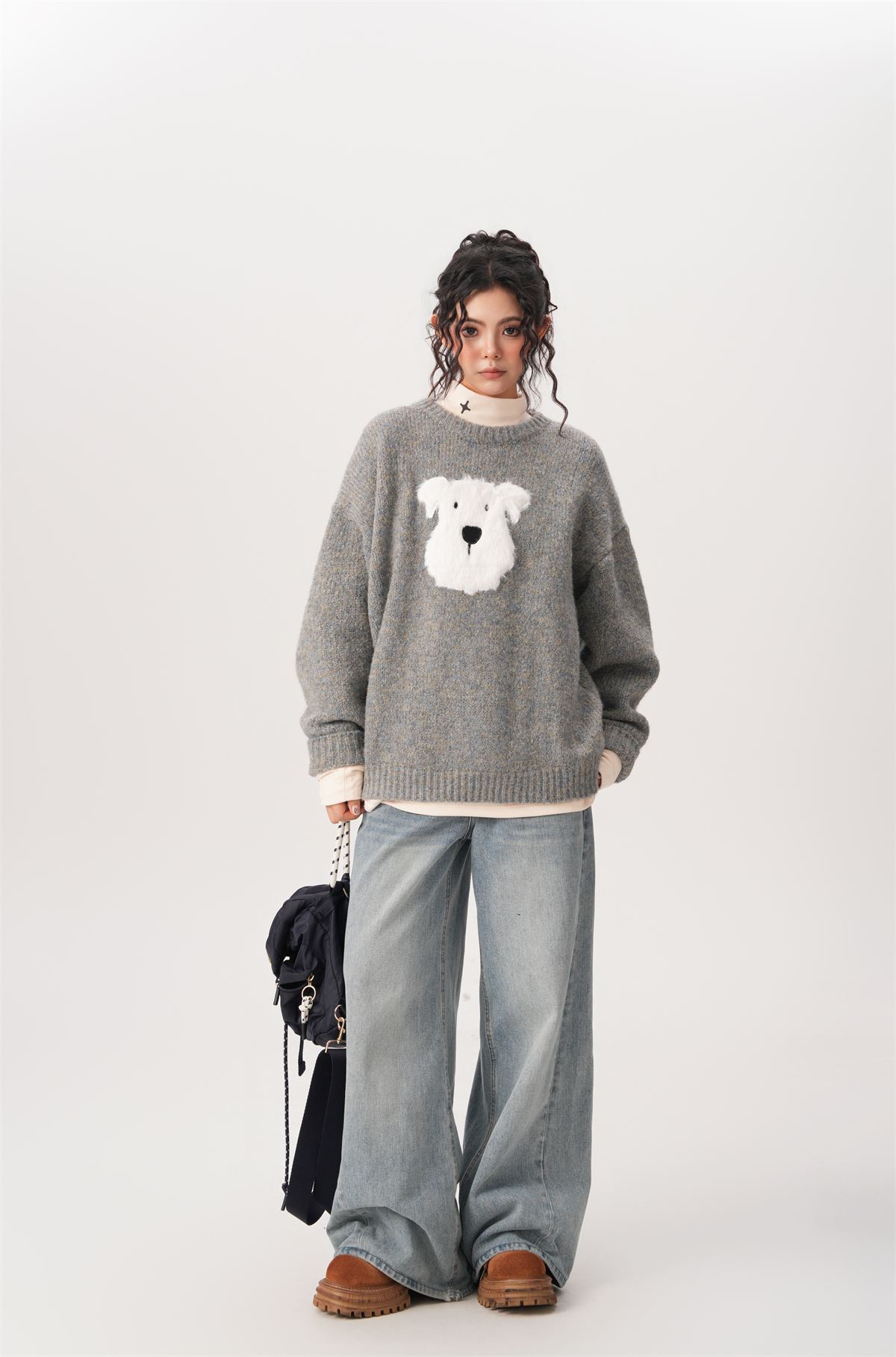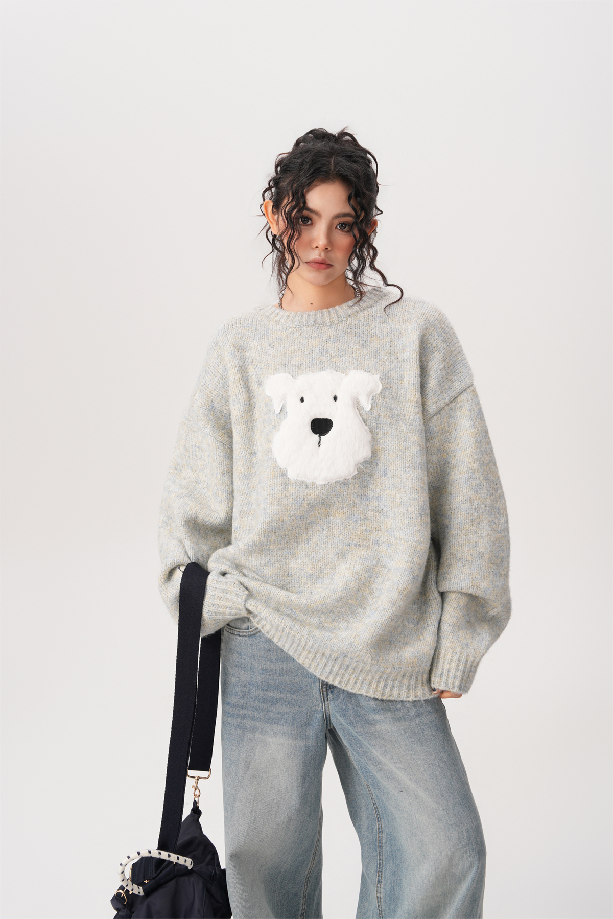 BWKA韓系毛絨小狗提花毛衣女男秋冬重磅寬松加厚慵懶風軟糯針織衫