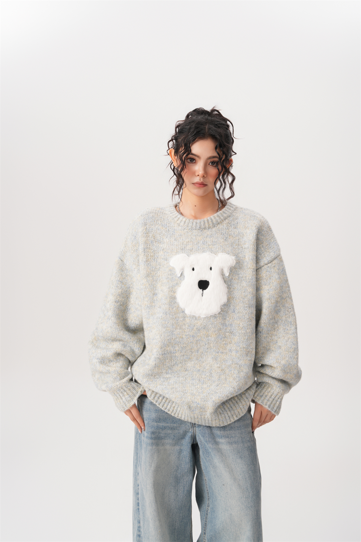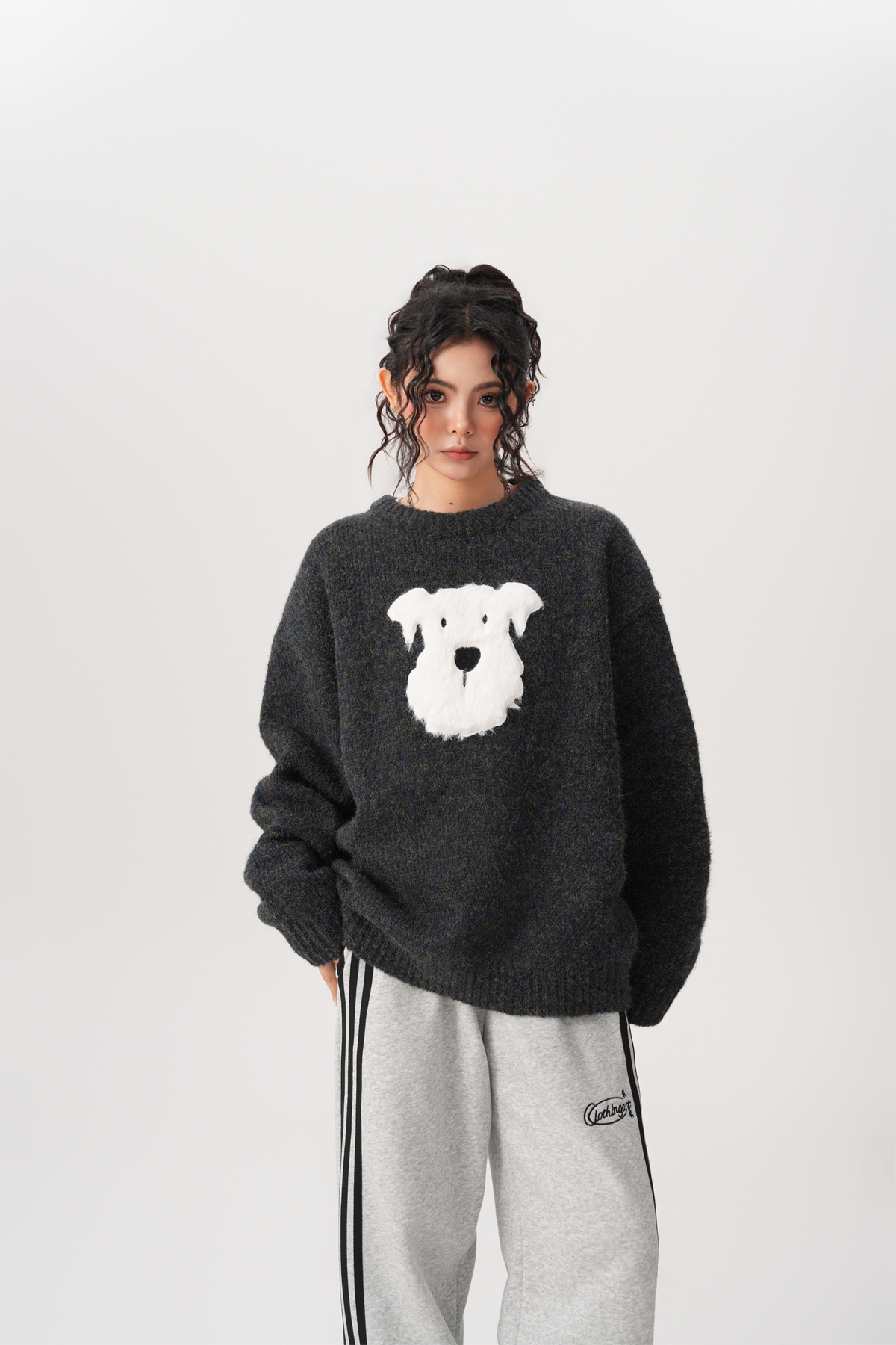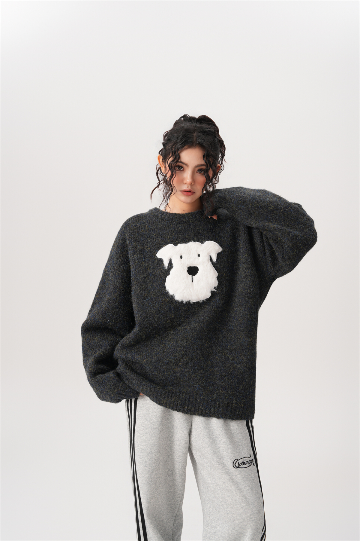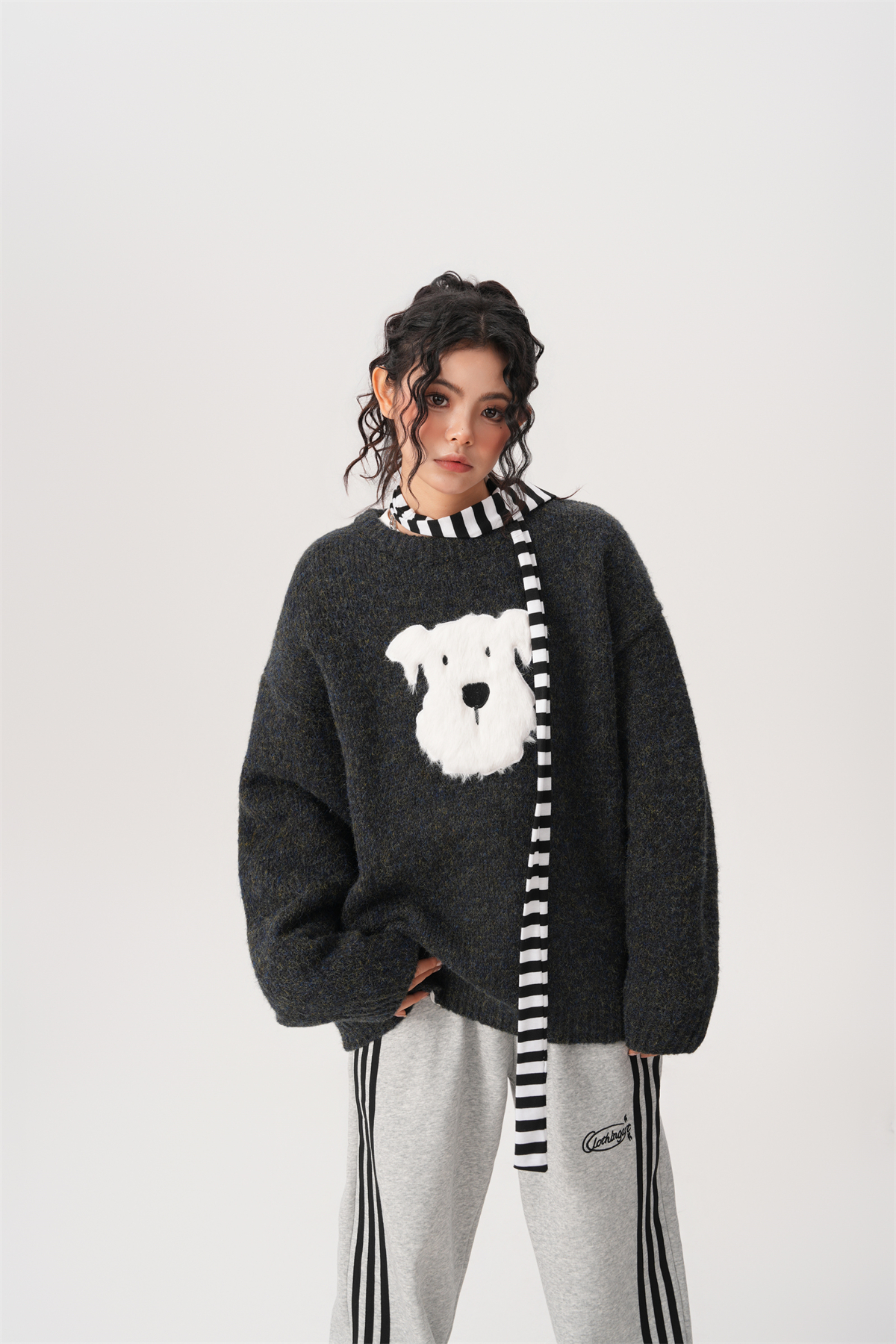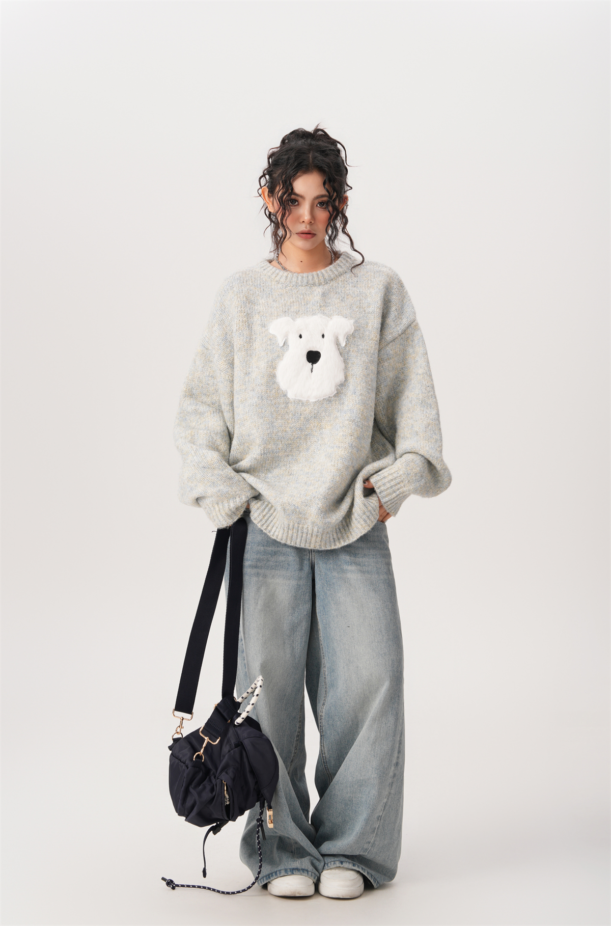 BWKA韓系毛絨小狗提花毛衣女男秋冬重磅寬松加厚慵懶風軟糯針織衫