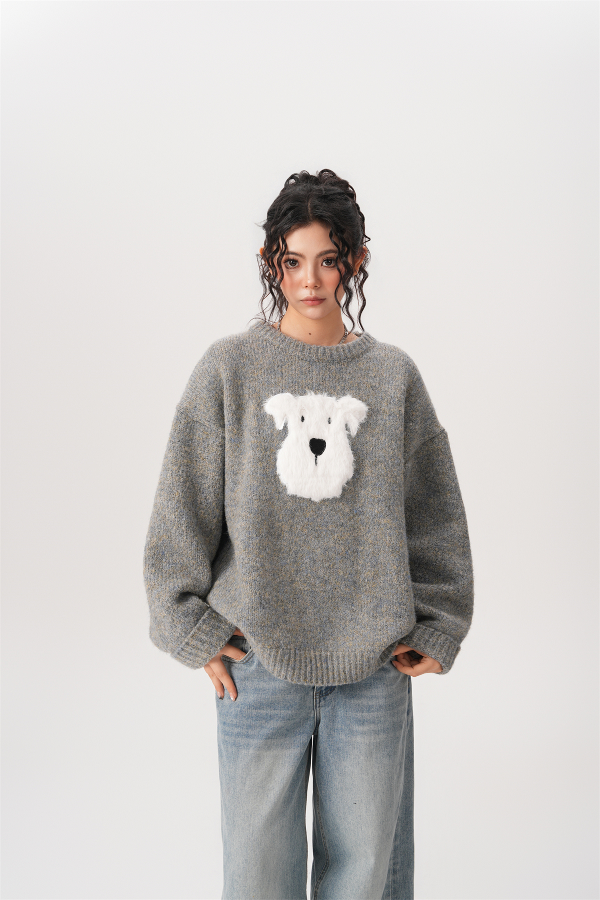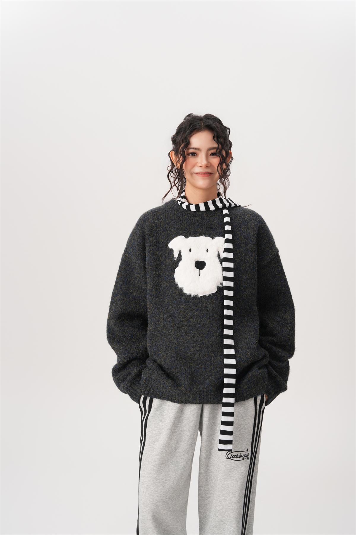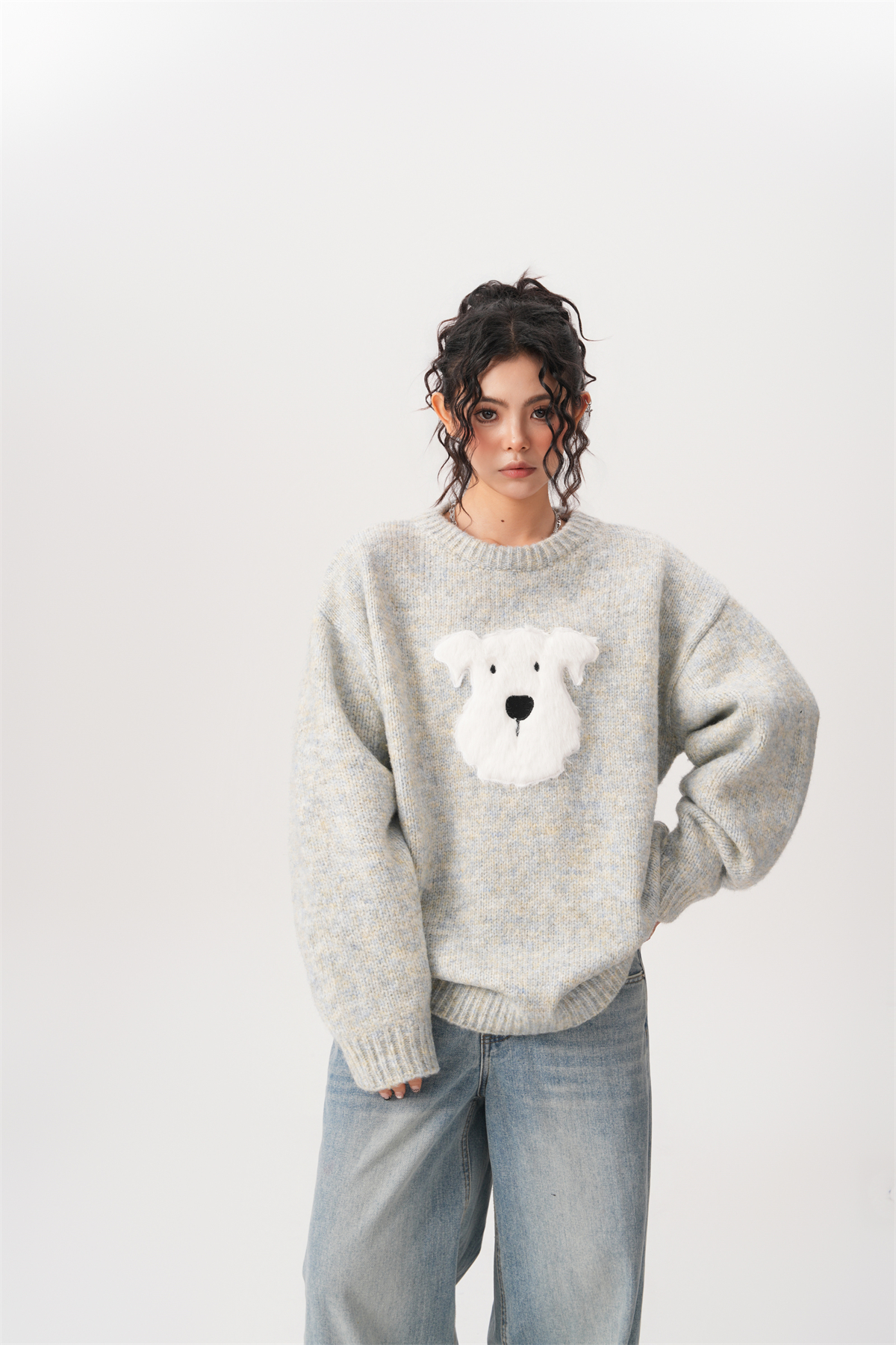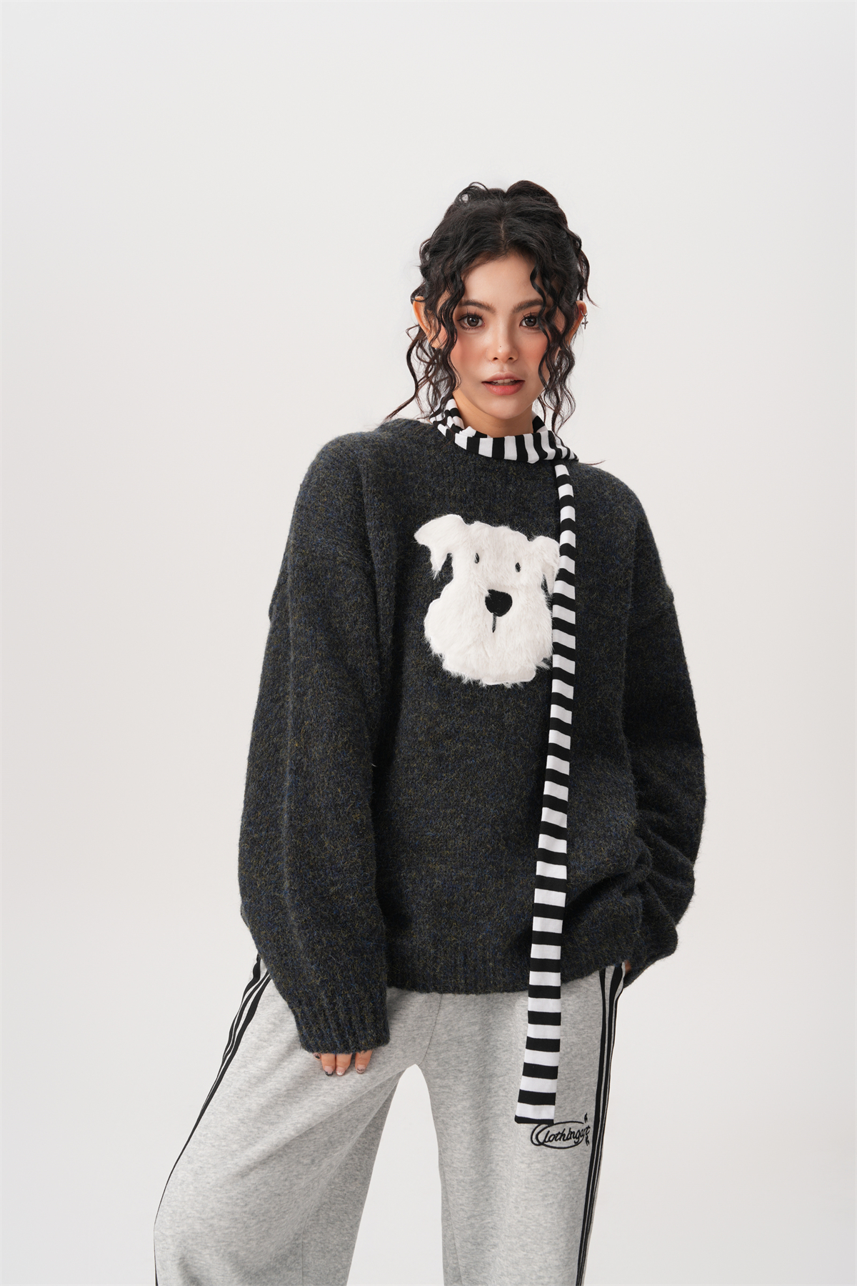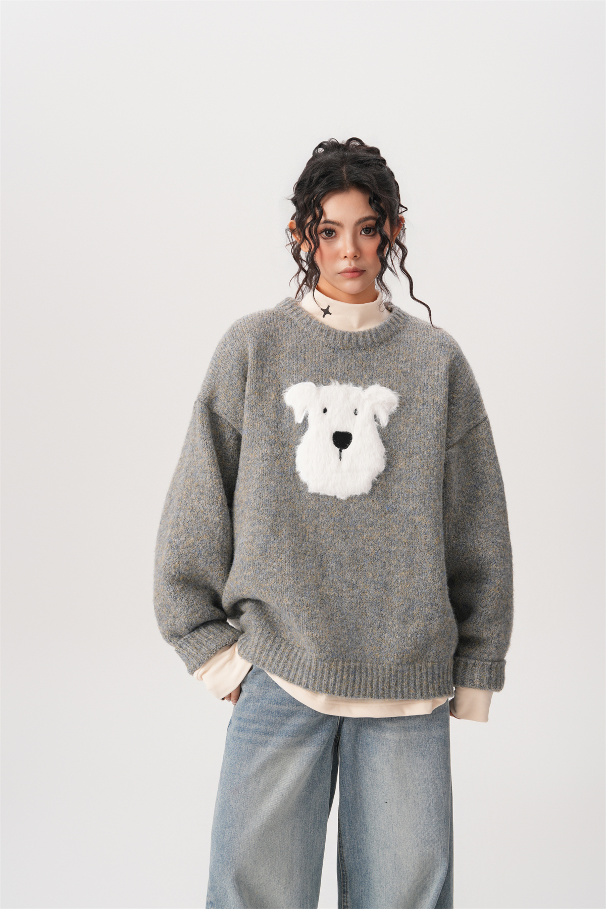 BWKA韓系毛絨小狗提花毛衣女男秋冬重磅寬松加厚慵懶風軟糯針織衫