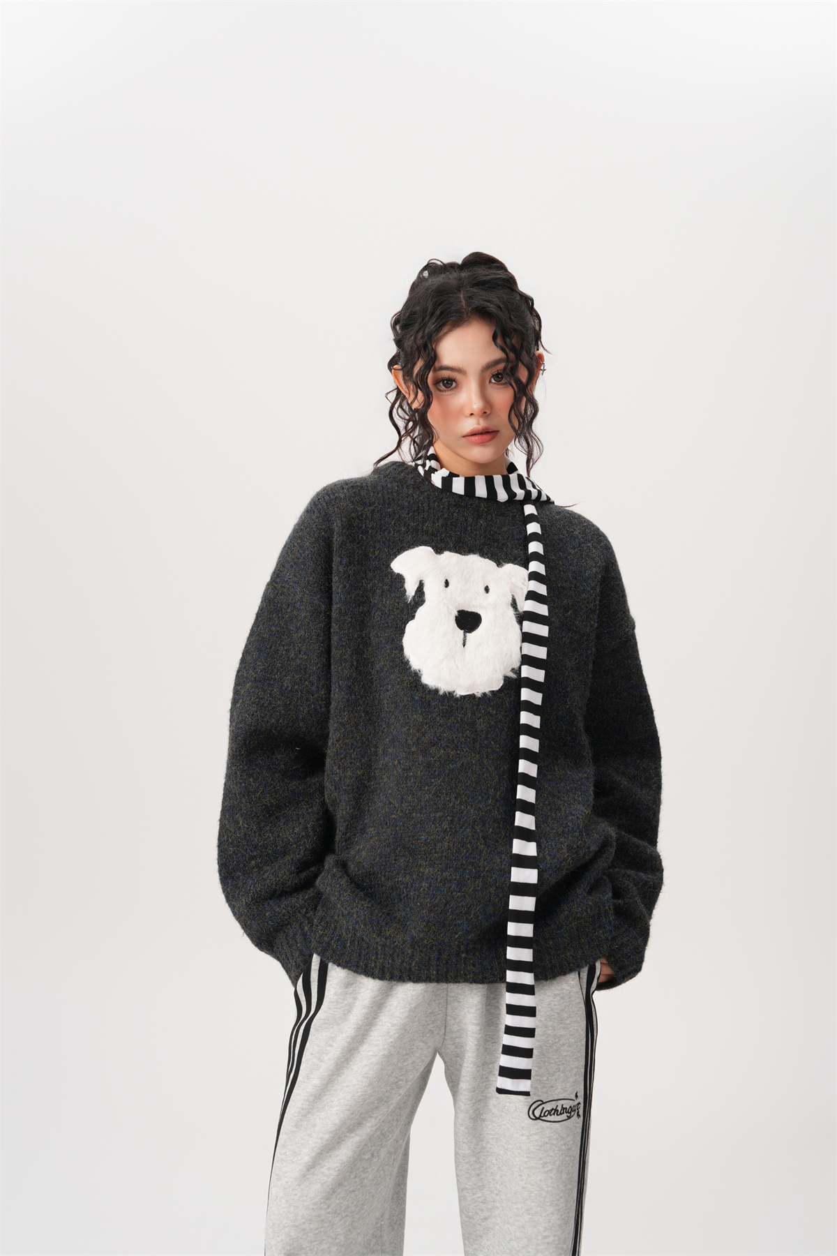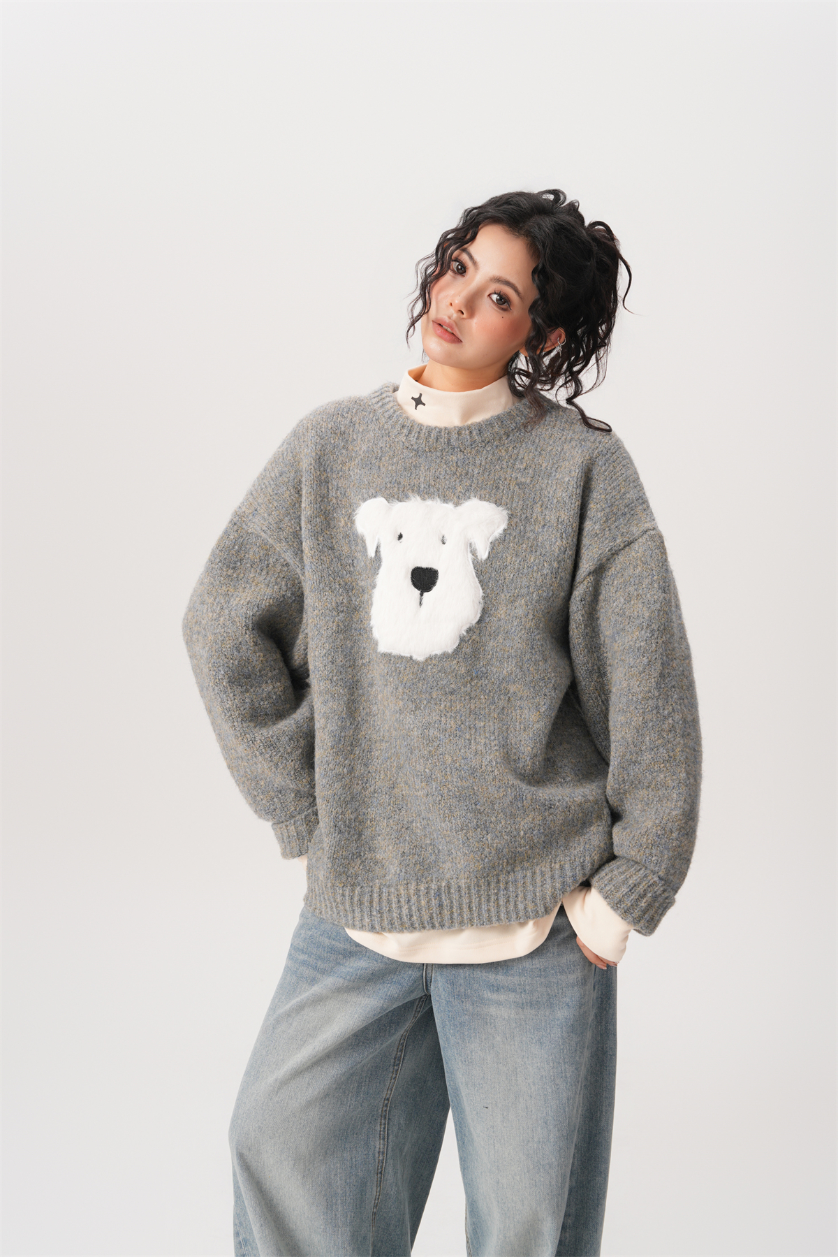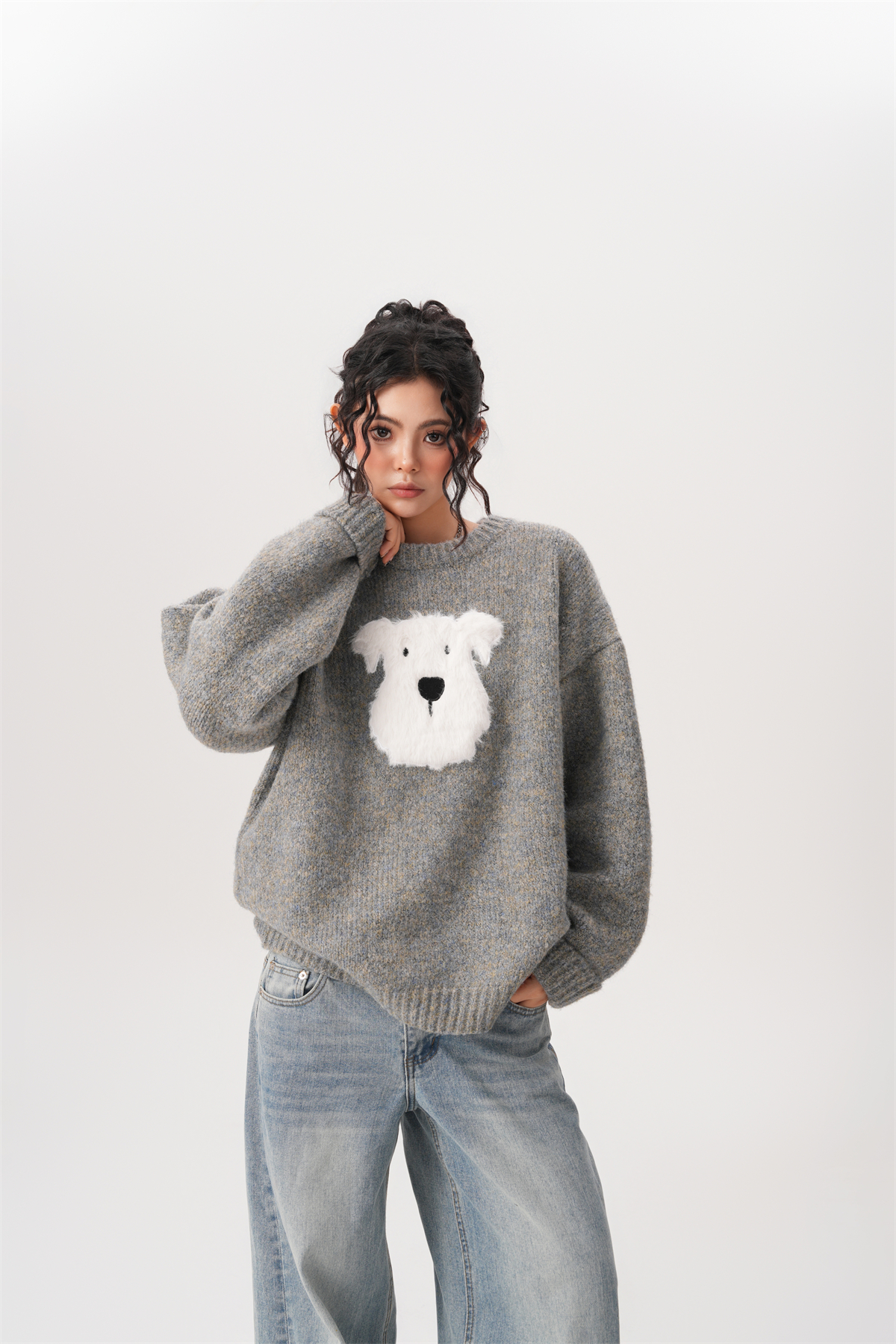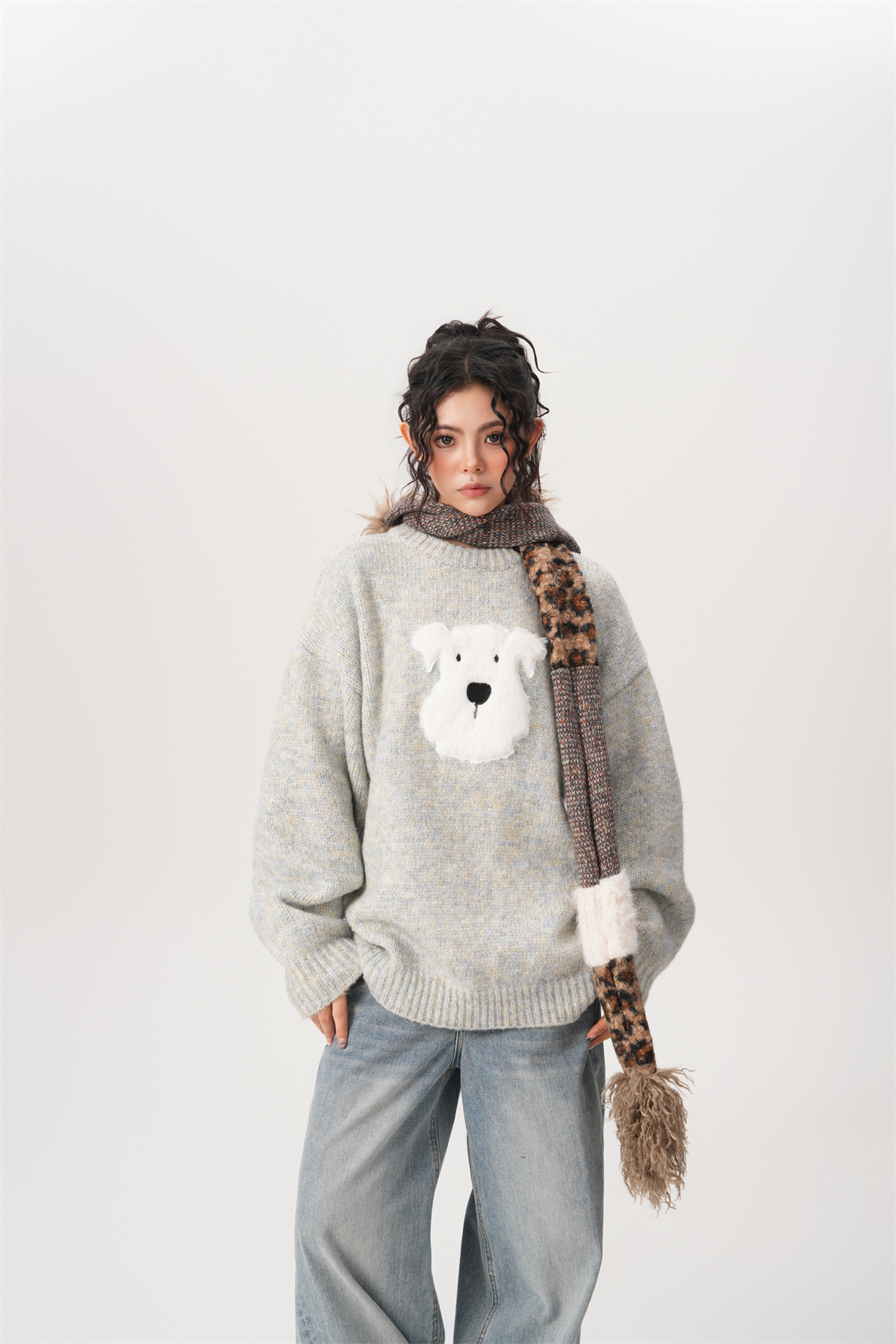 BWKA韓系毛絨小狗提花毛衣女男秋冬重磅寬松加厚慵懶風軟糯針織衫