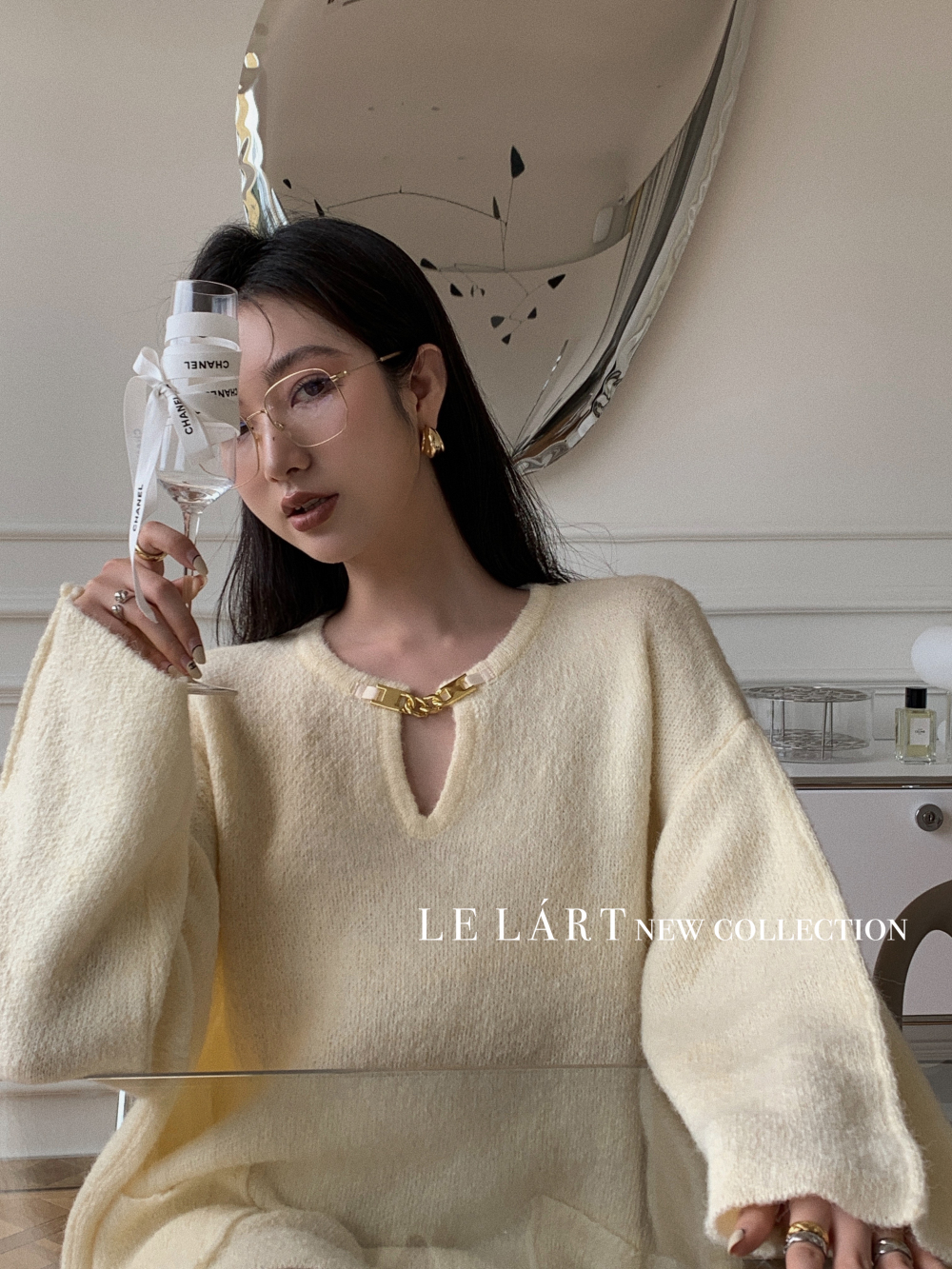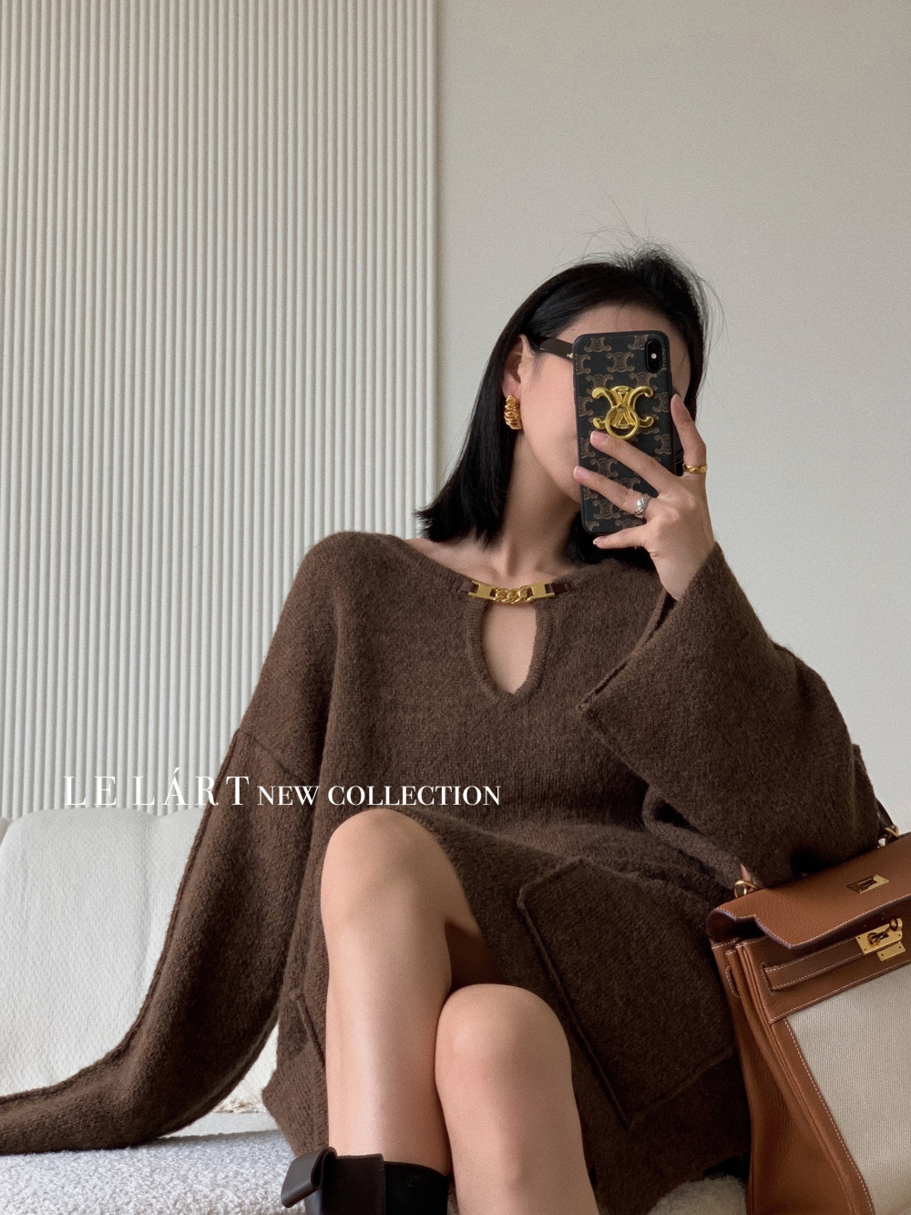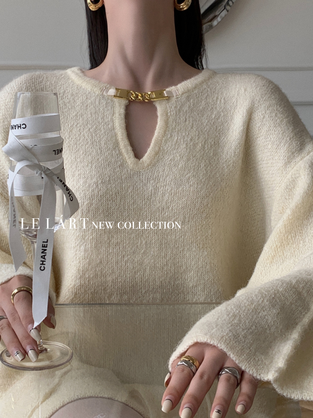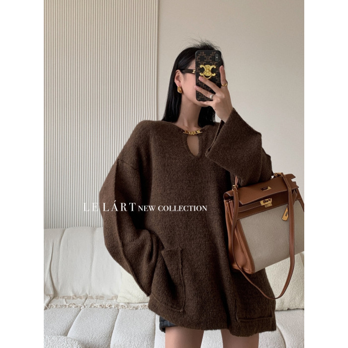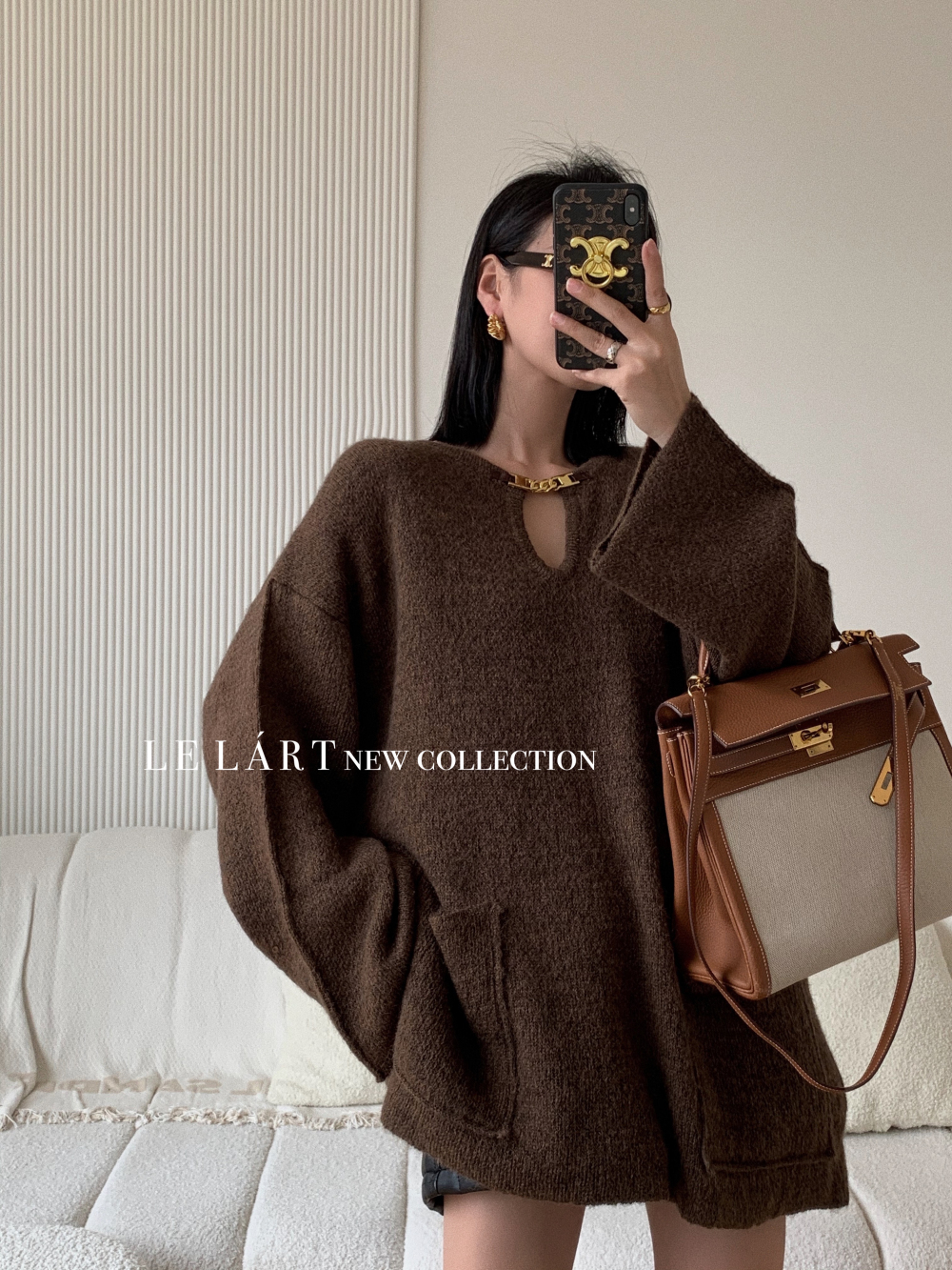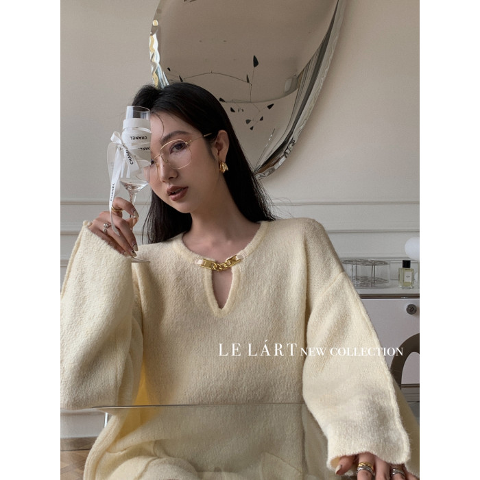 2025冬季新款韓版設計感鏈子中長款寬松毛衣女小衆懶惰風針織上衣