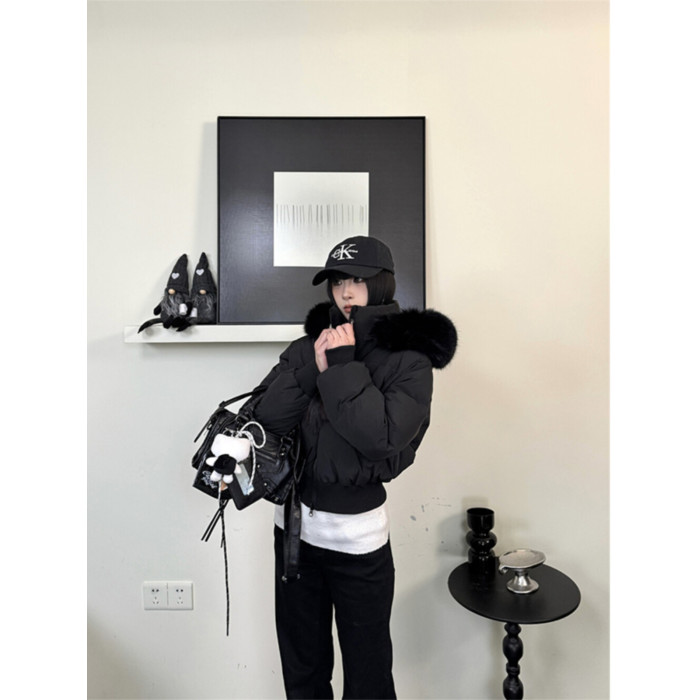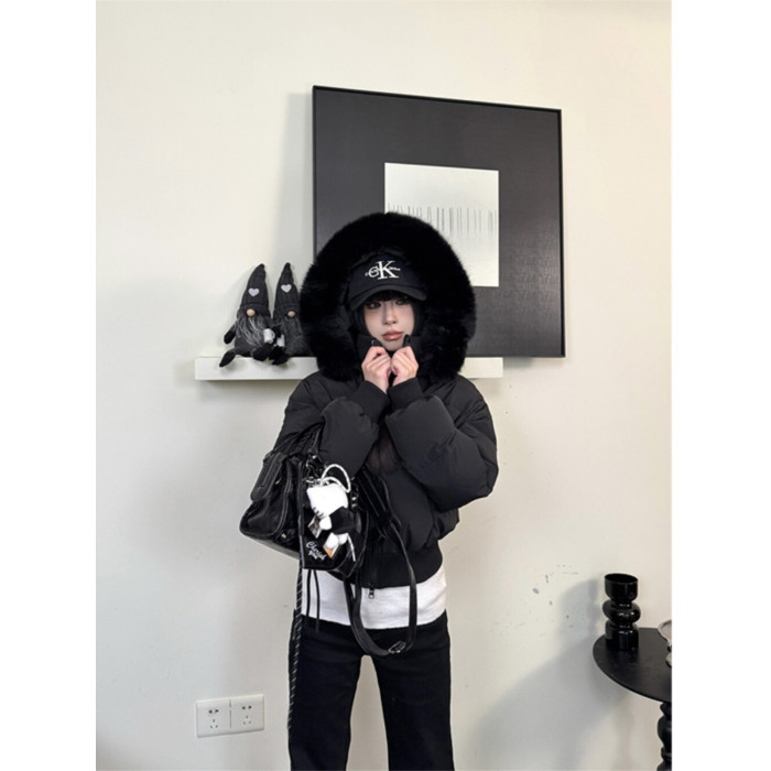 黑色大毛領連帽羽絨棉服女冬季2025新款美式加厚保暖短款棉衣外套