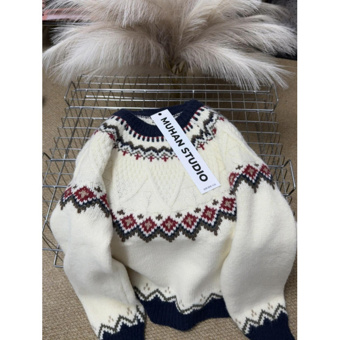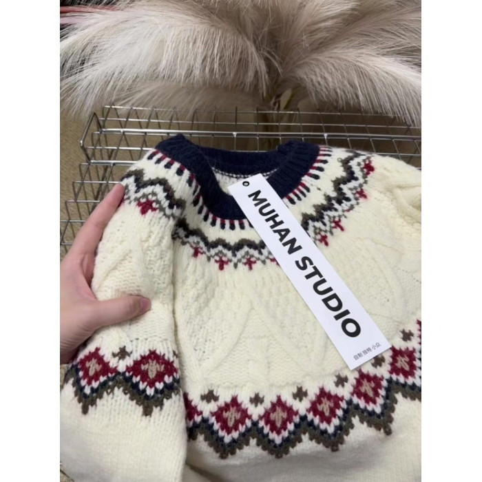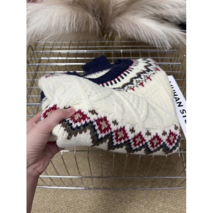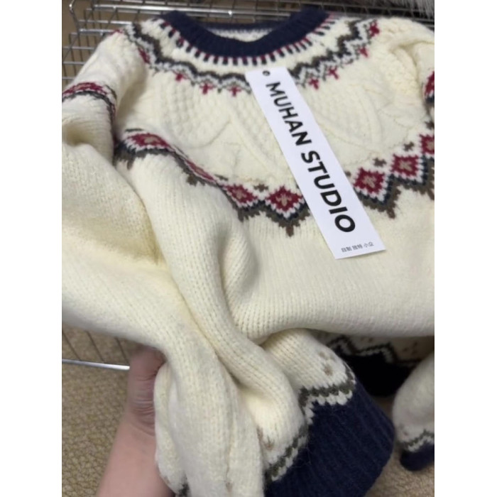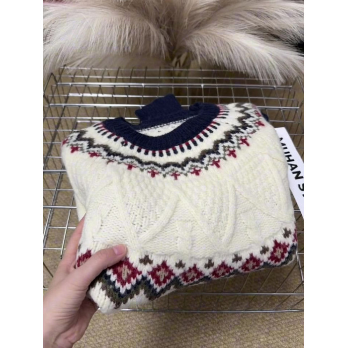 慵懶白色費爾島毛衣女秋冬加厚寬松高級感可外穿內搭套頭針織上衣