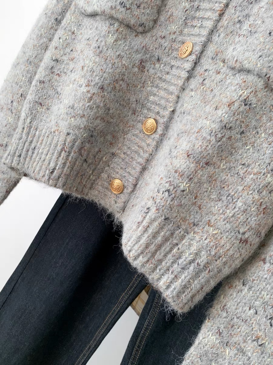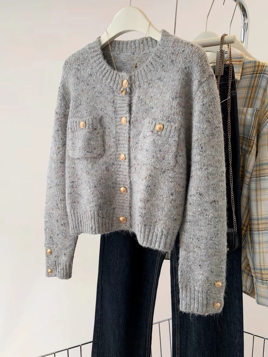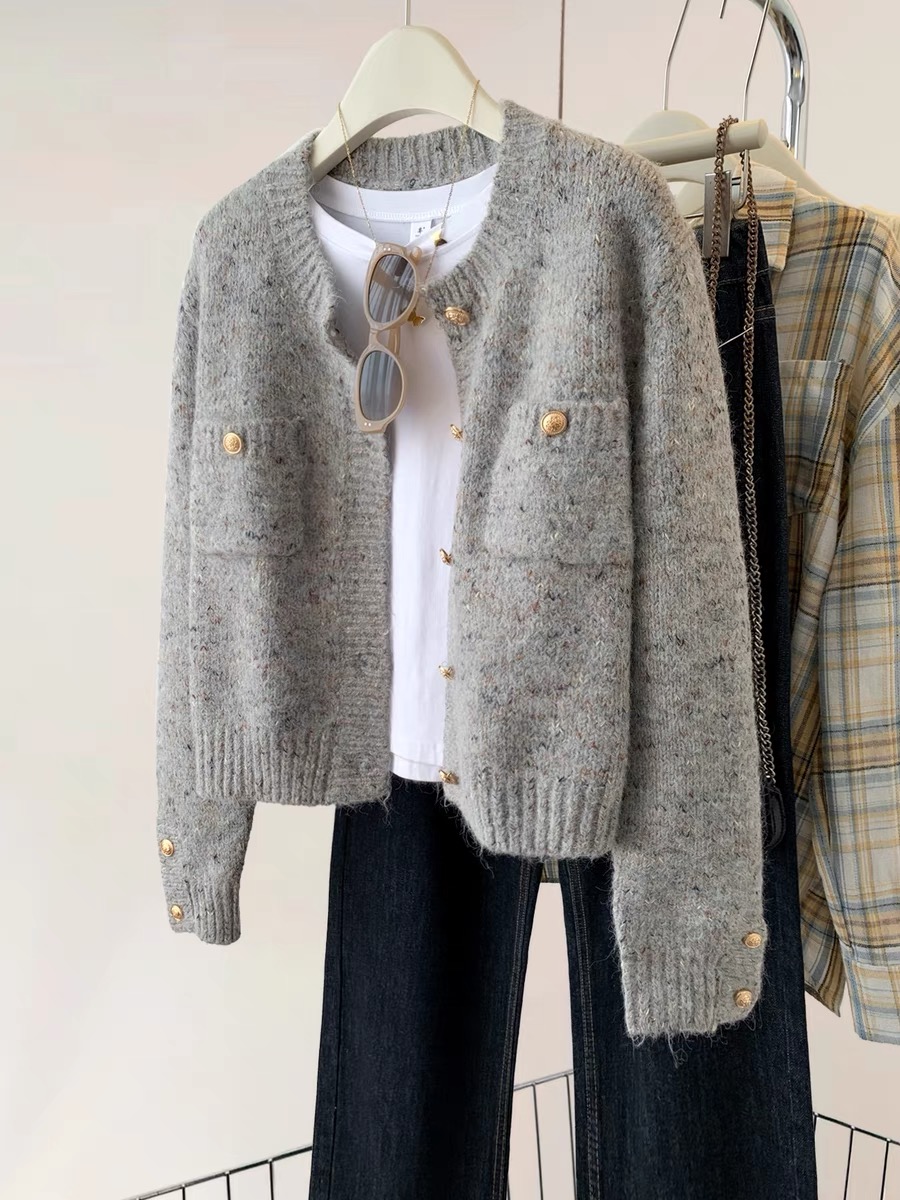 小香風灰色毛衣外套女款秋冬高級感大朗針織開衫獨特漂亮短款上衣