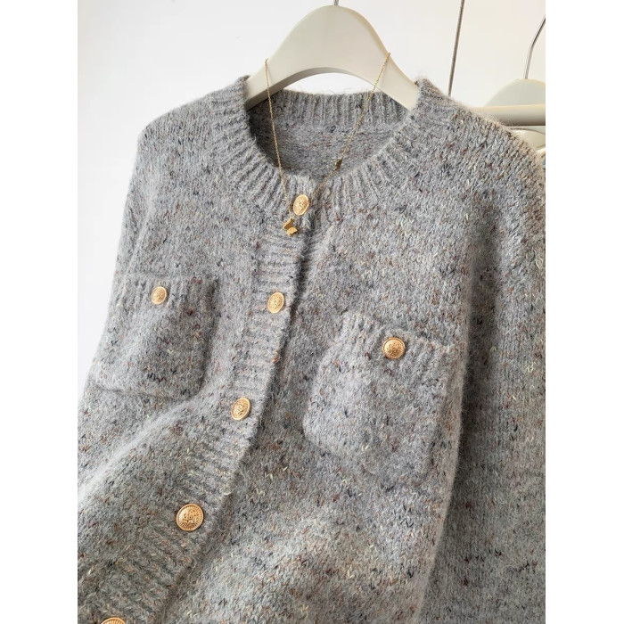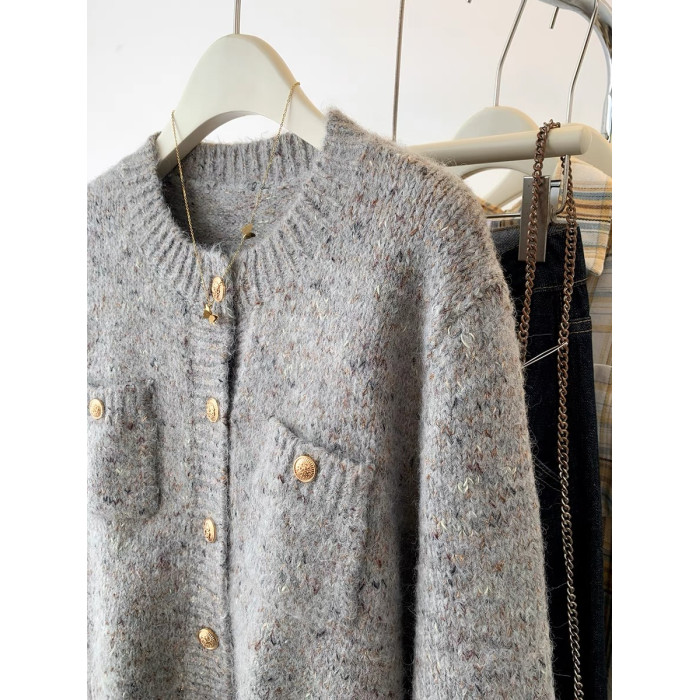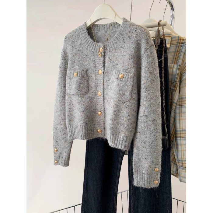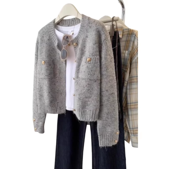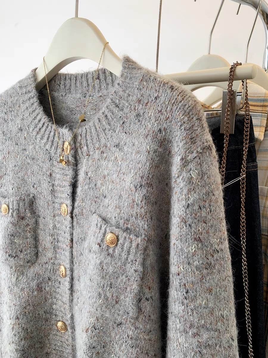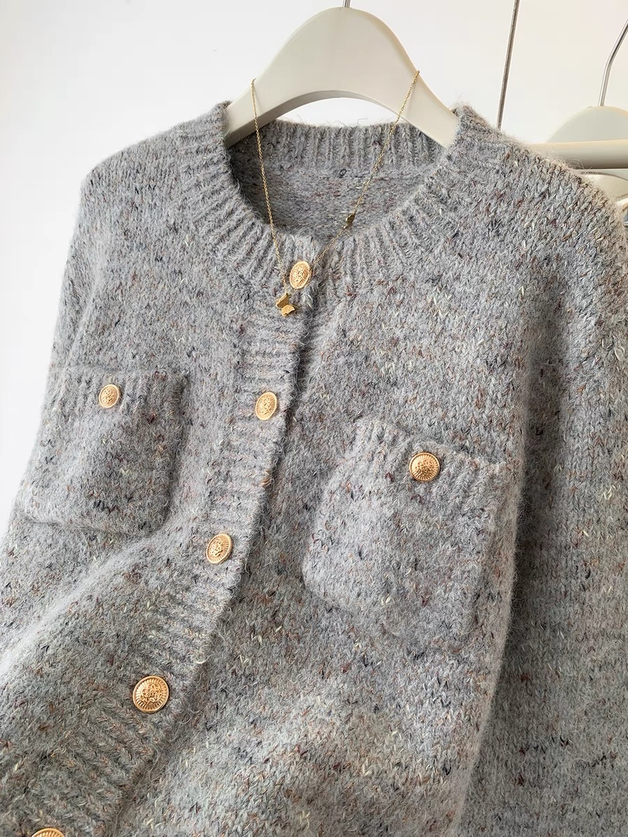 小香風灰色毛衣外套女款秋冬高級感大朗針織開衫獨特漂亮短款上衣