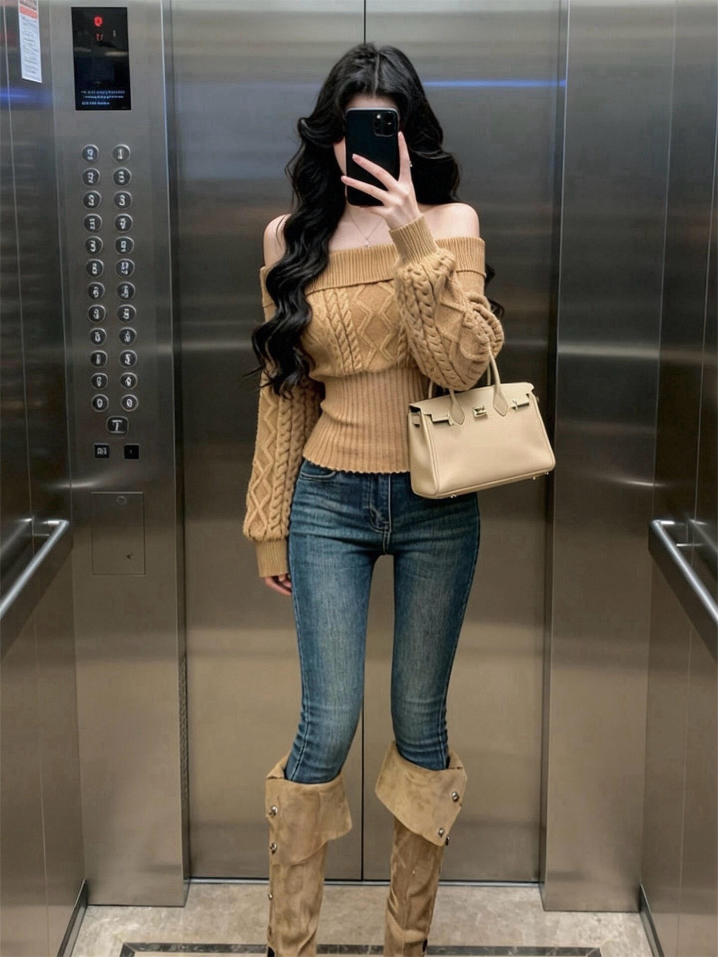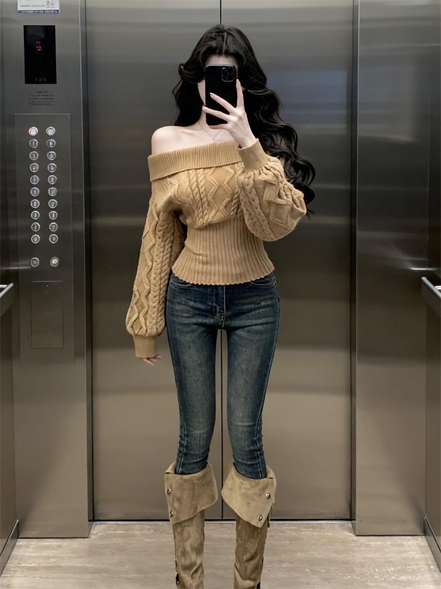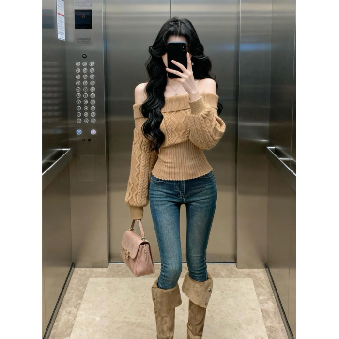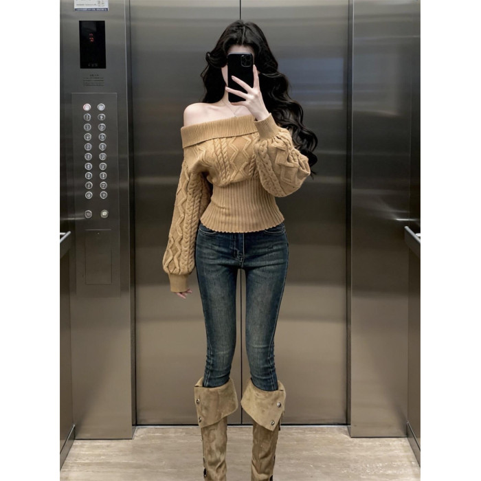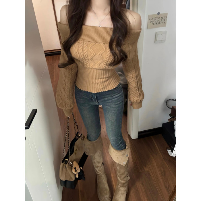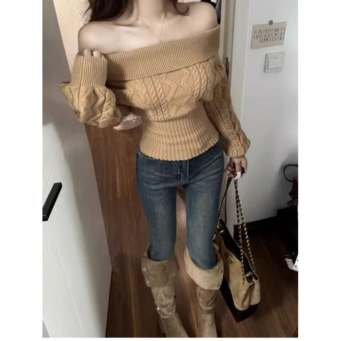 辣妹一字肩長袖毛衣女秋冬內搭可外穿套頭針織衫修身收腰打底上衣