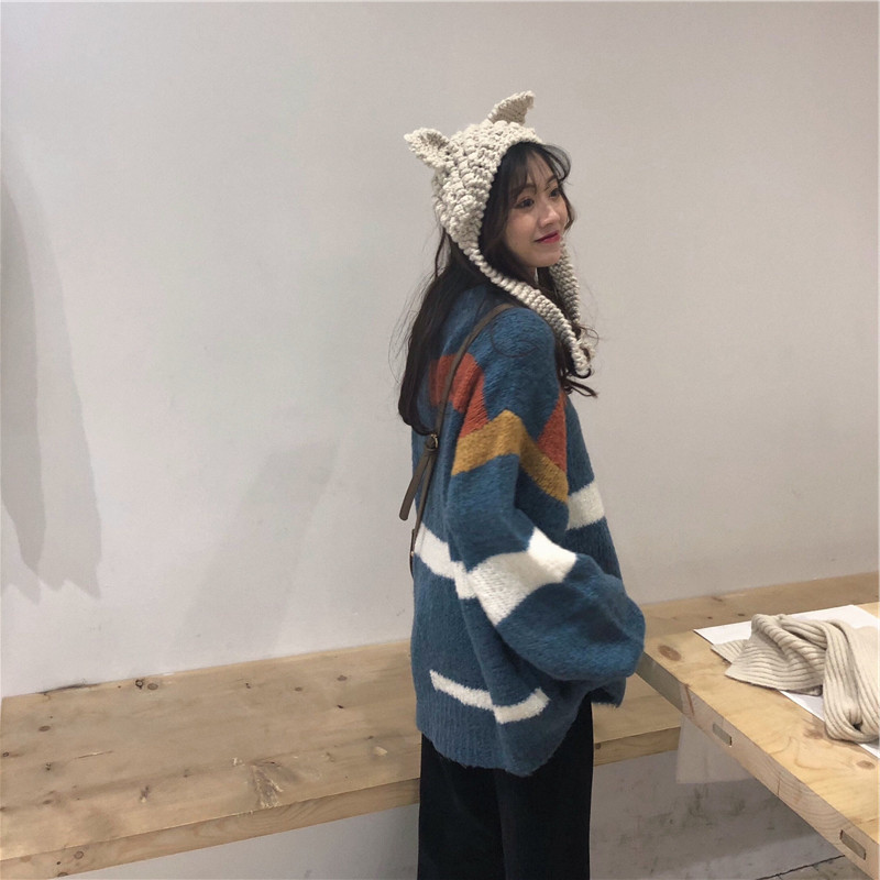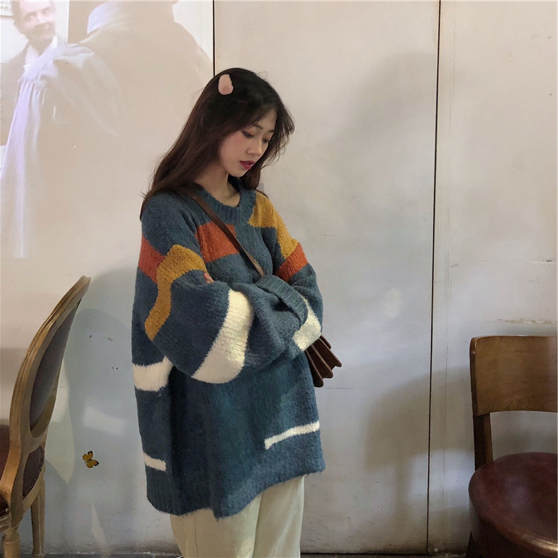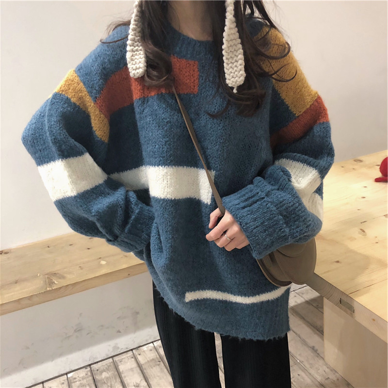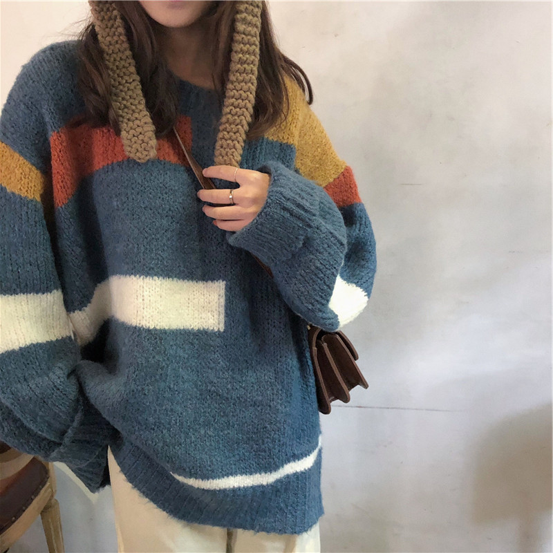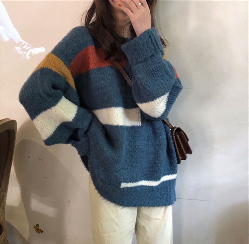 胖MM港風日系古著慵懶寬松彩虹毛衣女森系秋冬小個子外穿加厚毛衫