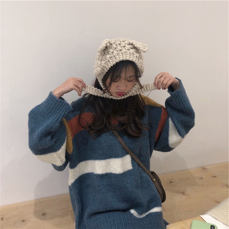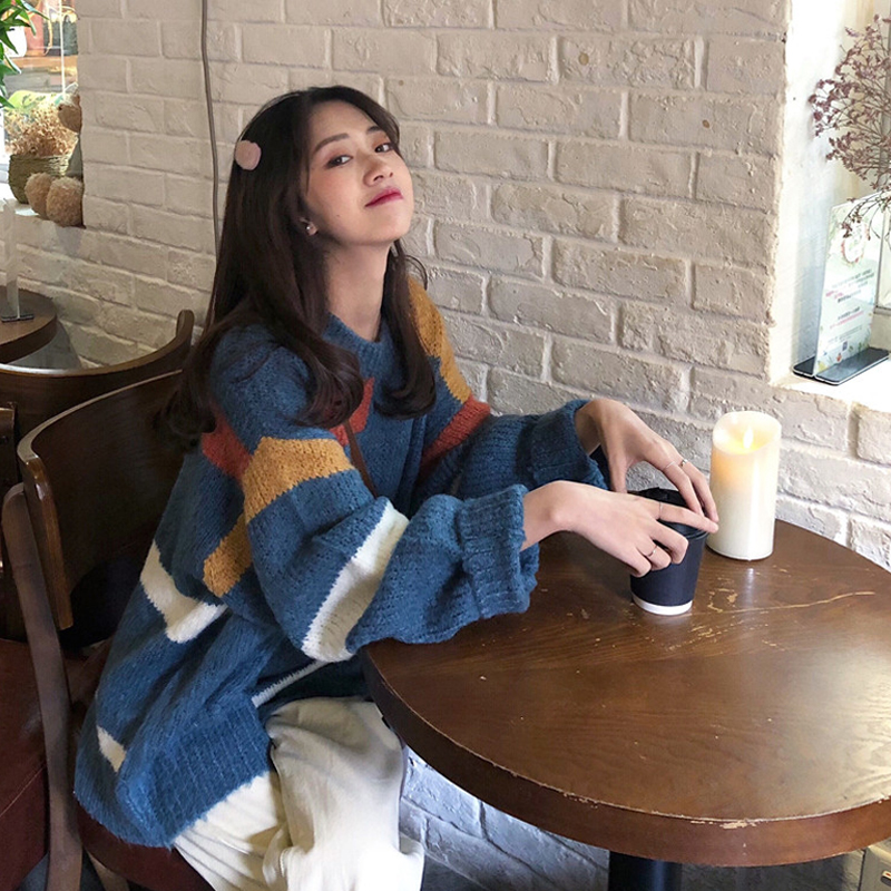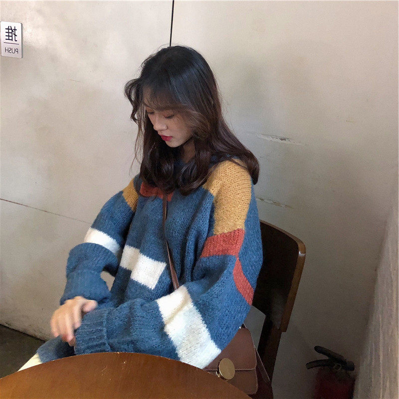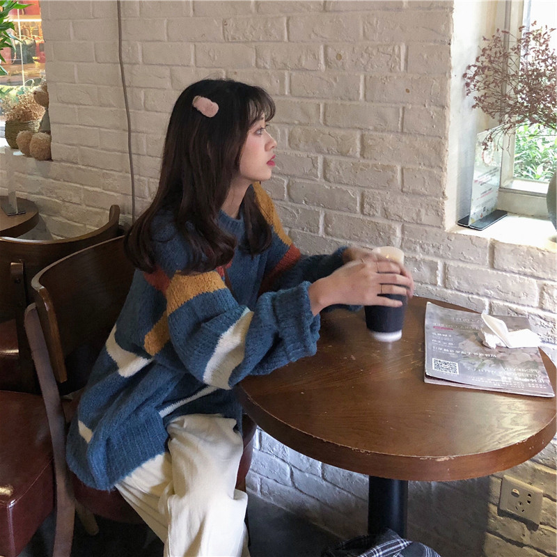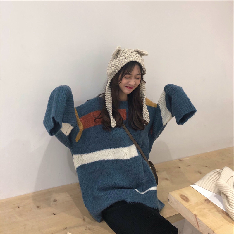 胖MM港風日系古著慵懶寬松彩虹毛衣女森系秋冬小個子外穿加厚毛衫