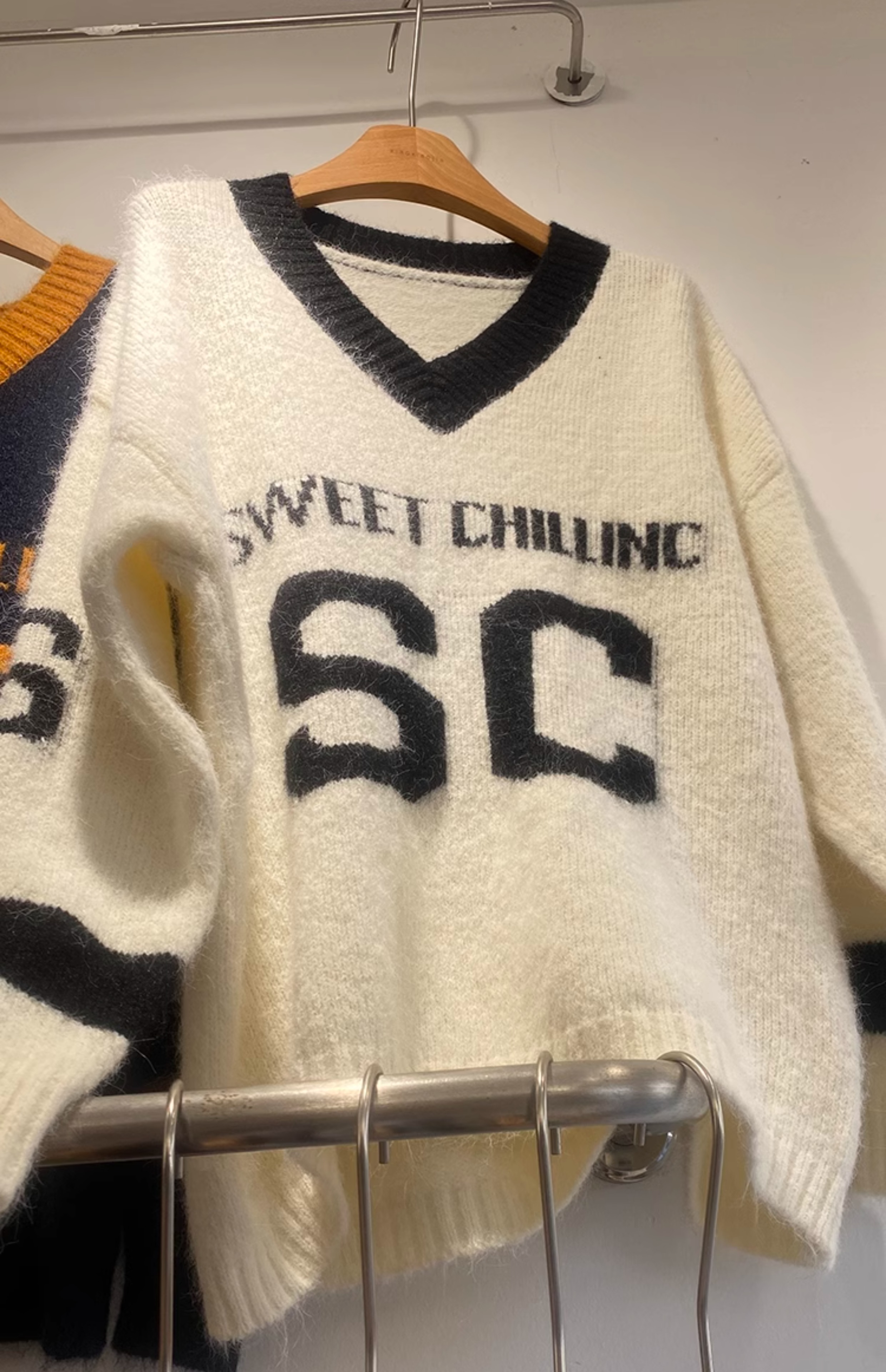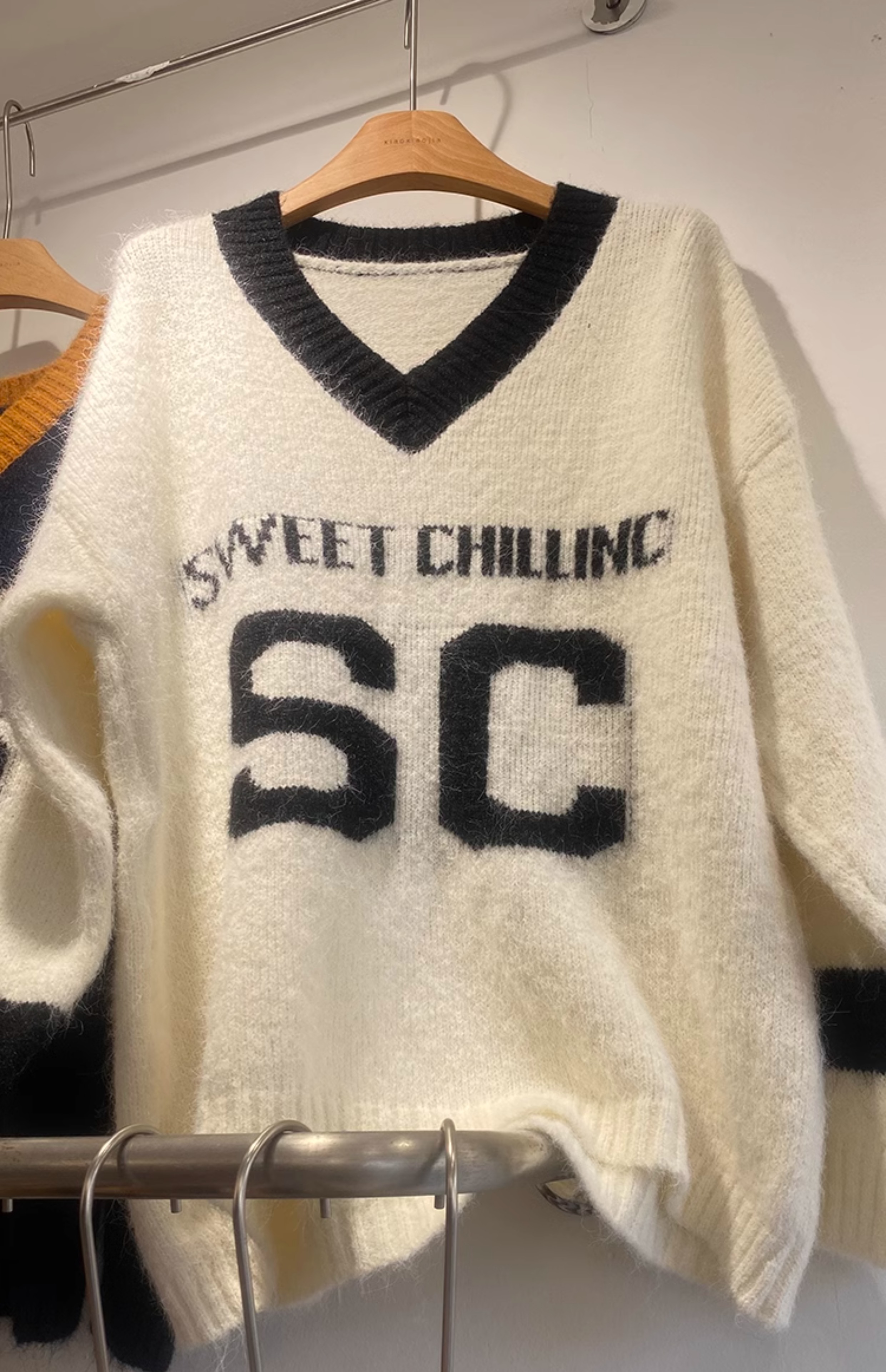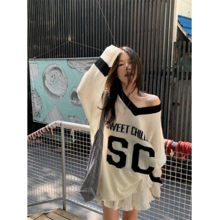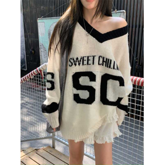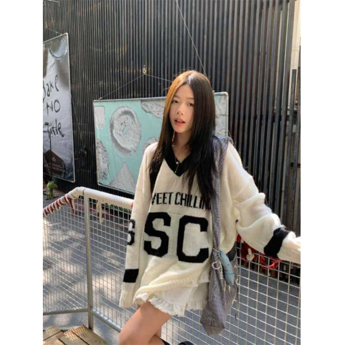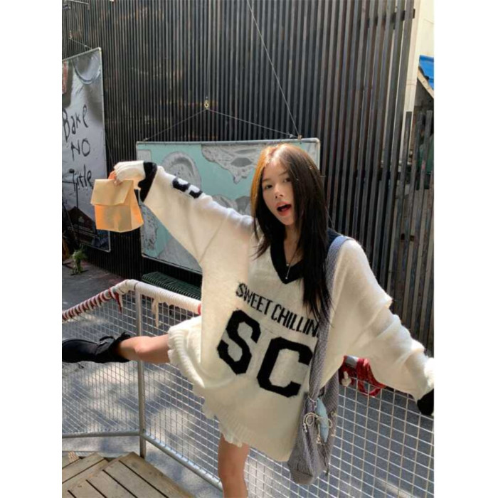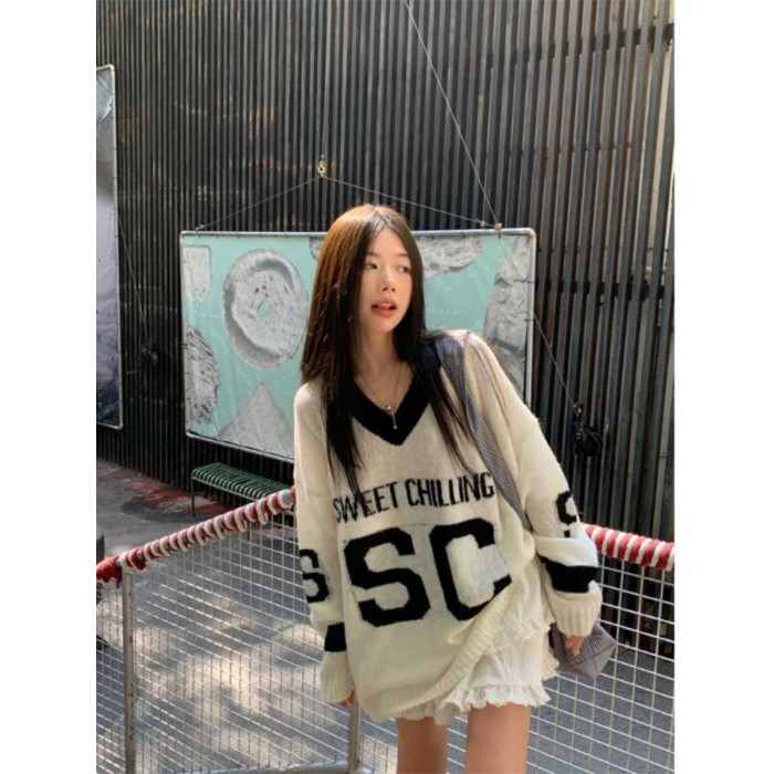 白色毛衣女早秋慵懶高級感v領上衣寬松運動風字母提花套頭針織衫