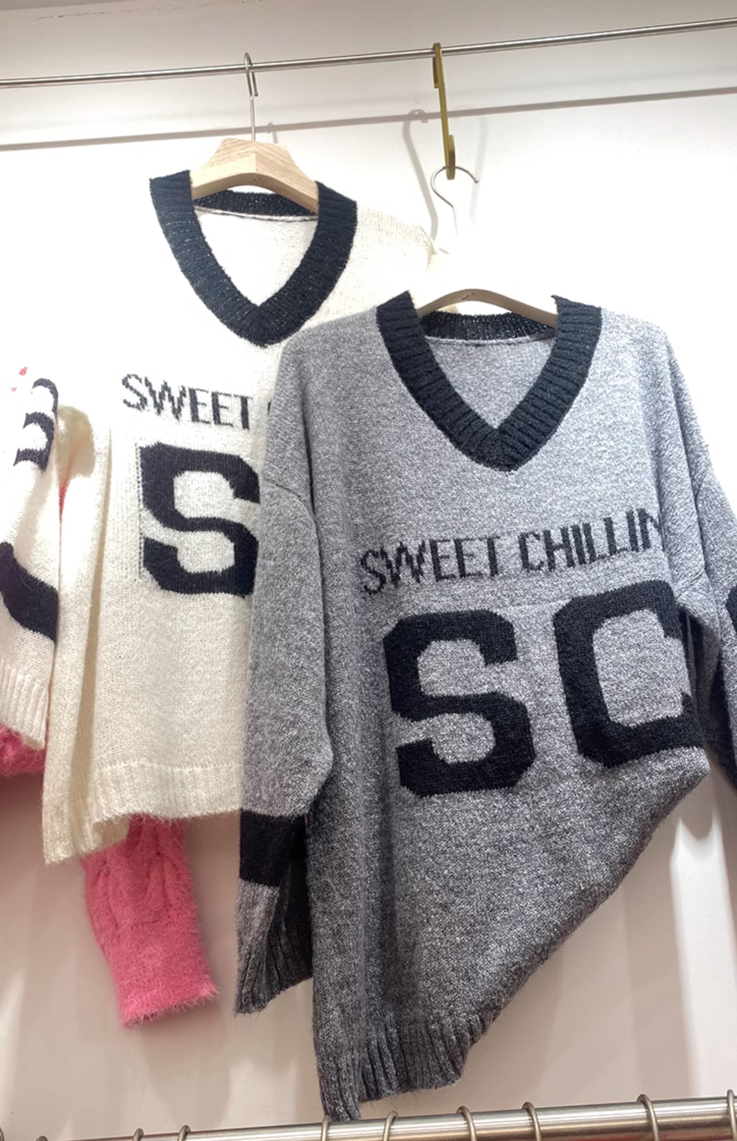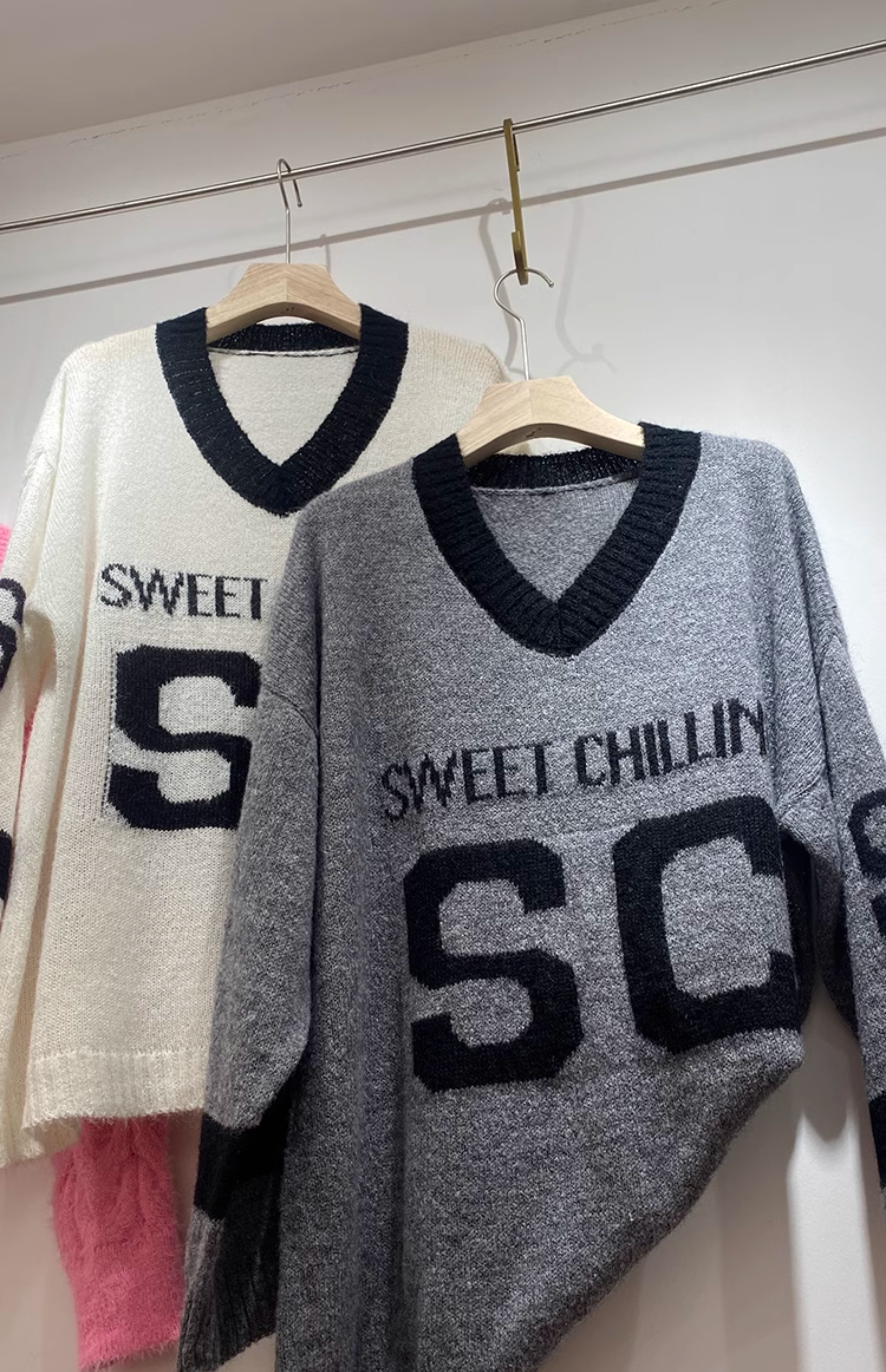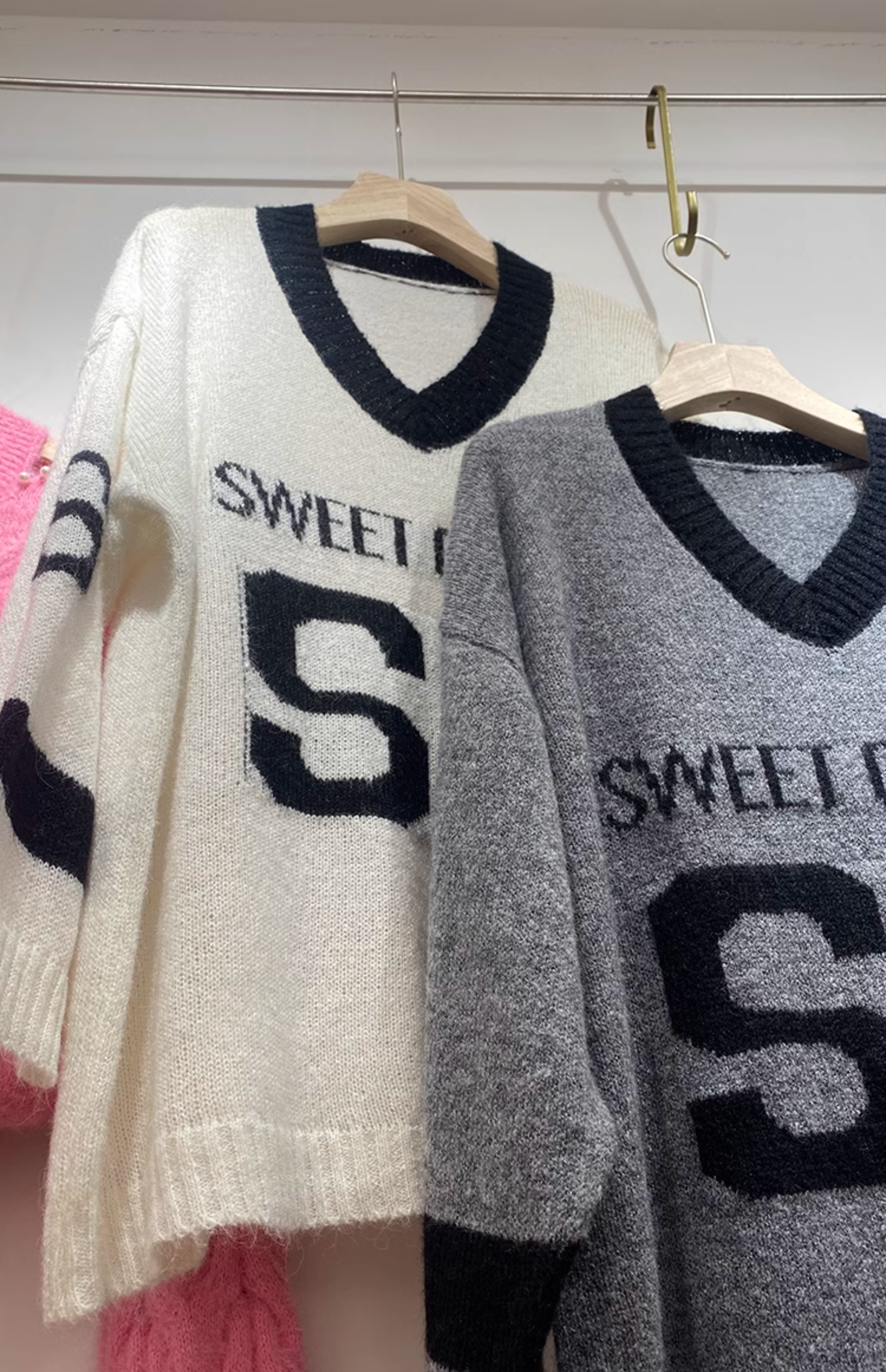 白色毛衣女早秋慵懶高級感v領上衣寬松運動風字母提花套頭針織衫