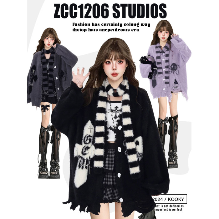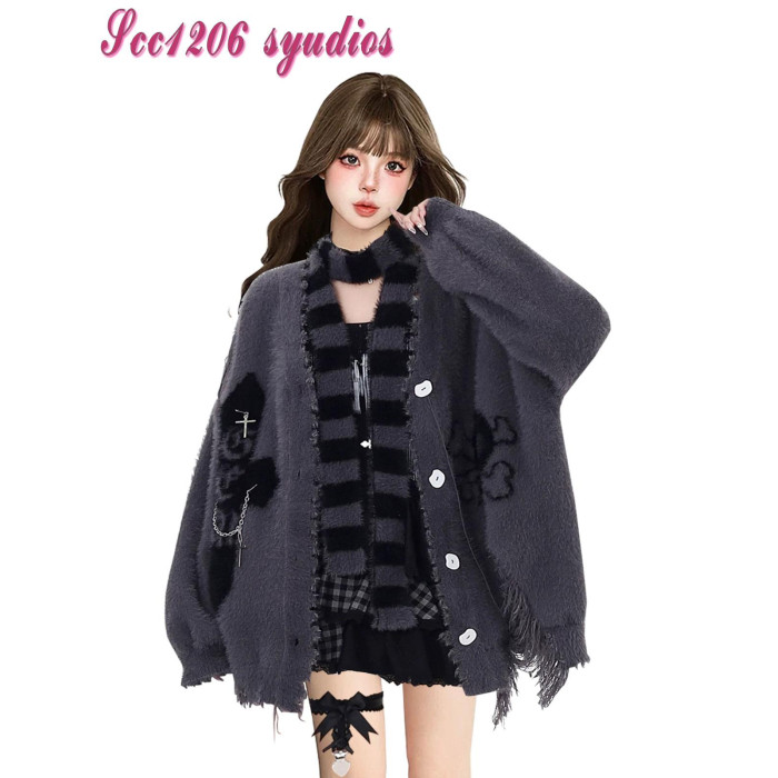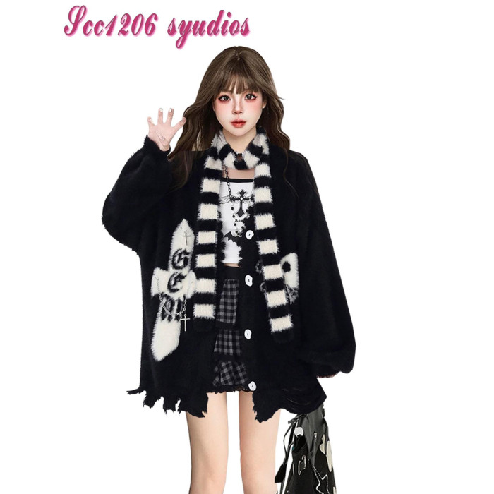 暗黑系y2k亞文化仿貂毛開衫圍脖毛衣女冬辣妹慵懶保暖針織衫外套