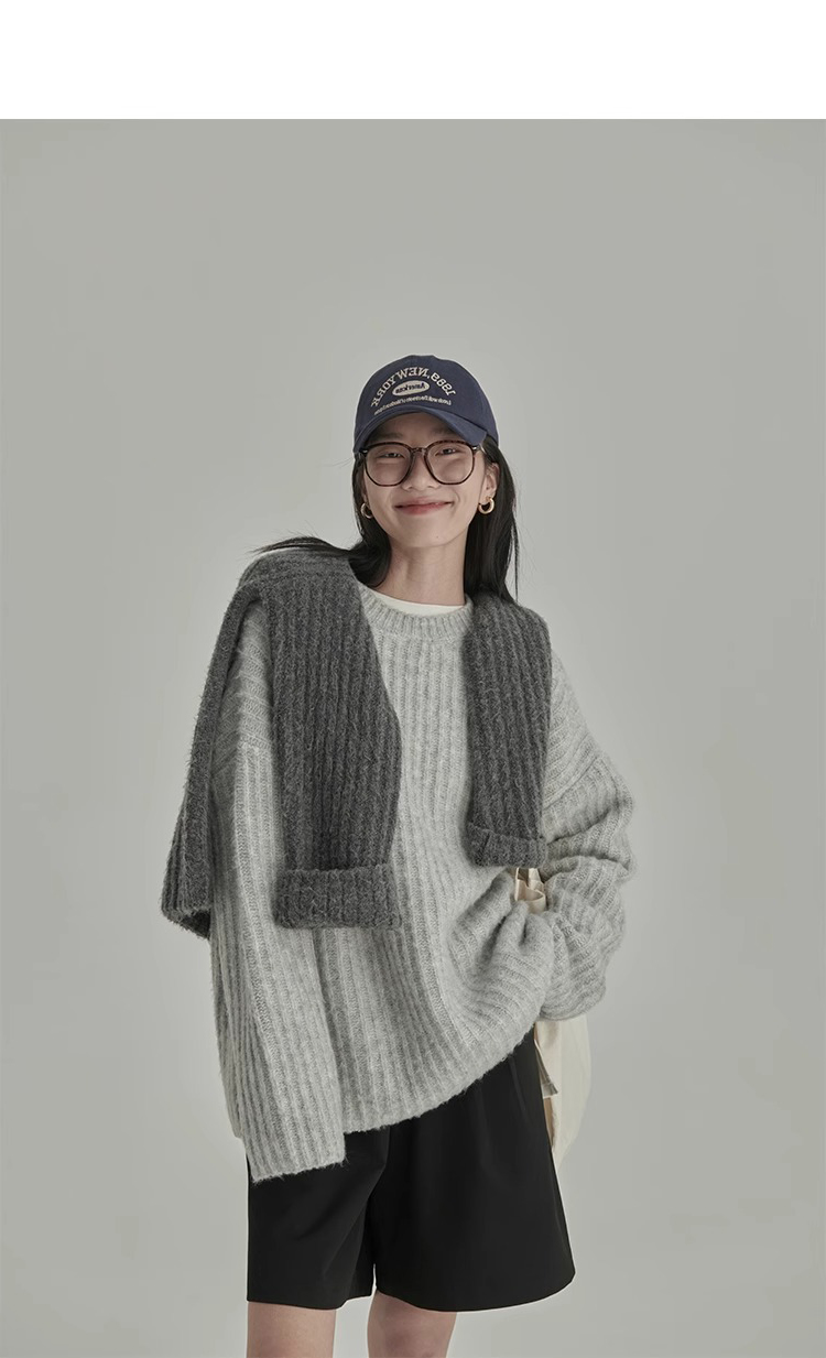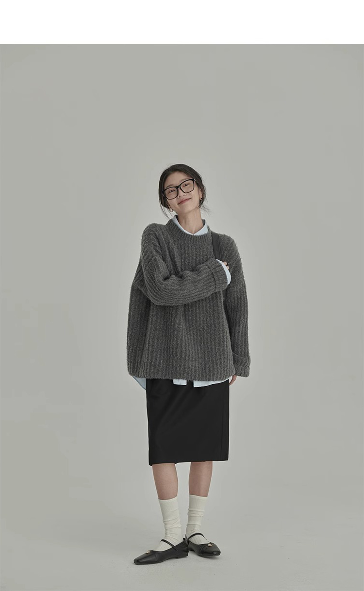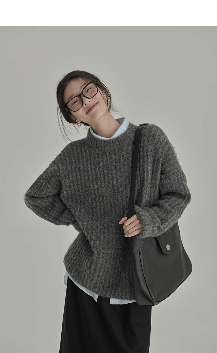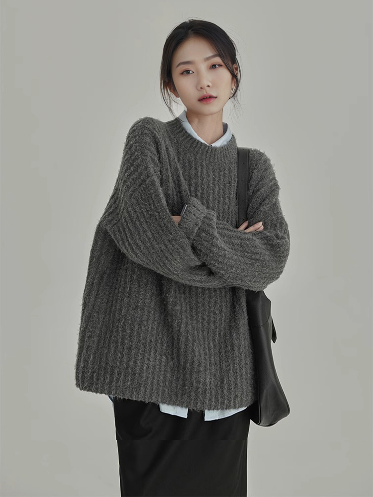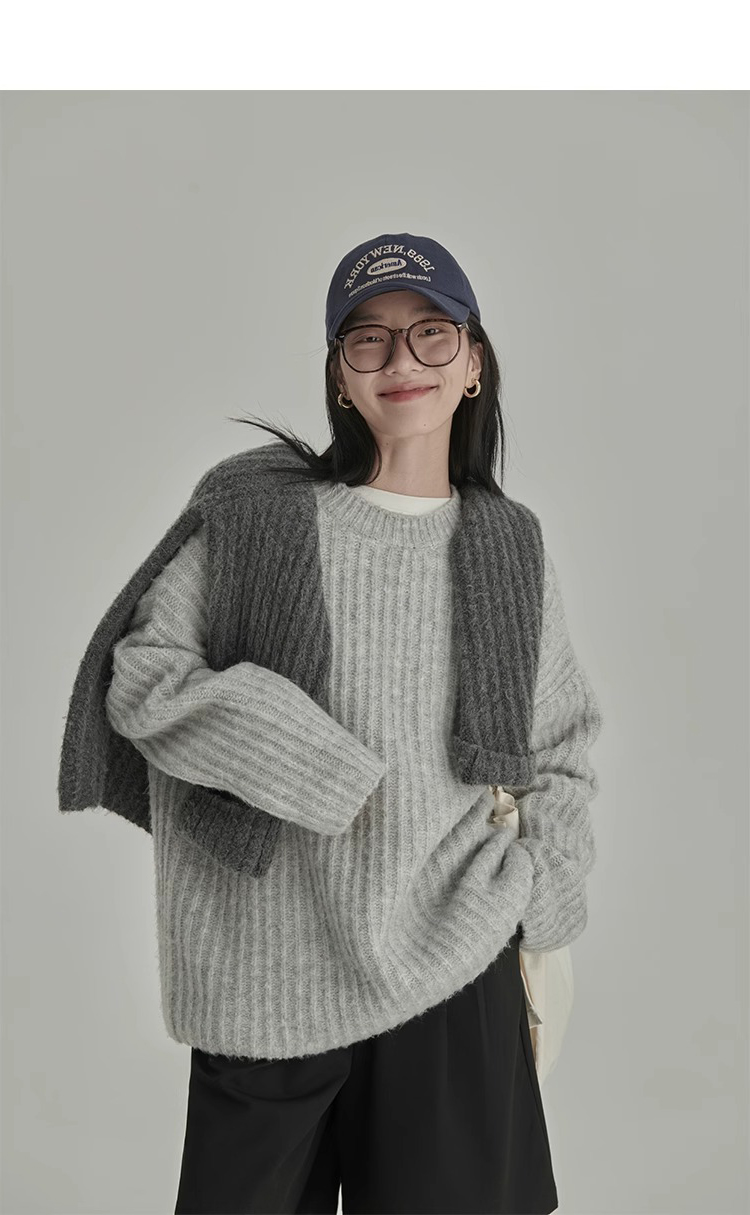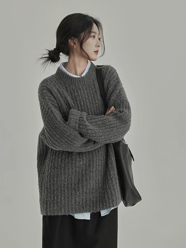 秋冬慵懶風坑條紋寬松加厚外穿套頭基礎款內搭復古針織衫毛衣女