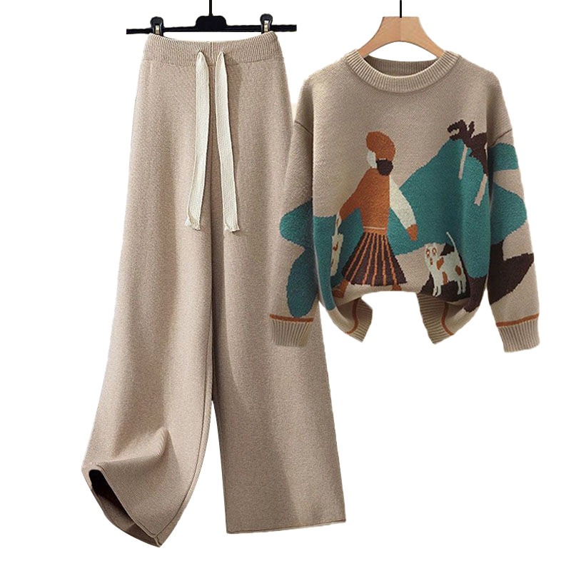 2025年新款針織毛衣女秋季寬松顯瘦設計感遮肉百搭直筒濶腿褲套裝