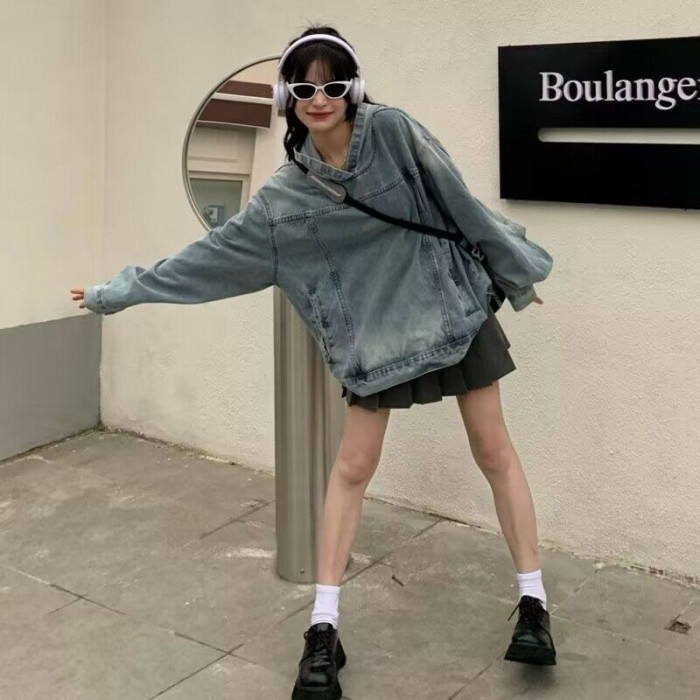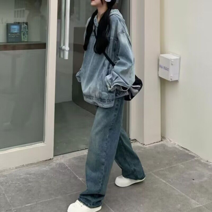 ins明星同款情侶高街復古水洗磨白牛仔套頭連帽衛衣甜酷上衣學生