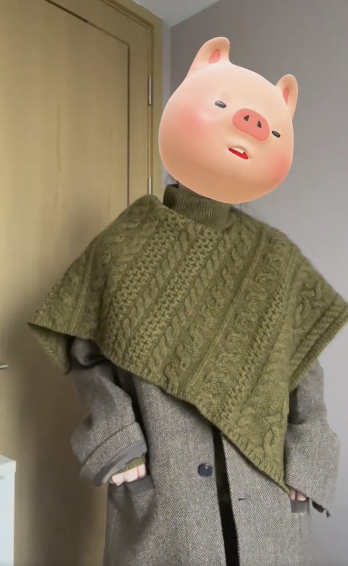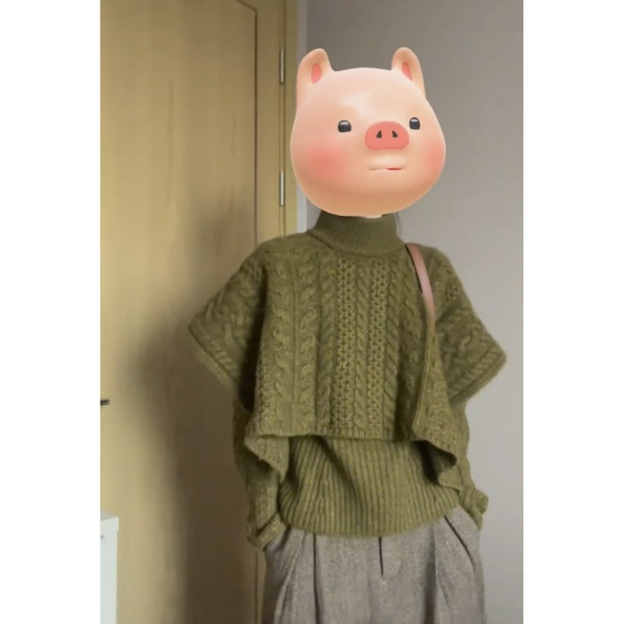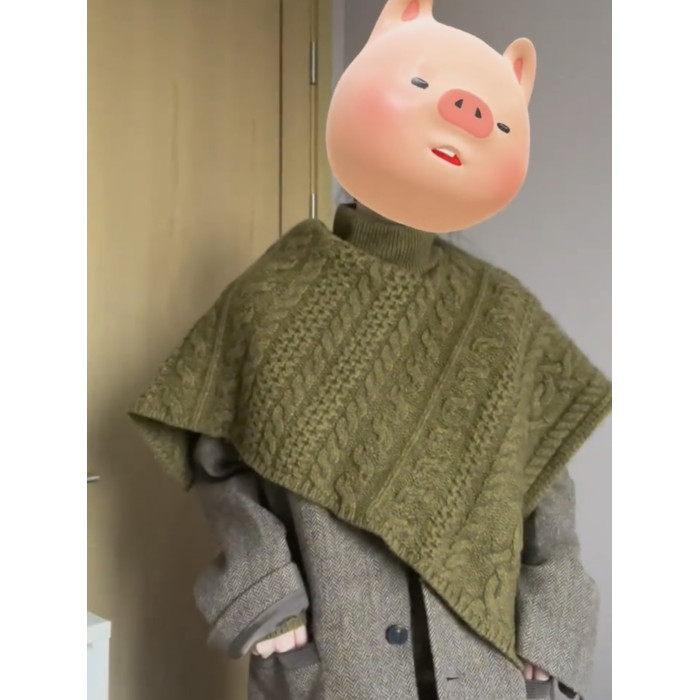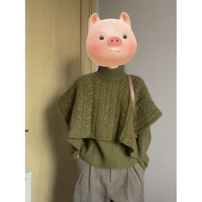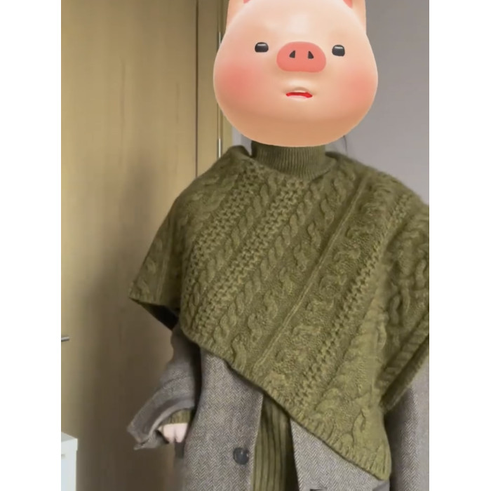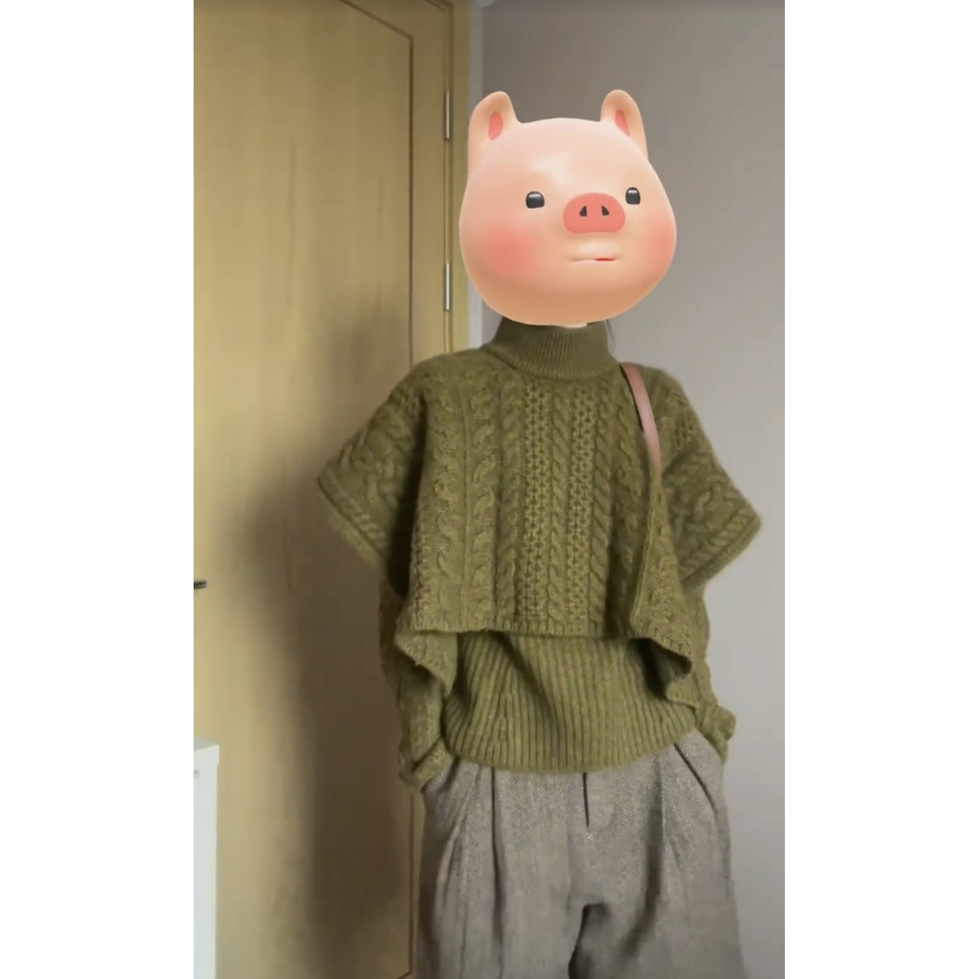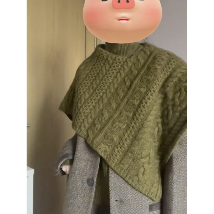 復古高級感綠色兩件套高領毛衣女秋冬設計感麻花披肩鬭篷針織衫厚