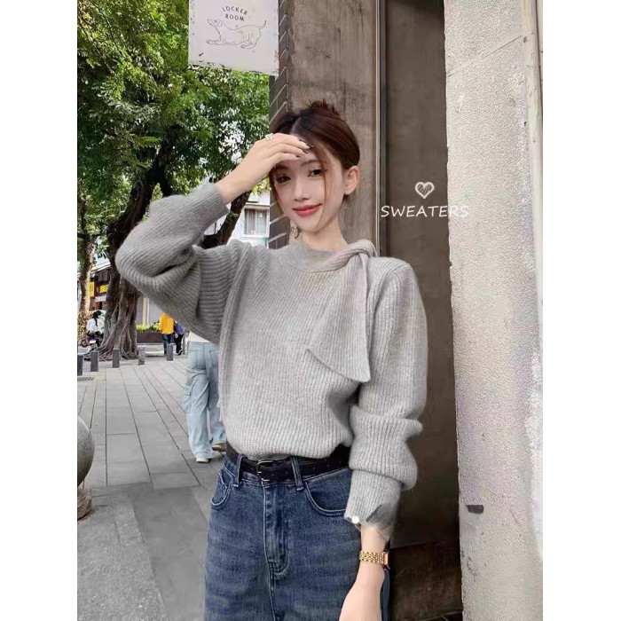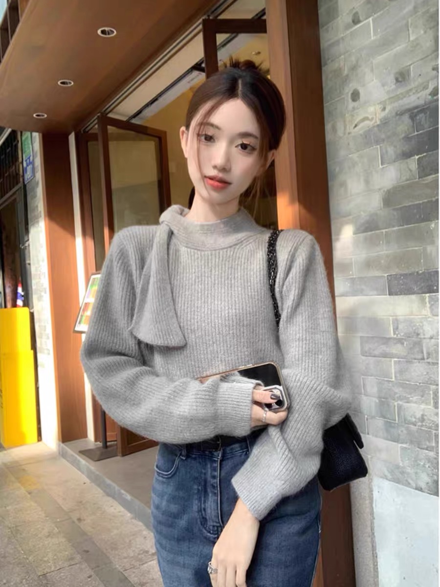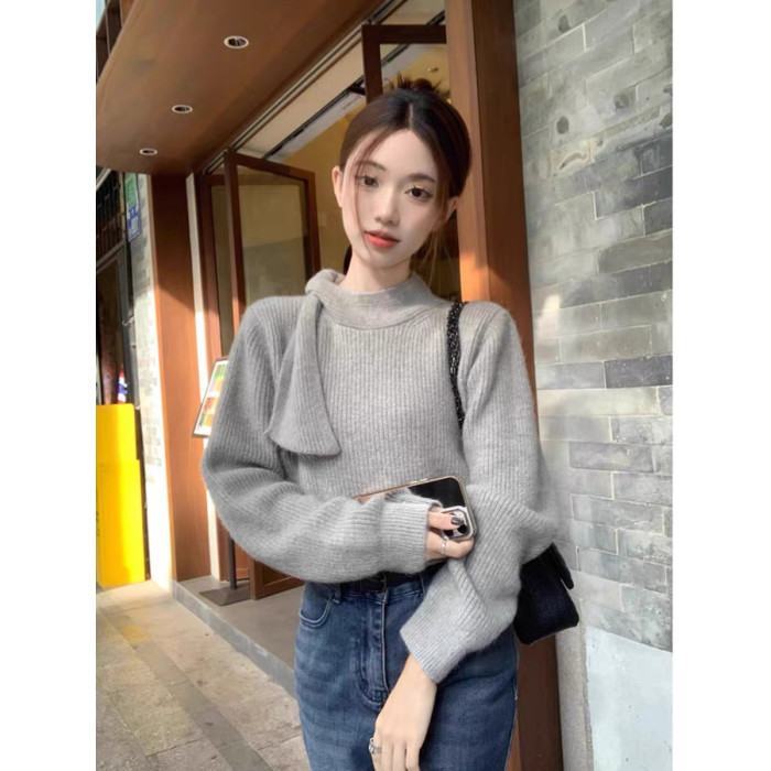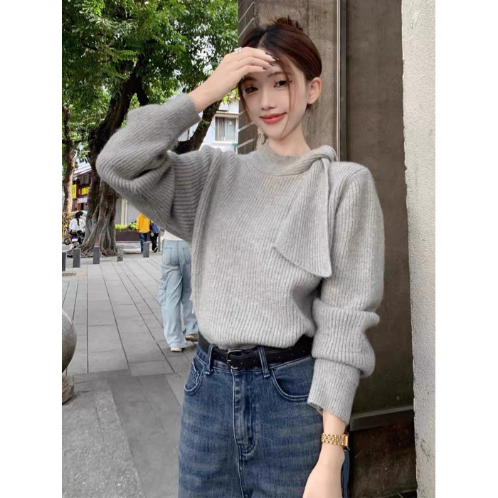 高級設計感韓系復古溫柔半高領綁帶灰色毛衣女秋冬新款針織衫上衣