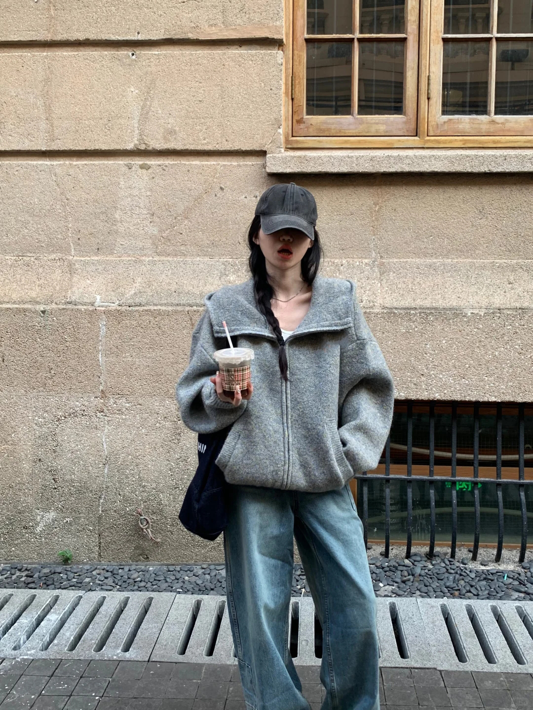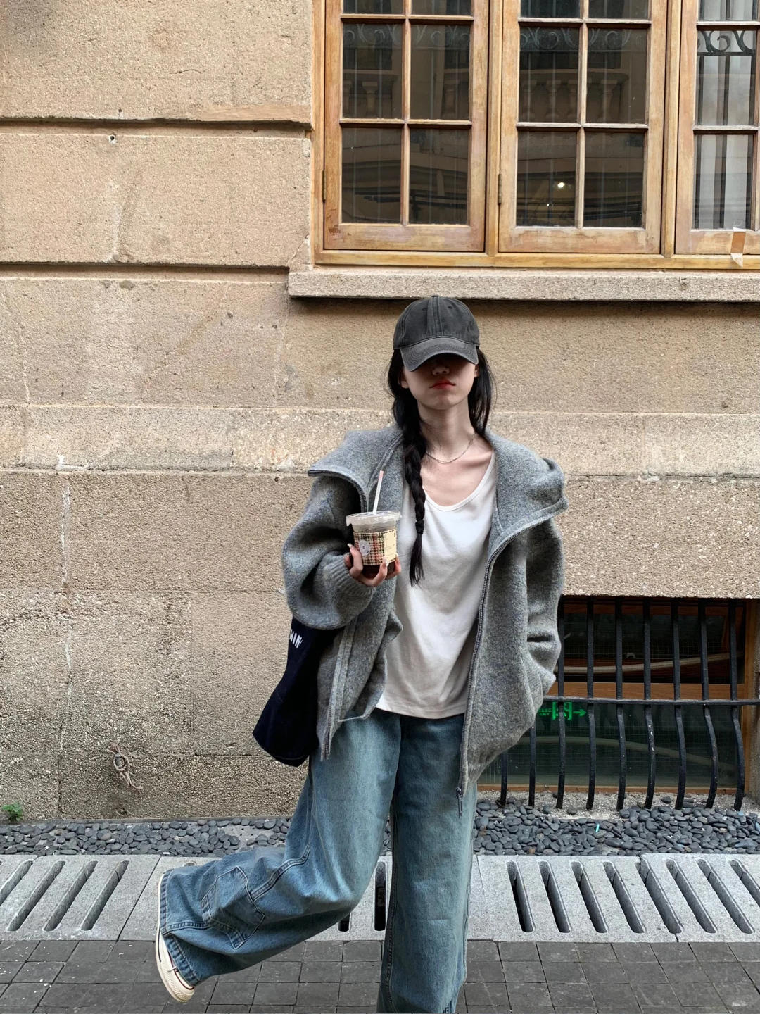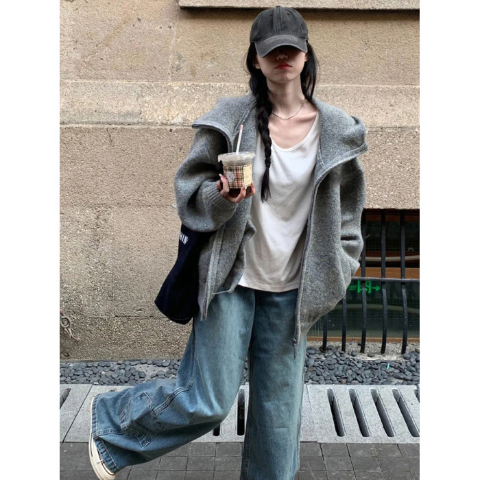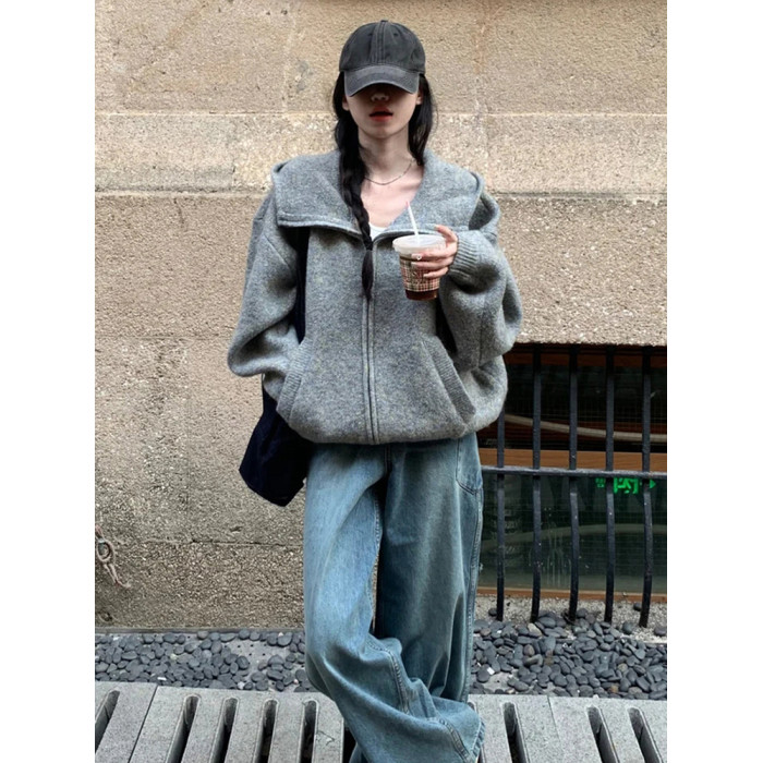 慵懶老錢風灰色連帽拉鍊毛衣外套女秋冬浣熊絨翻領針織衛衣開衫厚