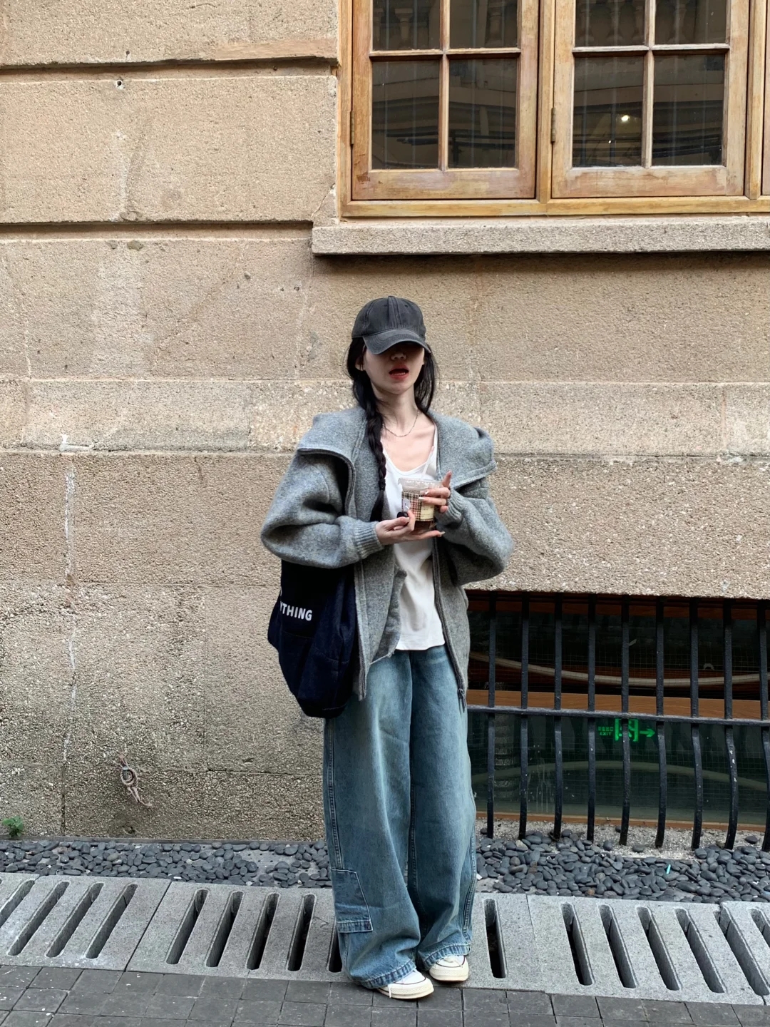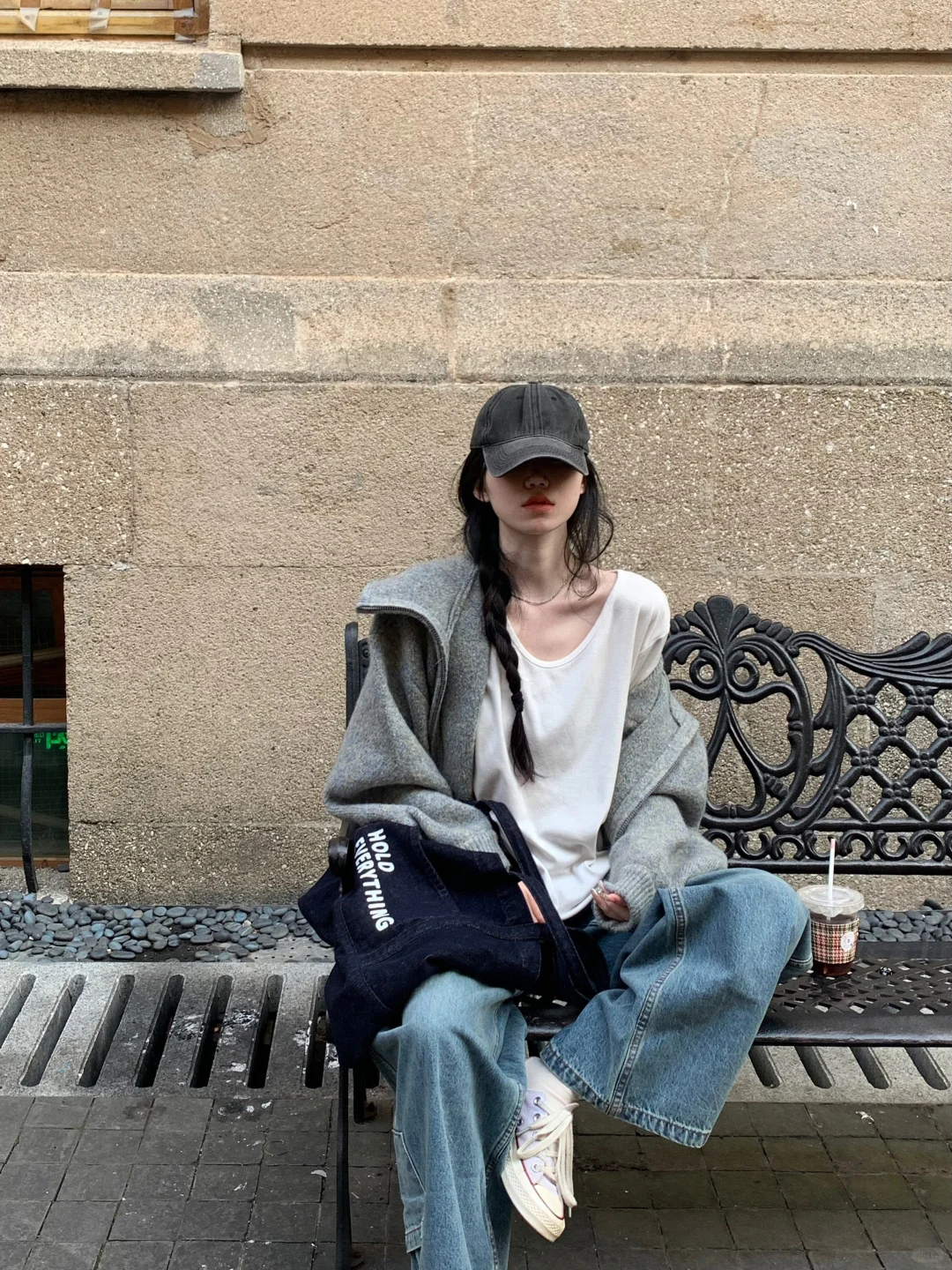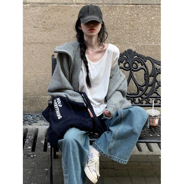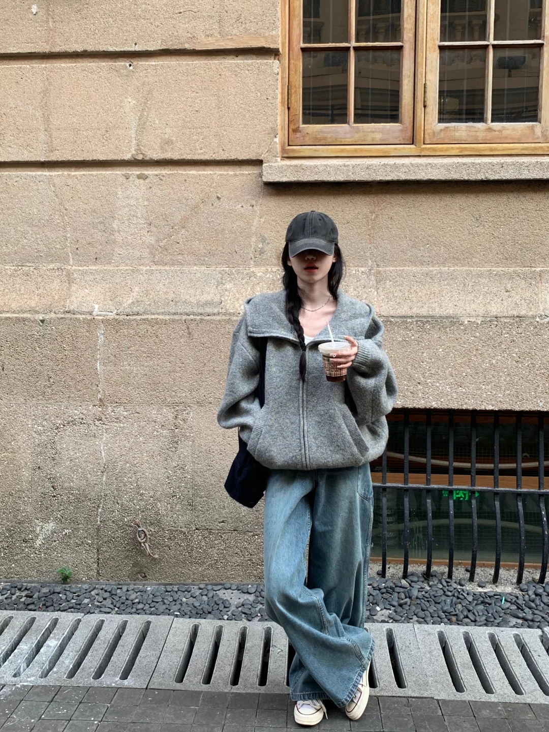 慵懶老錢風灰色連帽拉鍊毛衣外套女秋冬浣熊絨翻領針織衛衣開衫厚