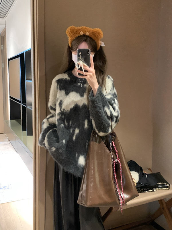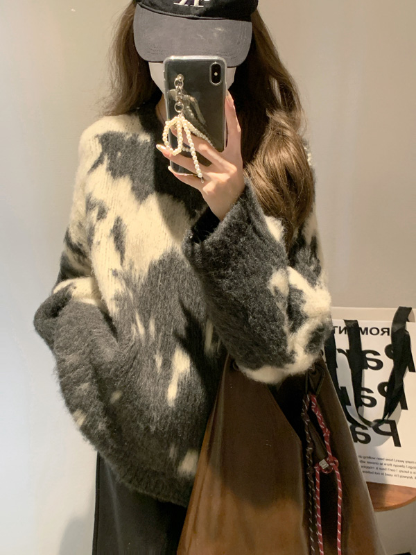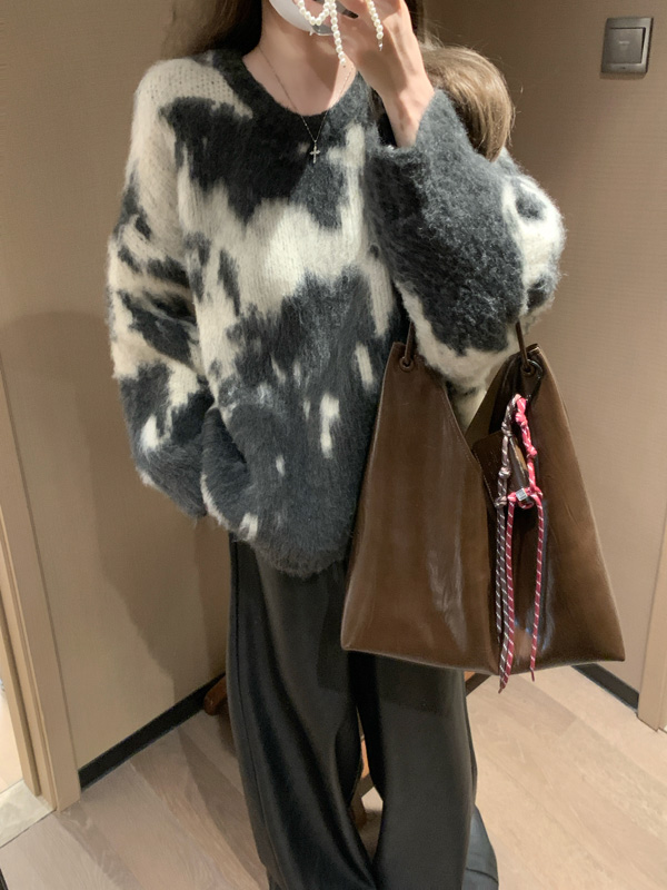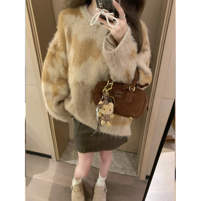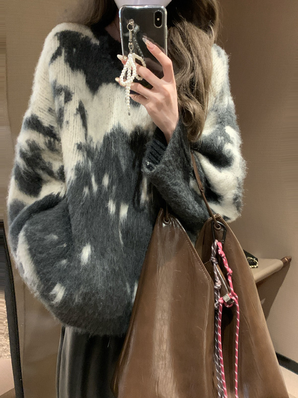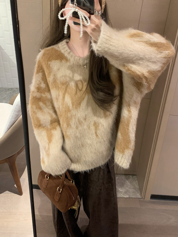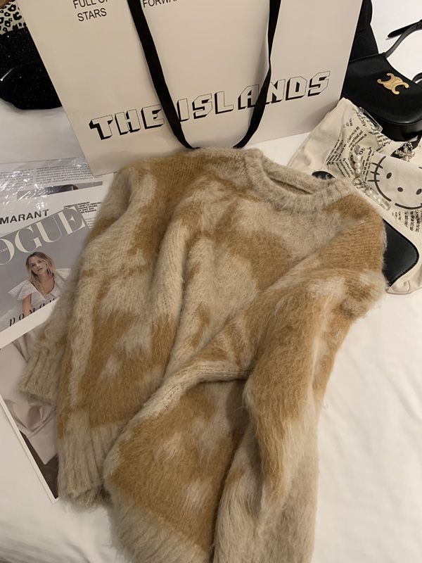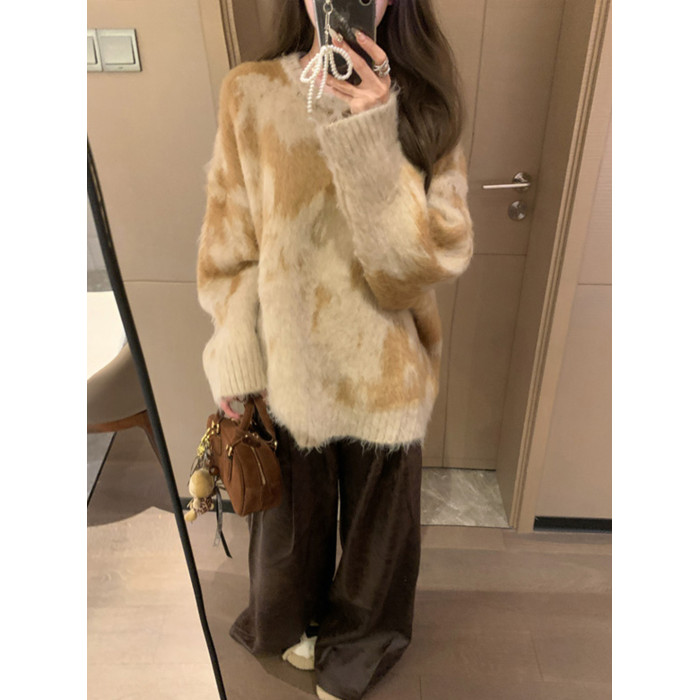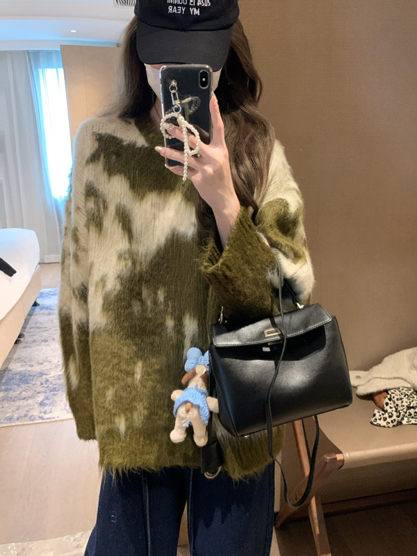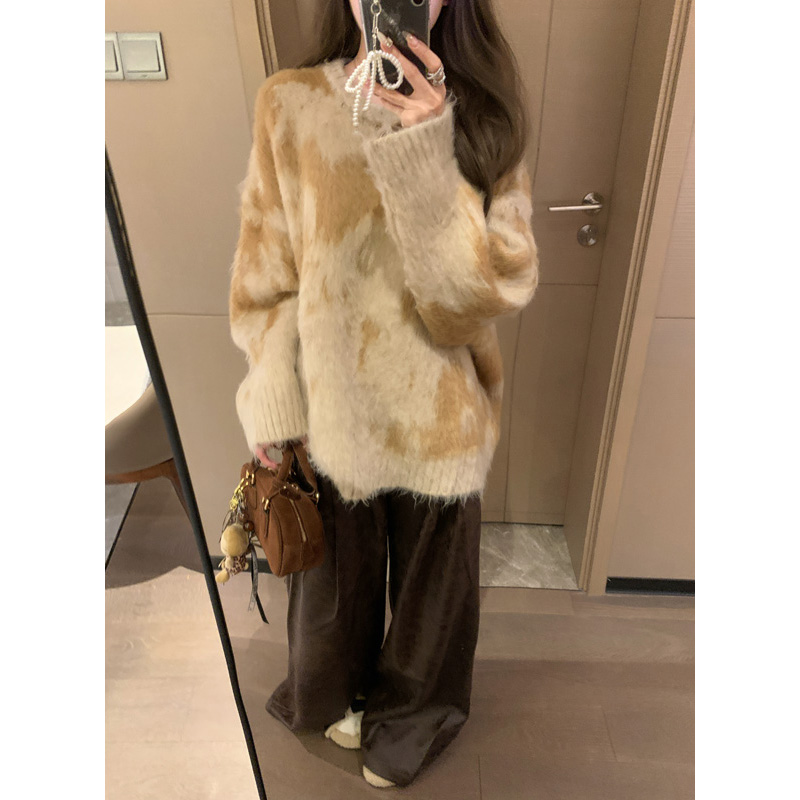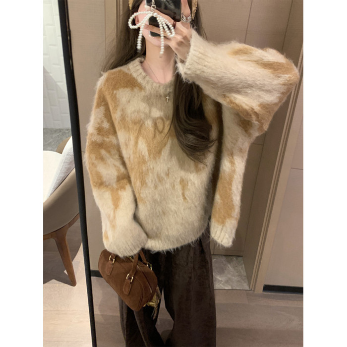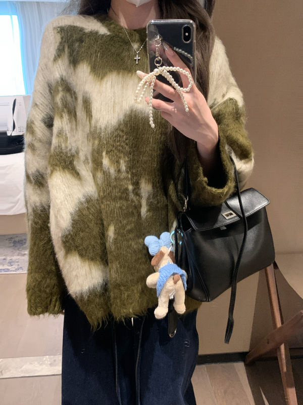 慵懶風暈染圓領馬海毛毛衣女秋冬寬松軟糯奶呼呼套頭針織衫上衣