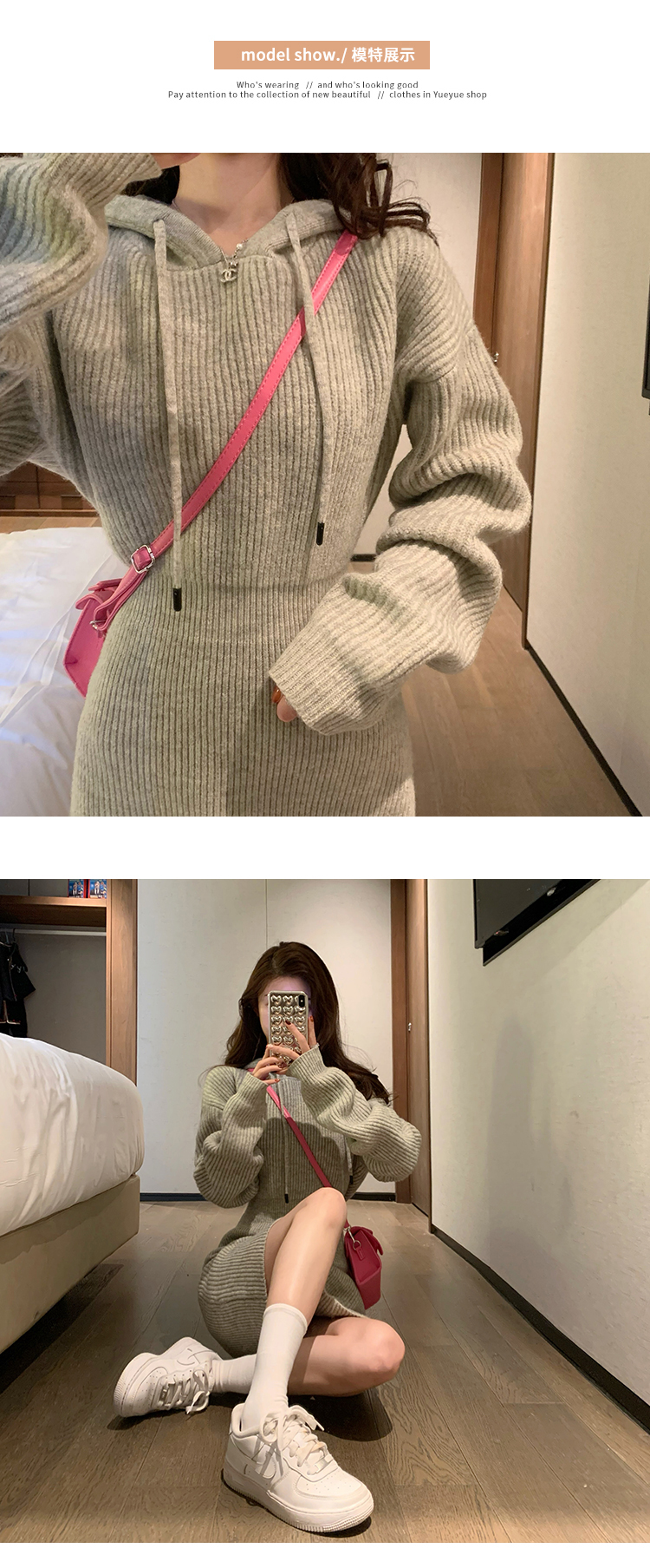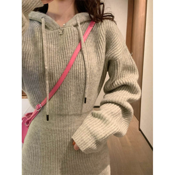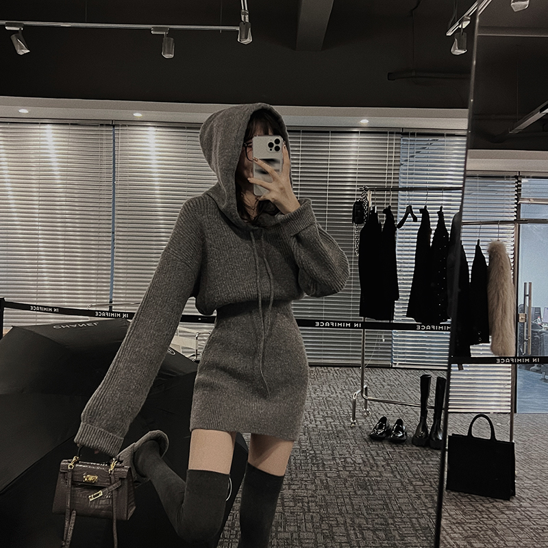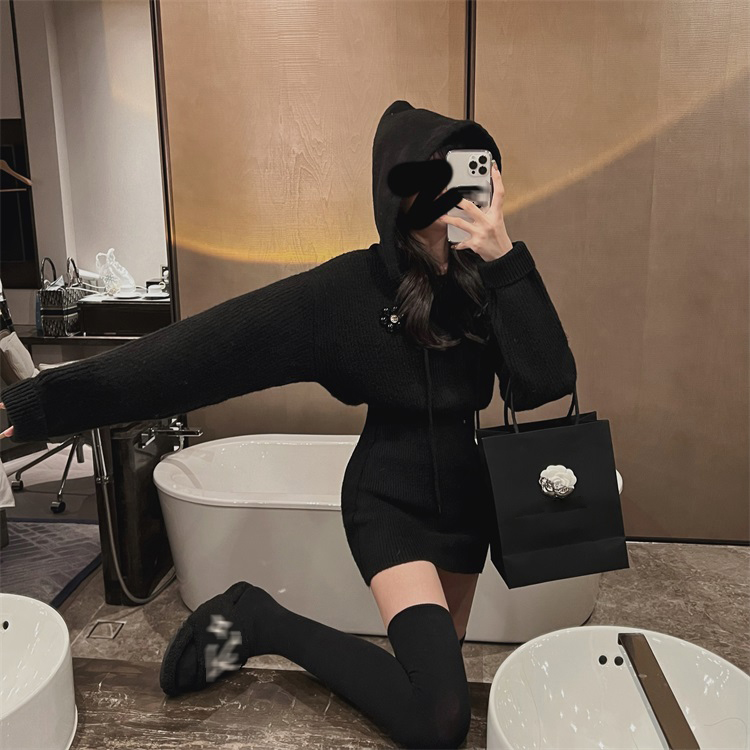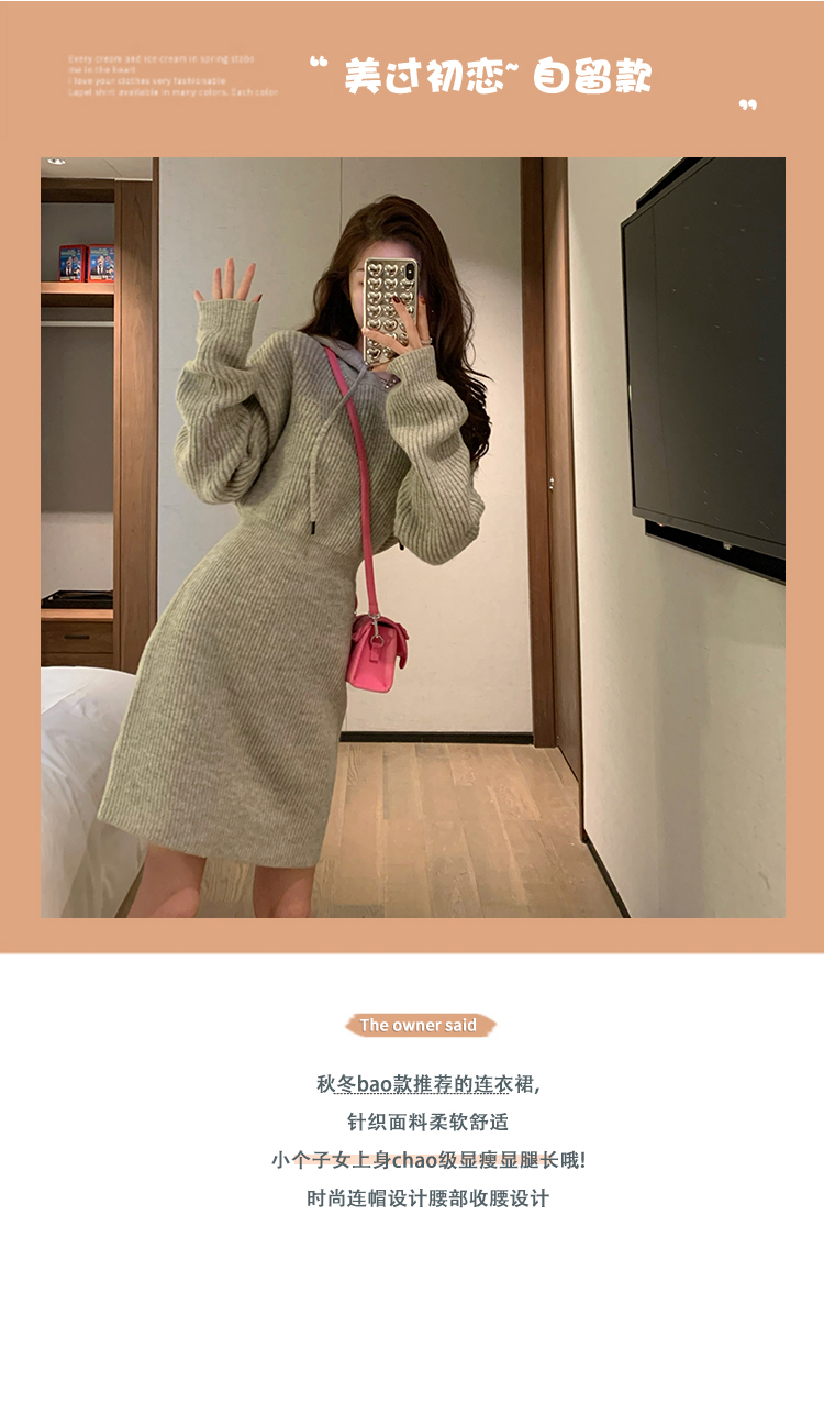 法式復古連帽加厚針織毛衣連衣裙女冬季2025新款減齡包臀短款裙子