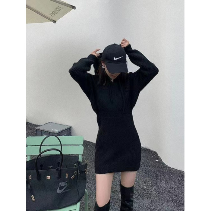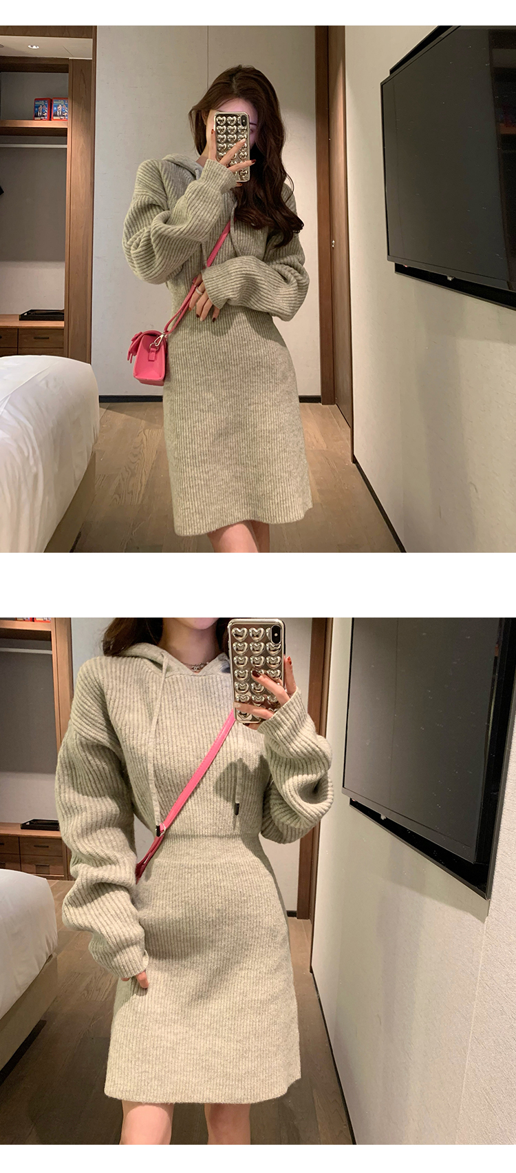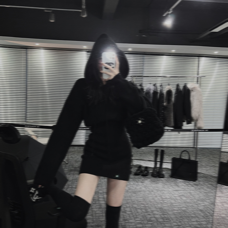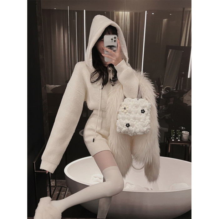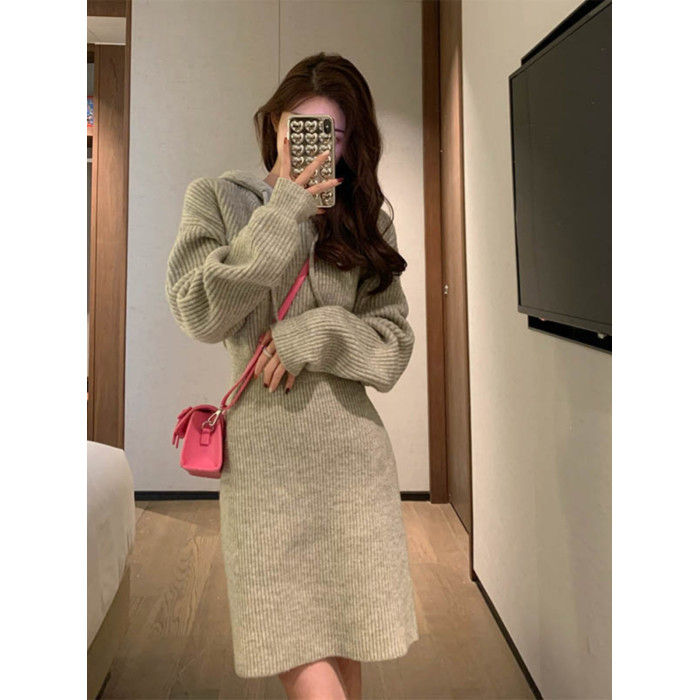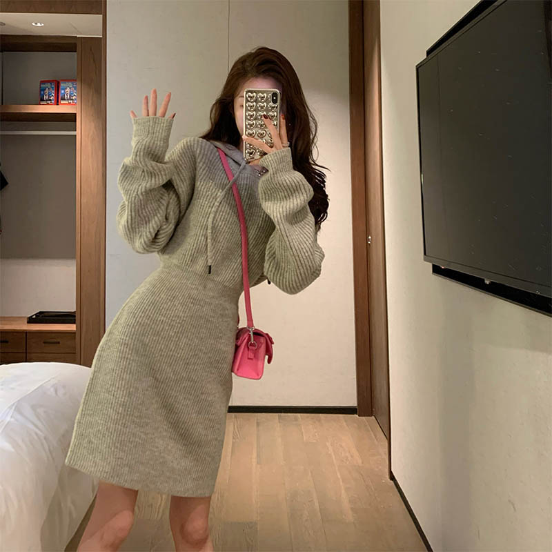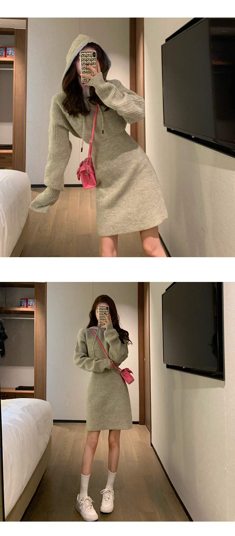 法式復古連帽加厚針織毛衣連衣裙女冬季2025新款減齡包臀短款裙子