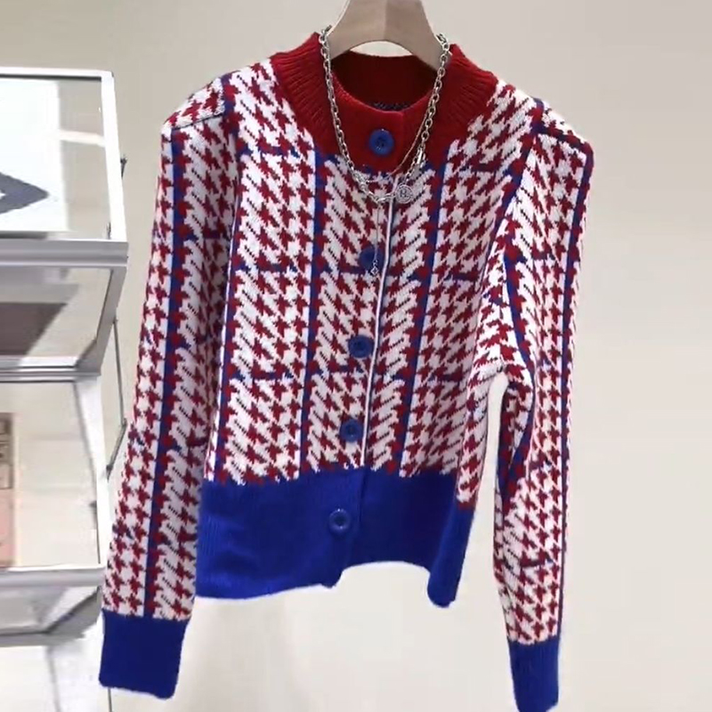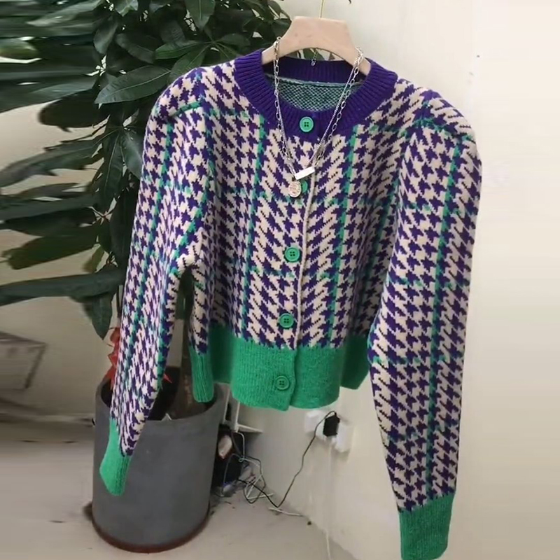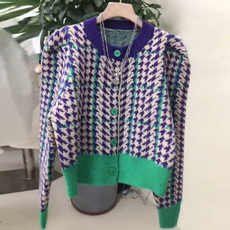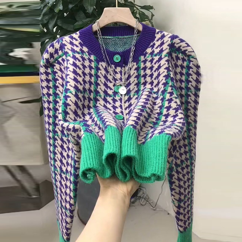 千鳥格設計感圓領毛衣女開衫2021秋冬季新款撞色小香風針織外套