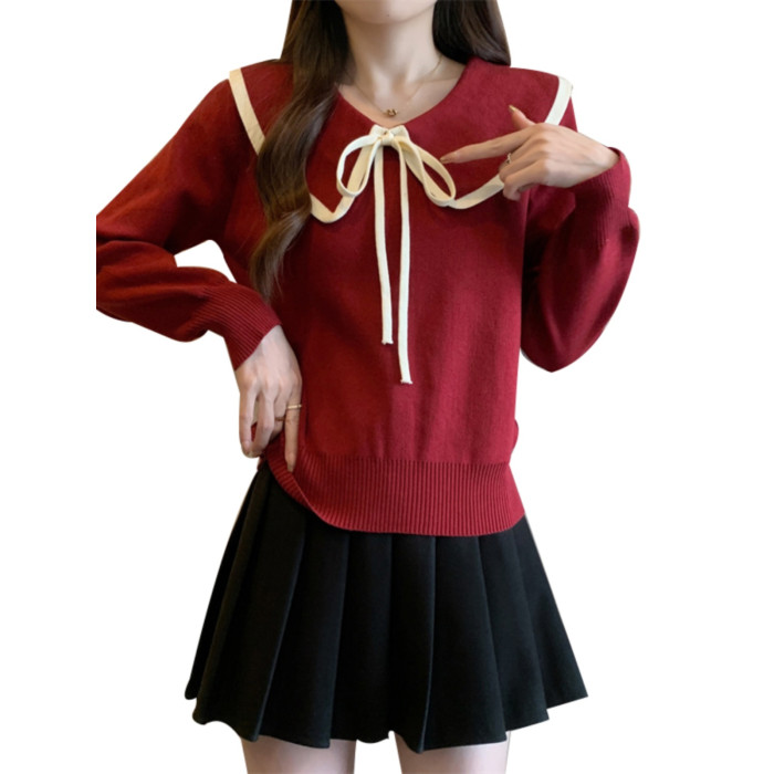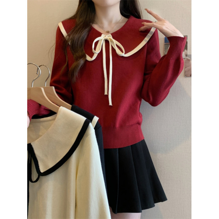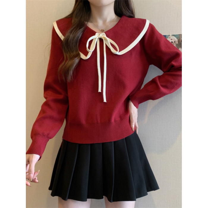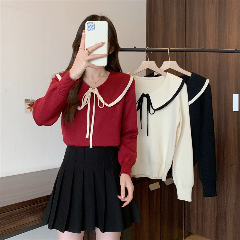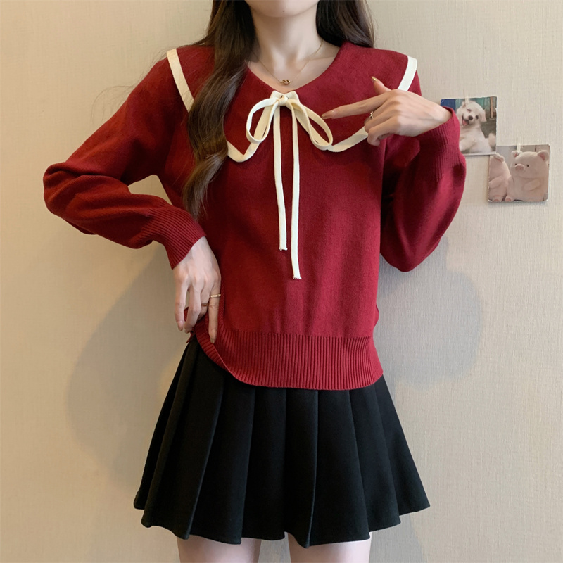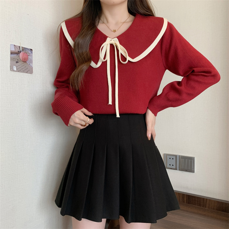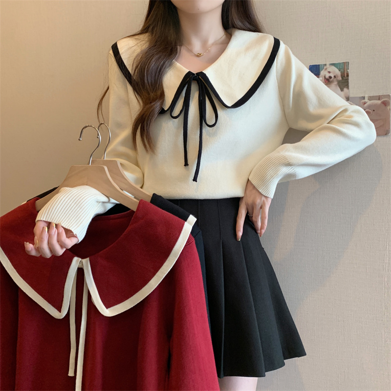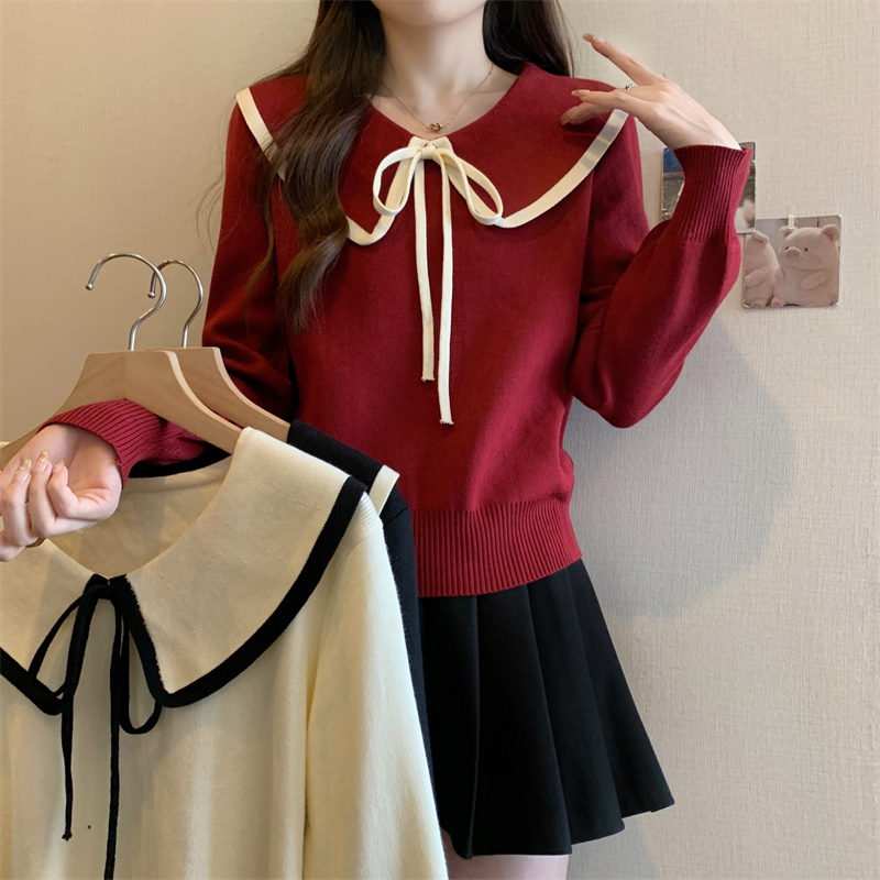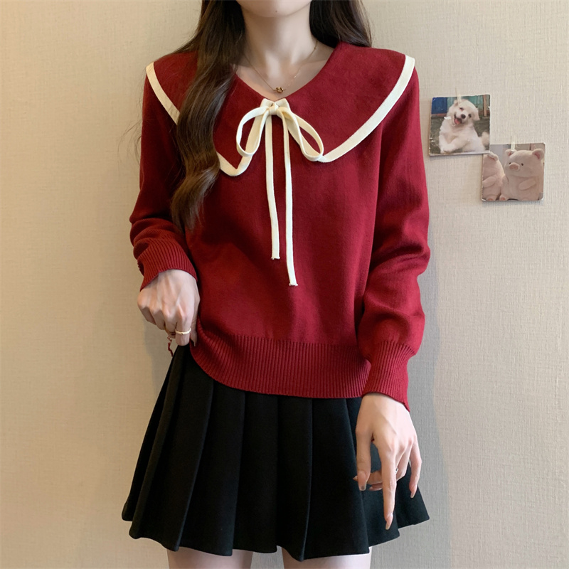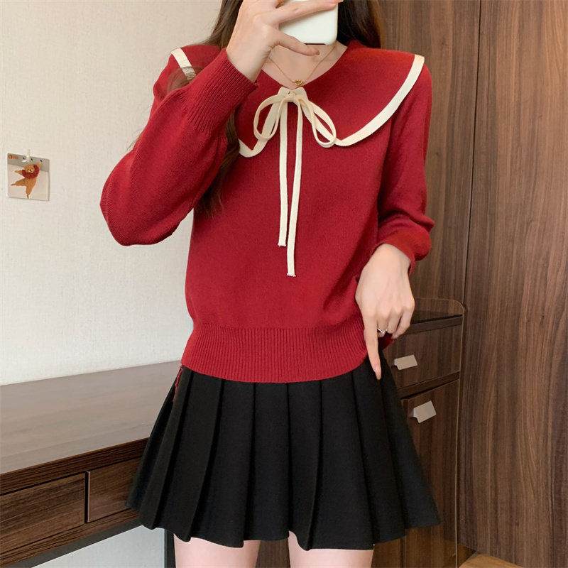 秋冬新款大碼女裝胖mm顯瘦遮肉洋氣娃娃領毛衣新年紅色打底針織衫