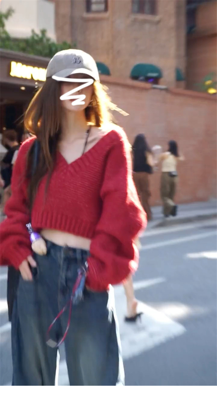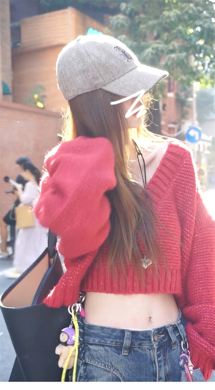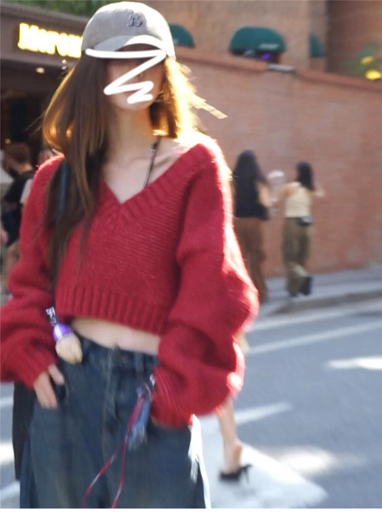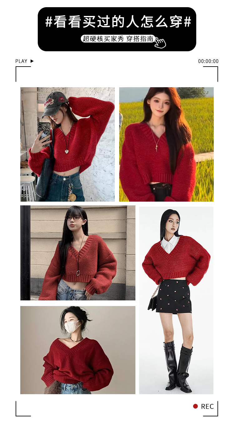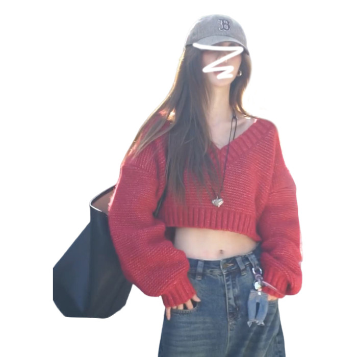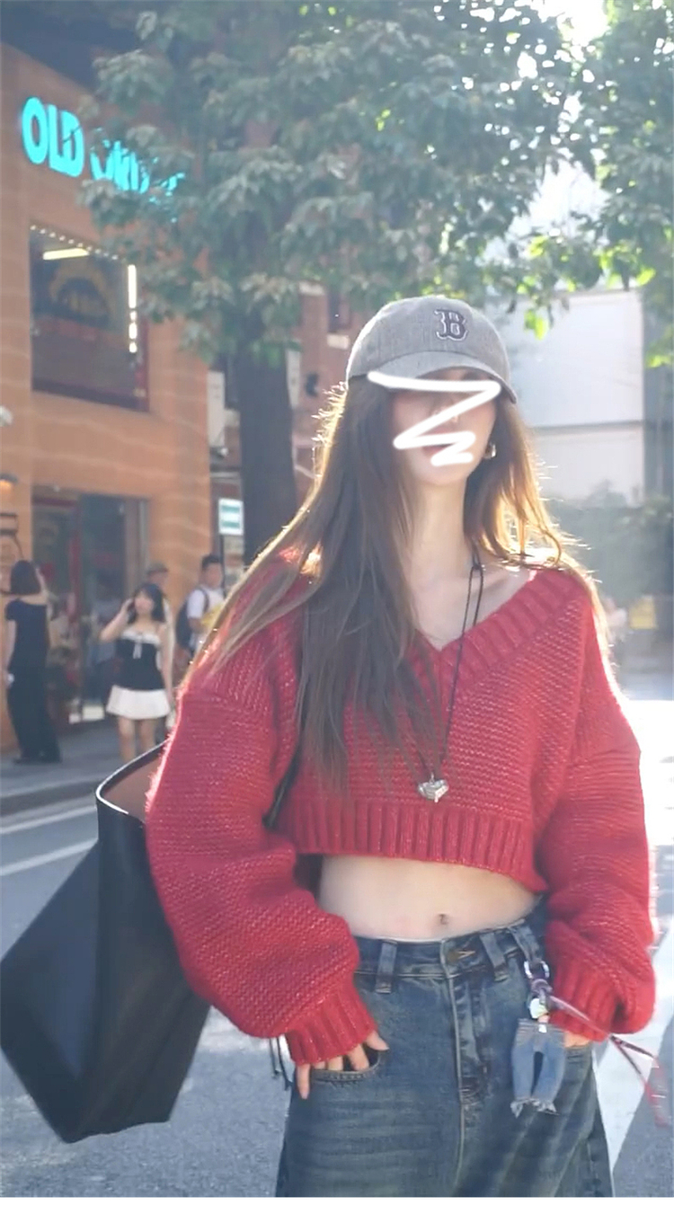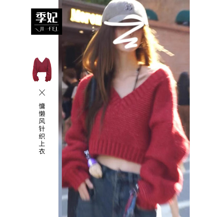 復古紅色v領毛衣女秋冬季2025新款慵懶風高級感寬松短款針織上衣