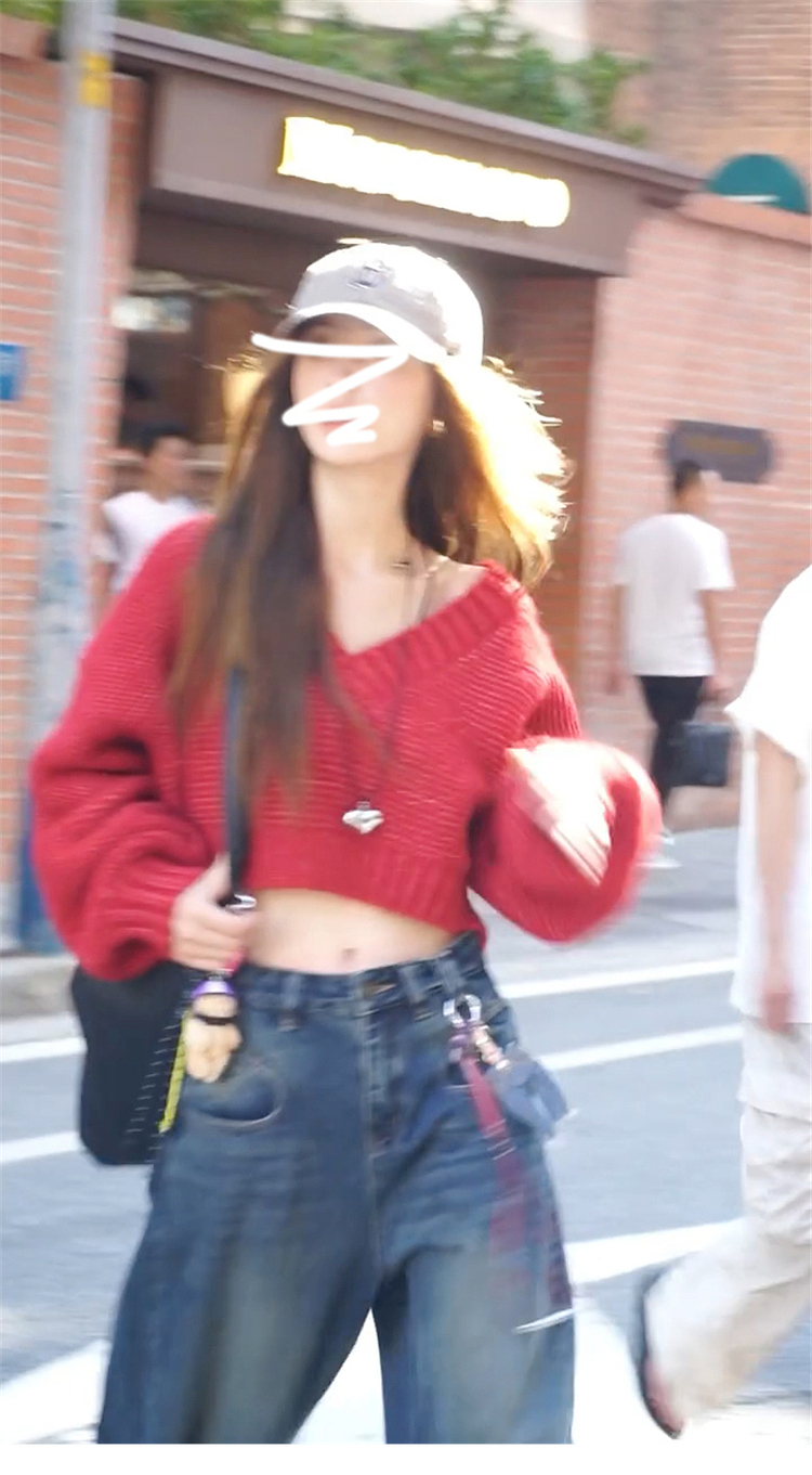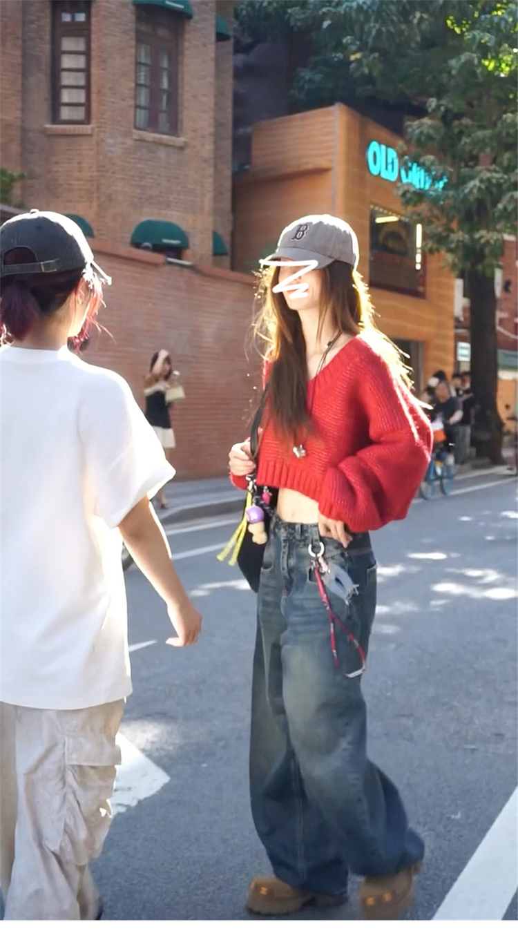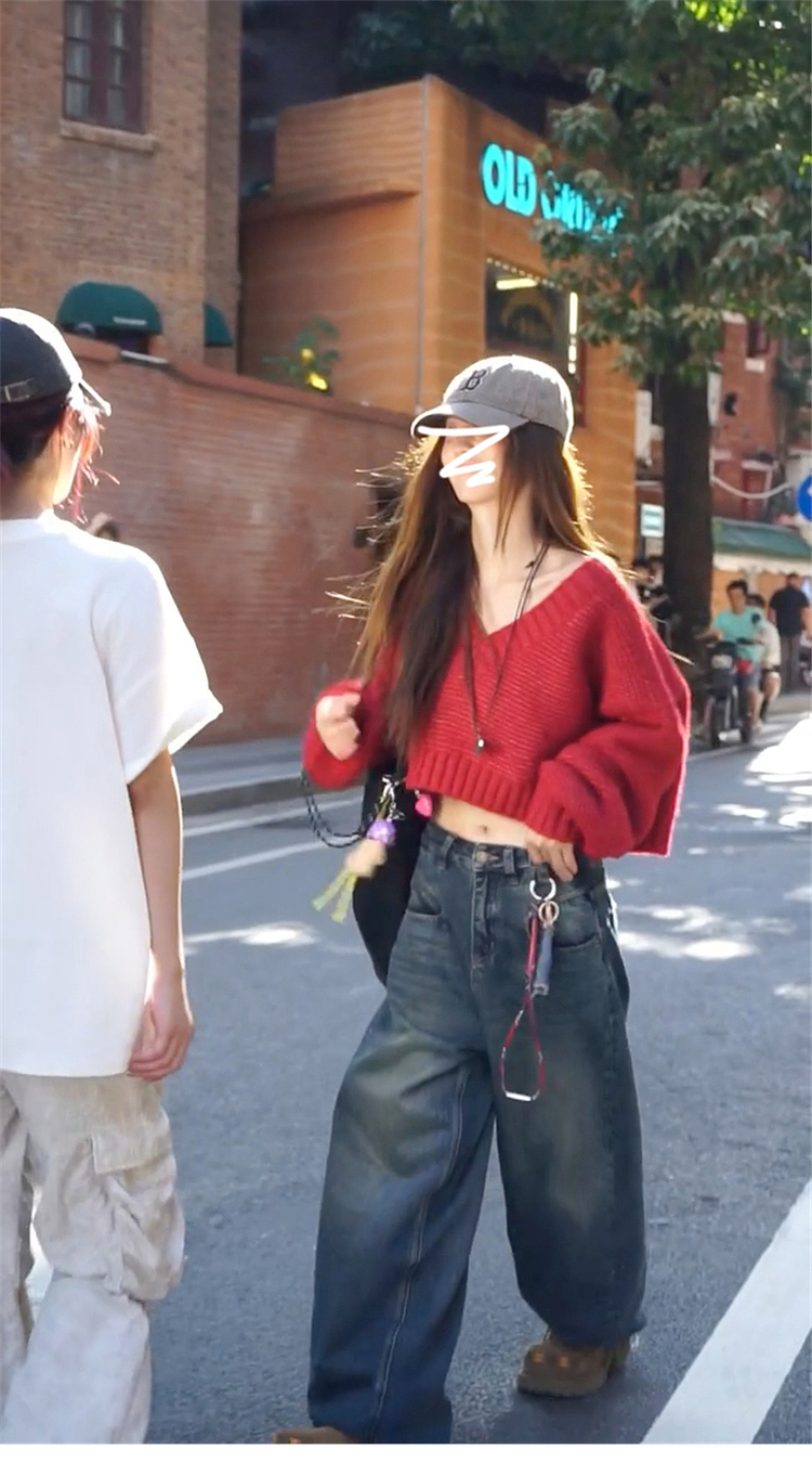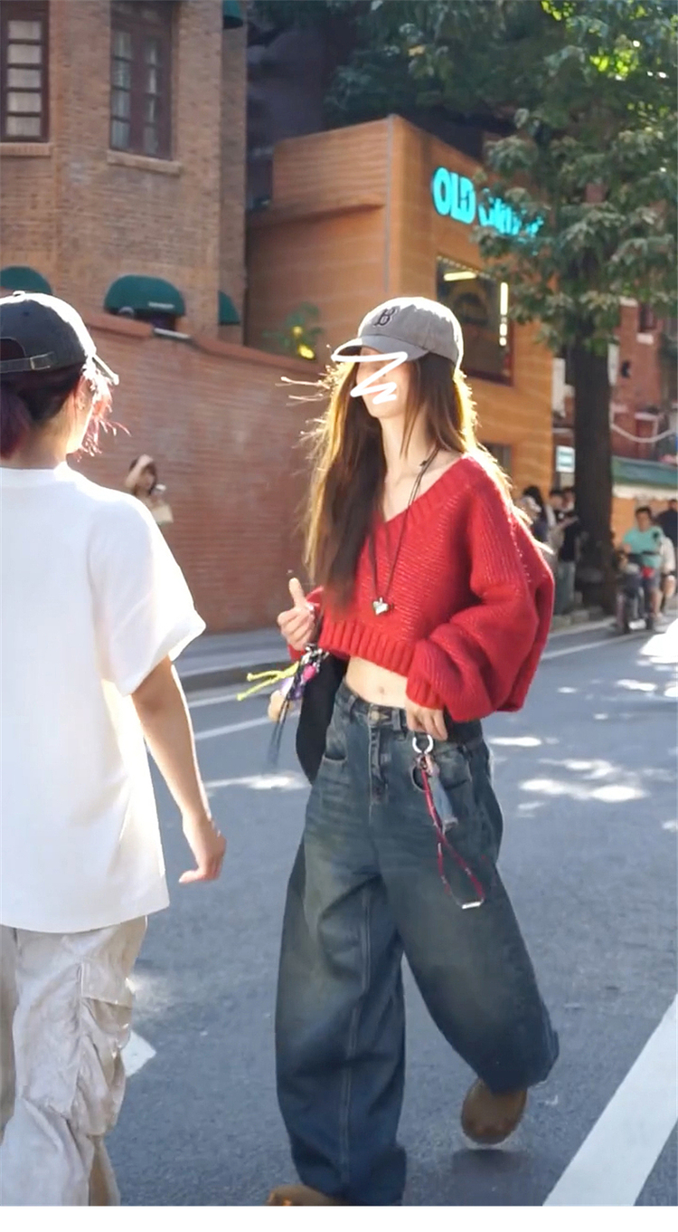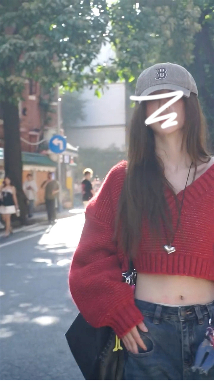 復古紅色v領毛衣女秋冬季2025新款慵懶風高級感寬松短款針織上衣