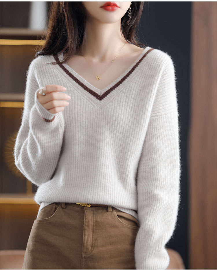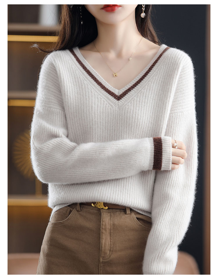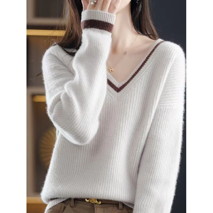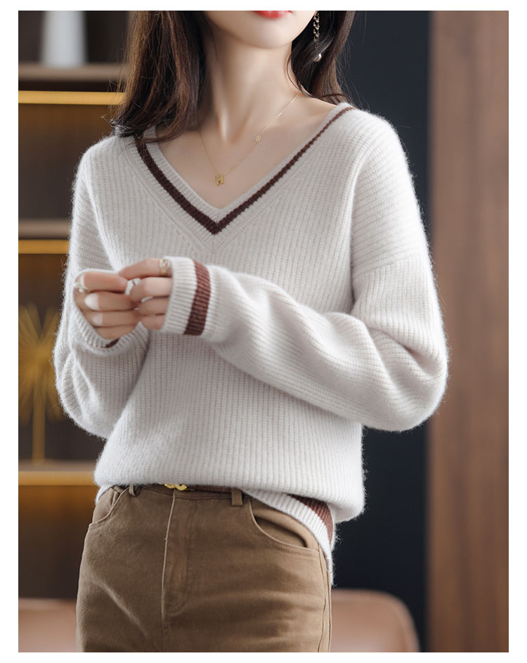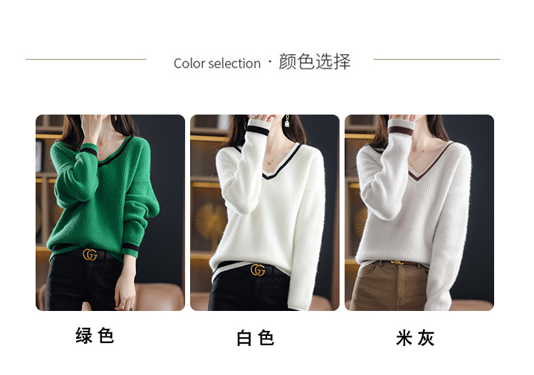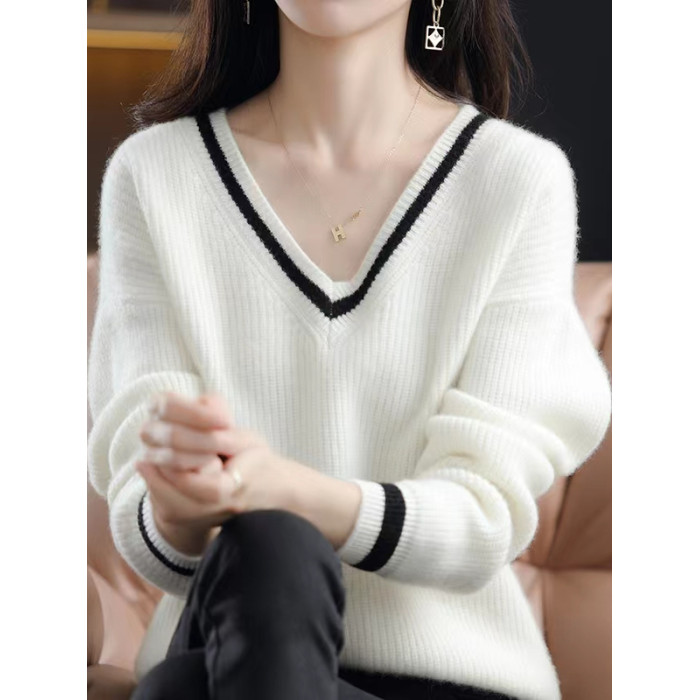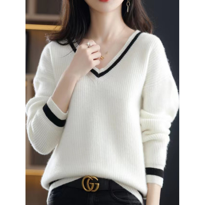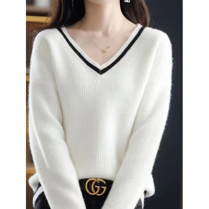秋冬新款羊絨衫洋氣百搭v領女士毛衣拼色寬松外穿套頭針織打底衫
