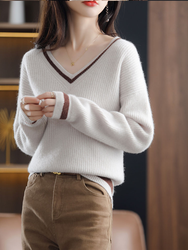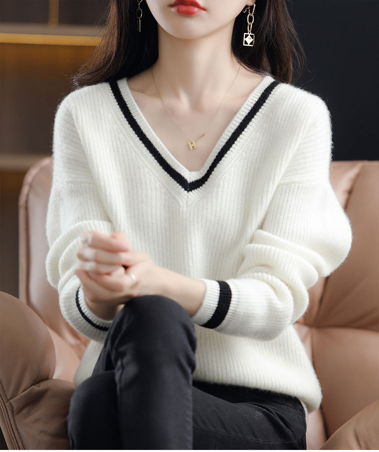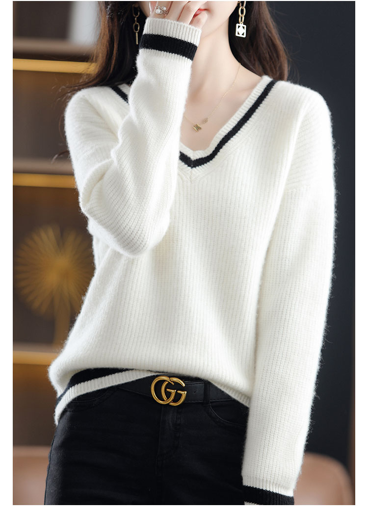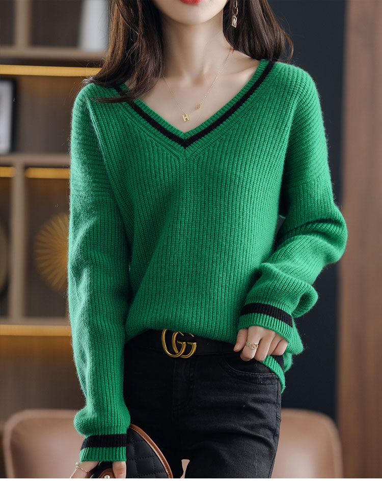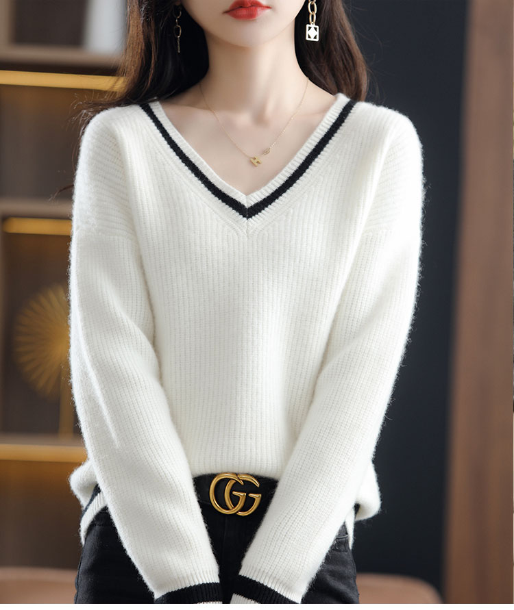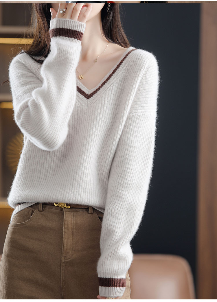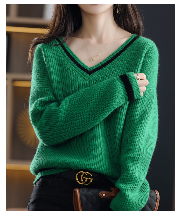 秋冬新款羊絨衫洋氣百搭v領女士毛衣拼色寬松外穿套頭針織打底衫