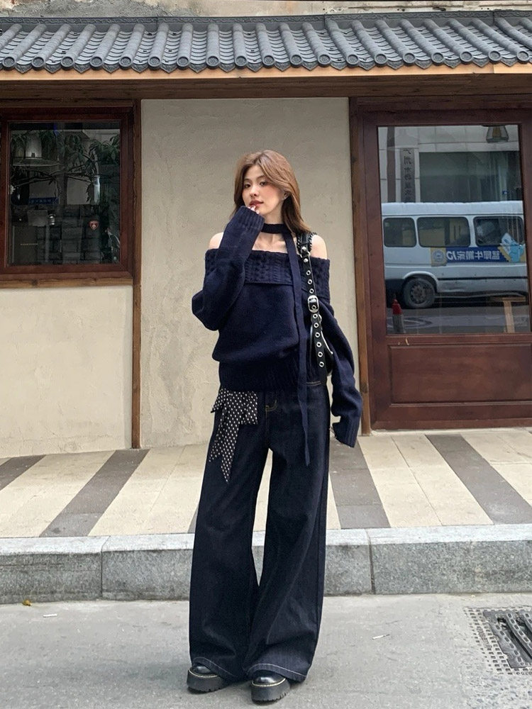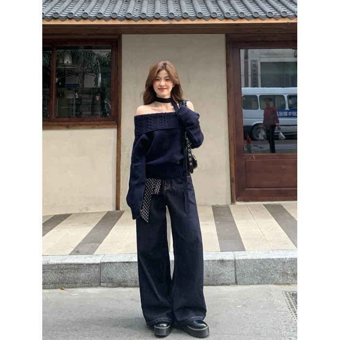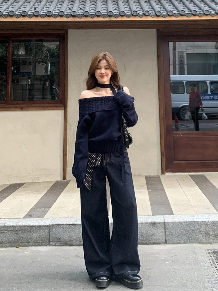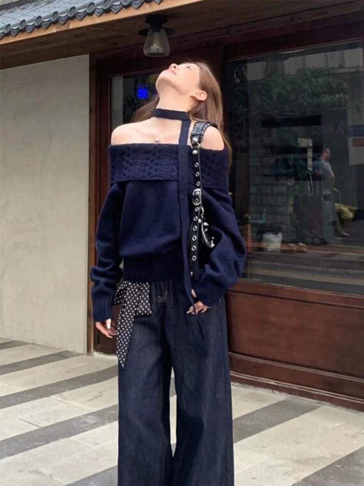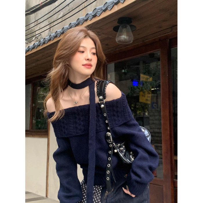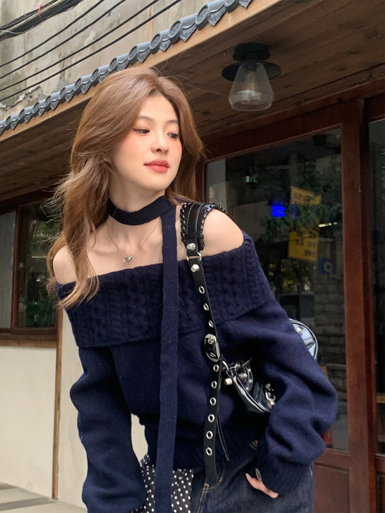 法式復古一字肩麻花掛脖毛衣女春秋氛圍感露肩針織衫顯瘦內搭上衣