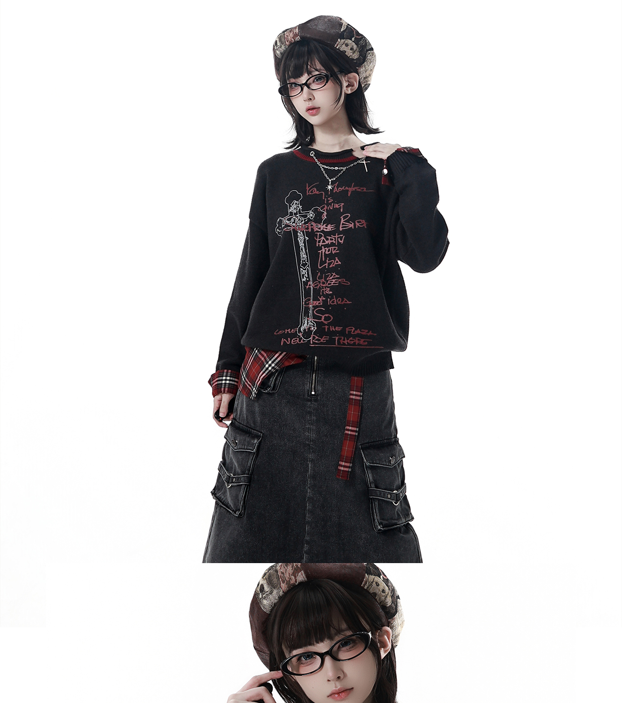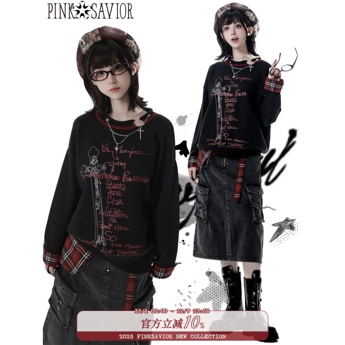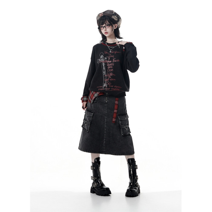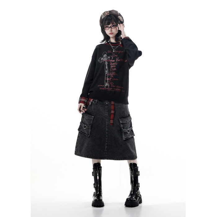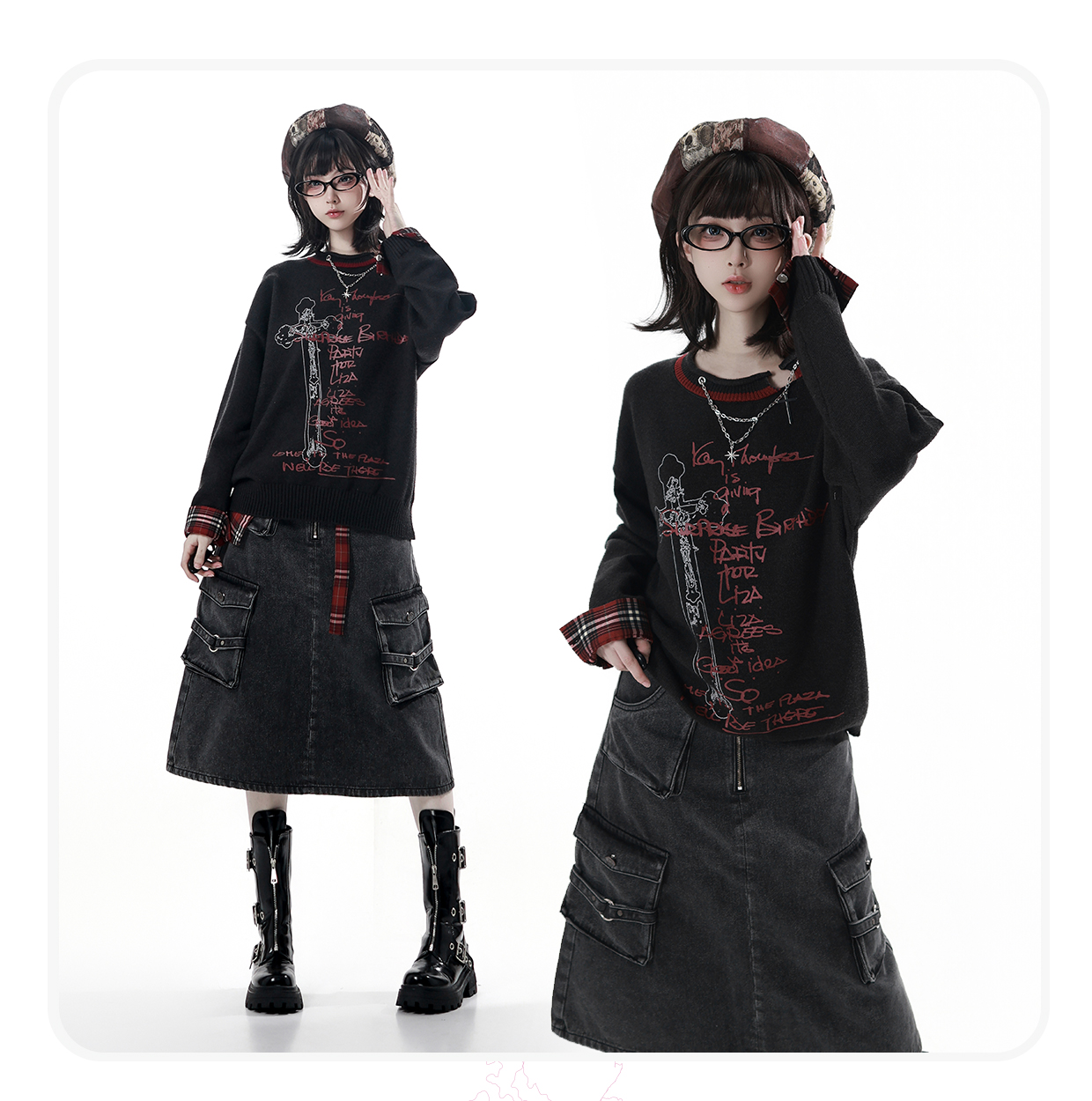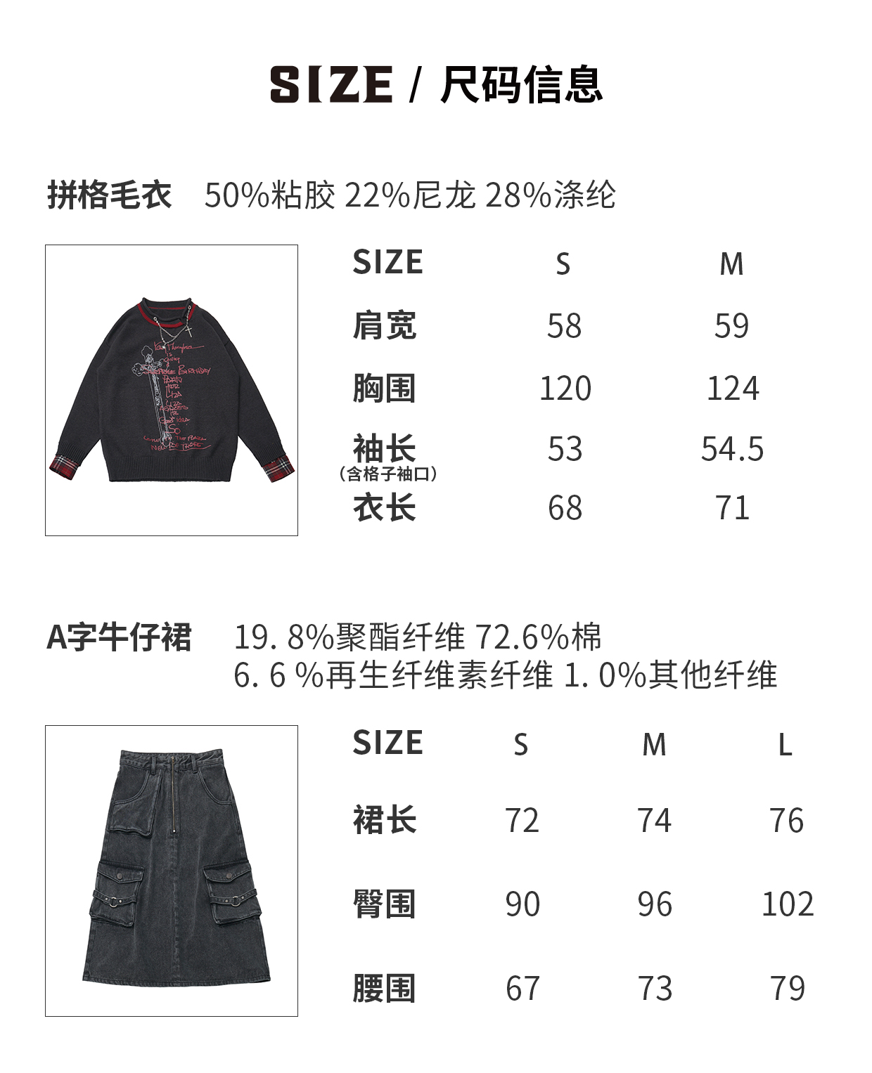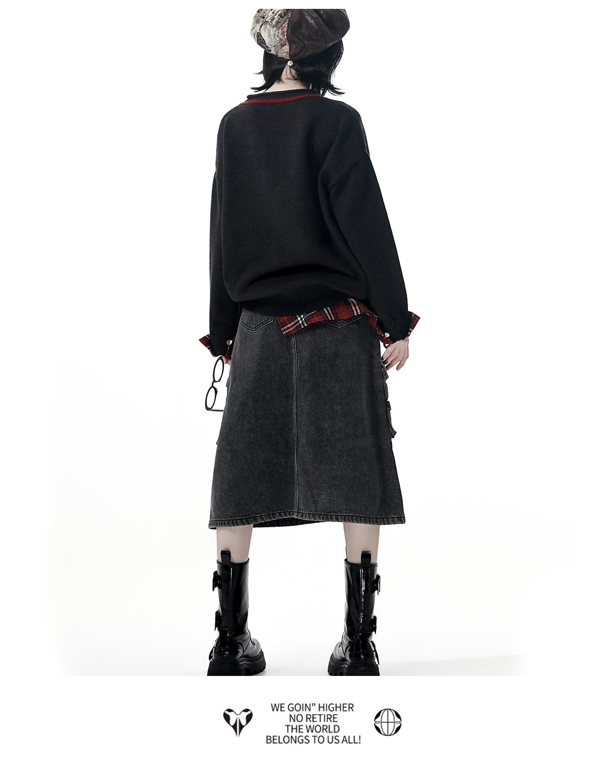 pinksavior【萬聖前夜】紅黑設計拼格毛衣柔軟牛仔半裙設計感秋冬