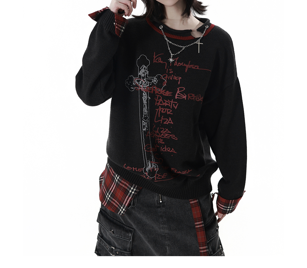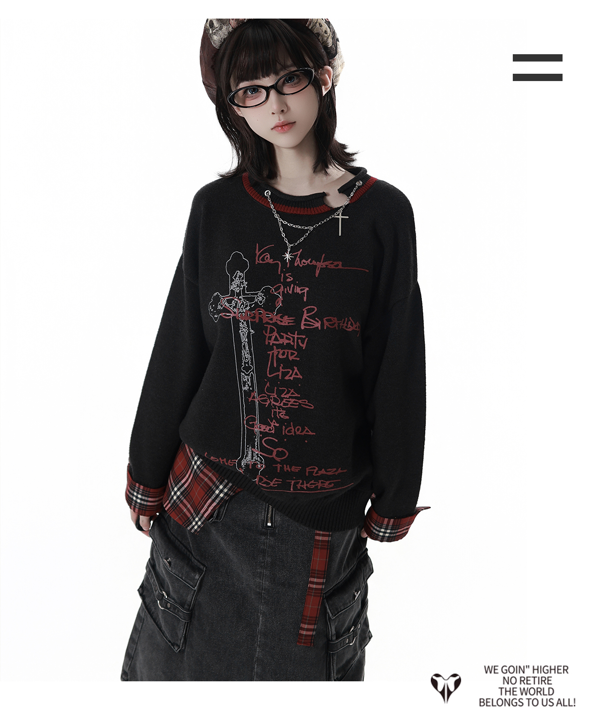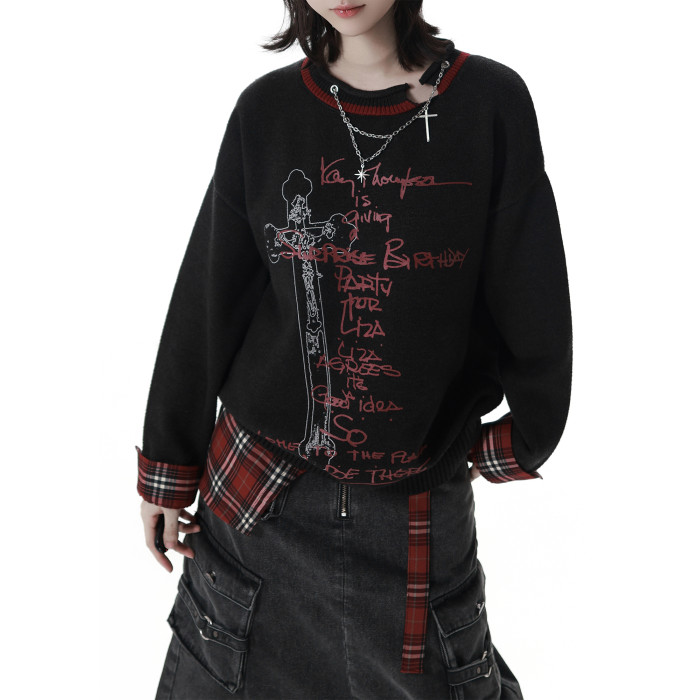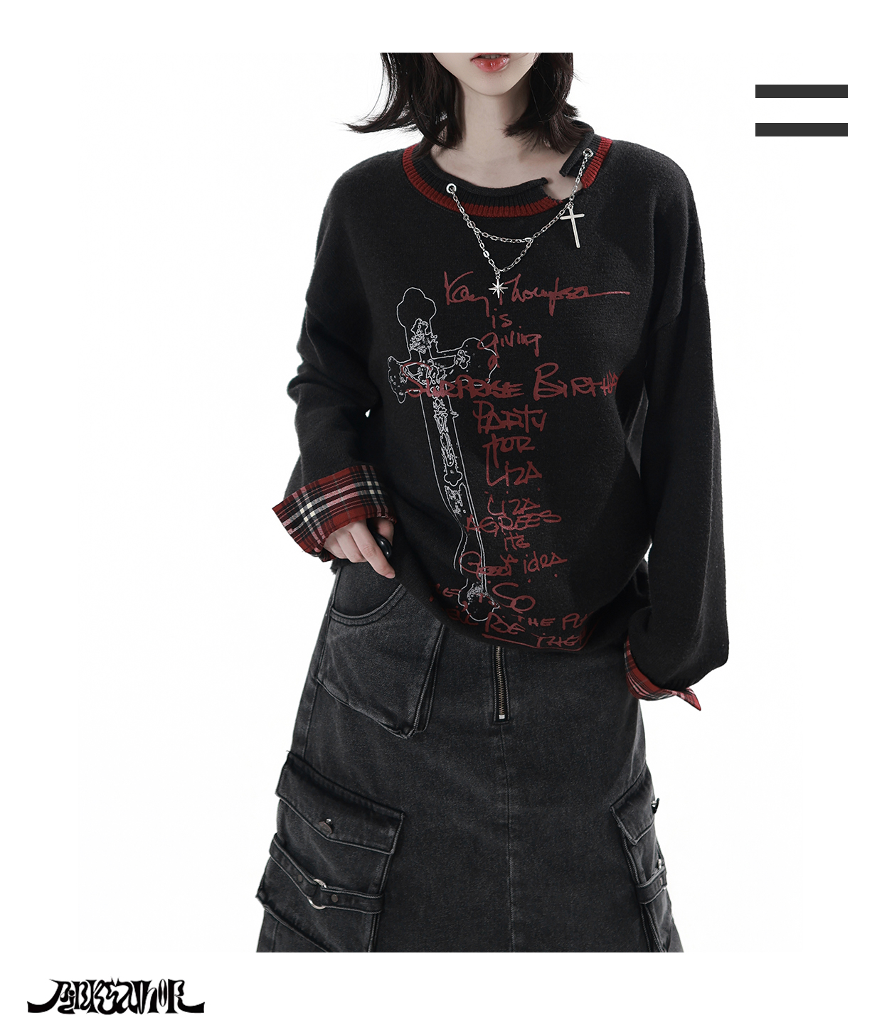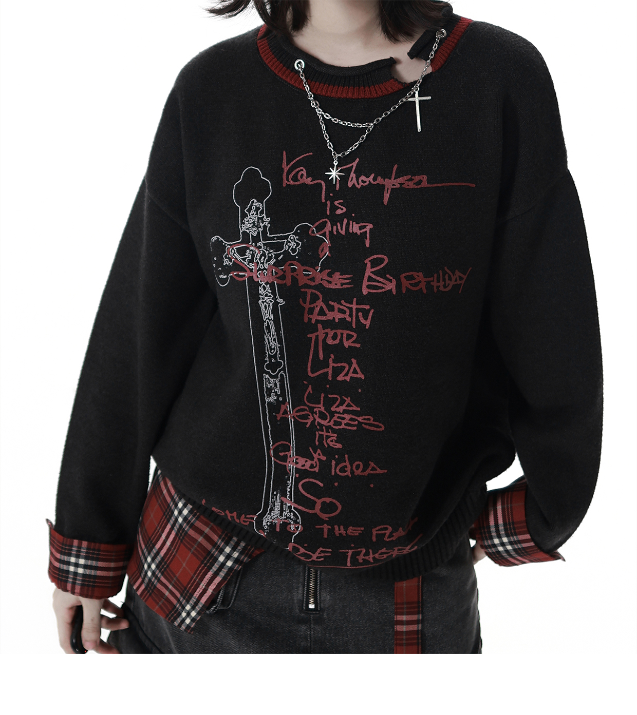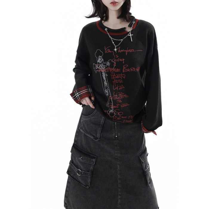 pinksavior【萬聖前夜】紅黑設計拼格毛衣柔軟牛仔半裙設計感秋冬